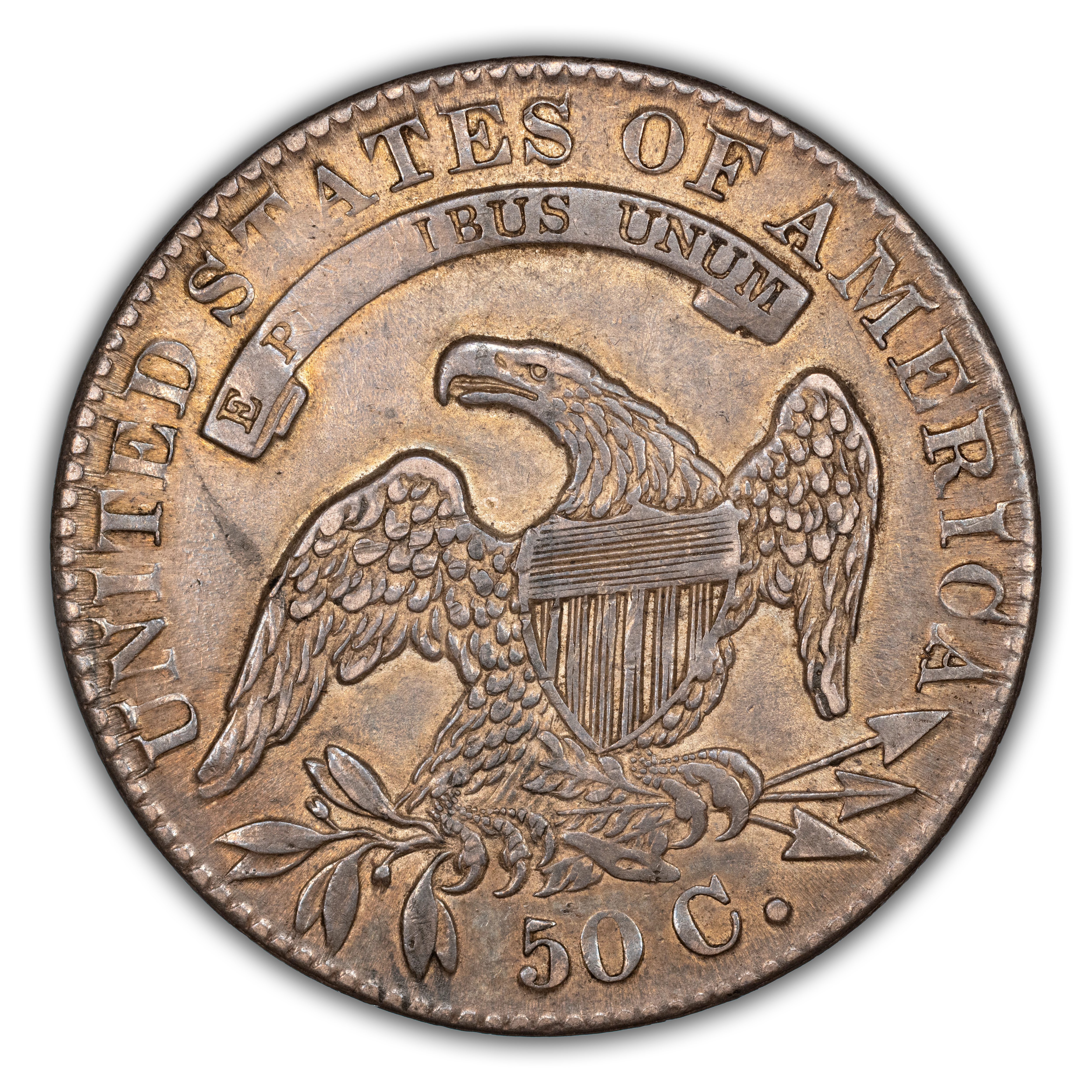 Reverse: An heraldic eagle holding olive branches and 3 arrows in its claws is surrounded by the words UNITED STATES OF AMERICA around the periphery. A ribbon below bears the motto E PLURIBUS UNUM. The denomination of 50C is centered below the eagle.
