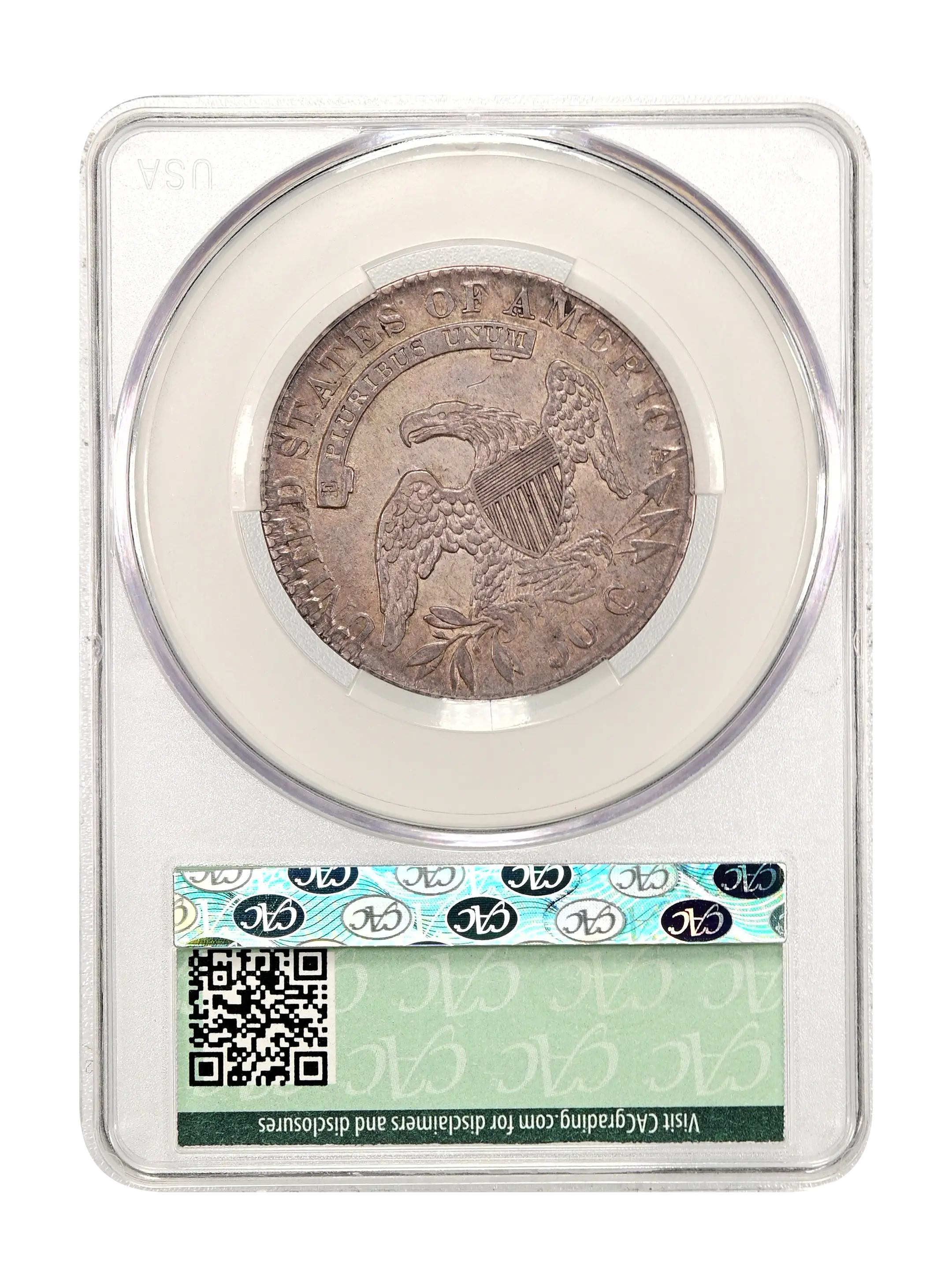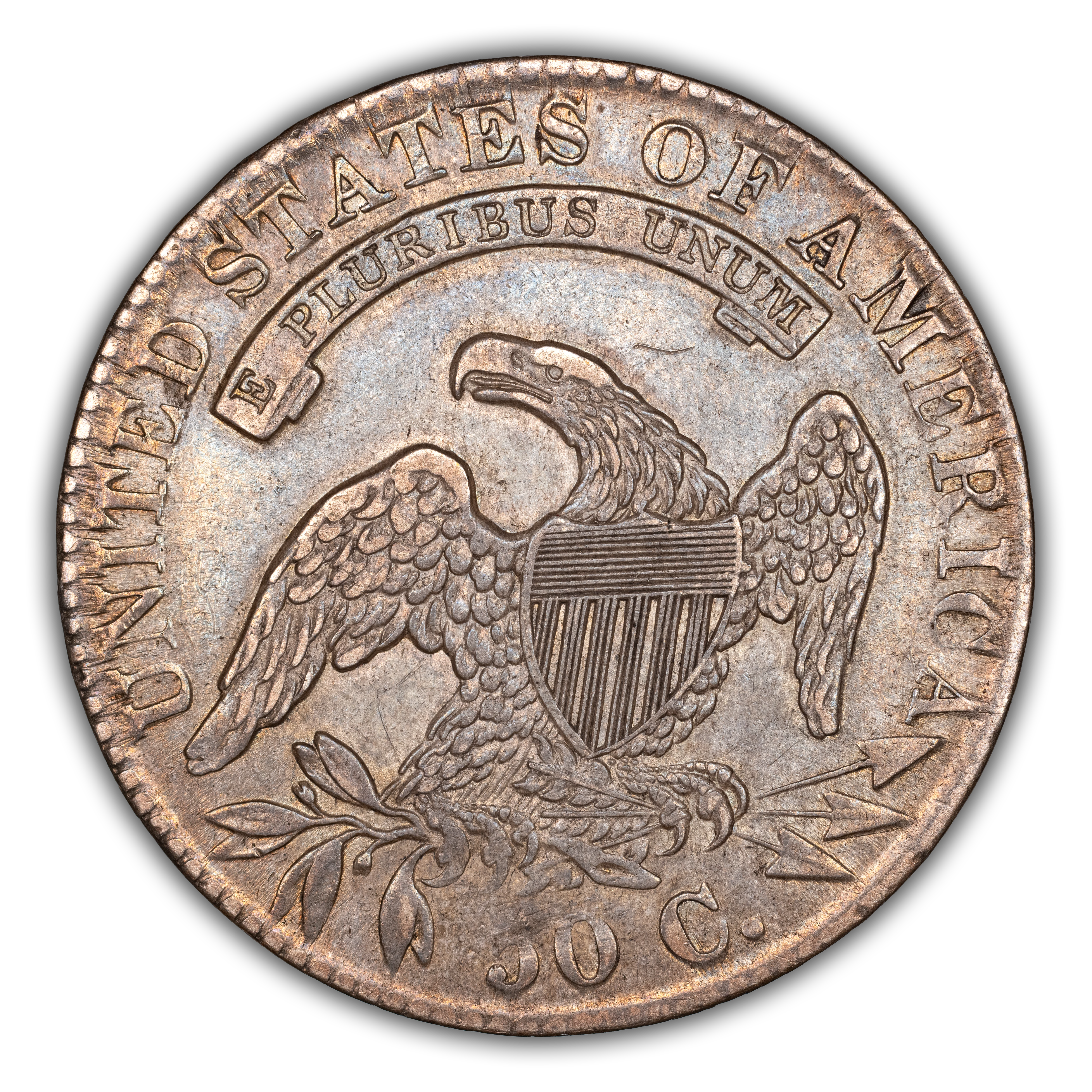 Reverse: An heraldic eagle holding olive branches and 3 arrows in its claws is surrounded by the words UNITED STATES OF AMERICA around the periphery. A ribbon below bears the motto E PLURIBUS UNUM. The denomination of 50C is centered below the eagle.