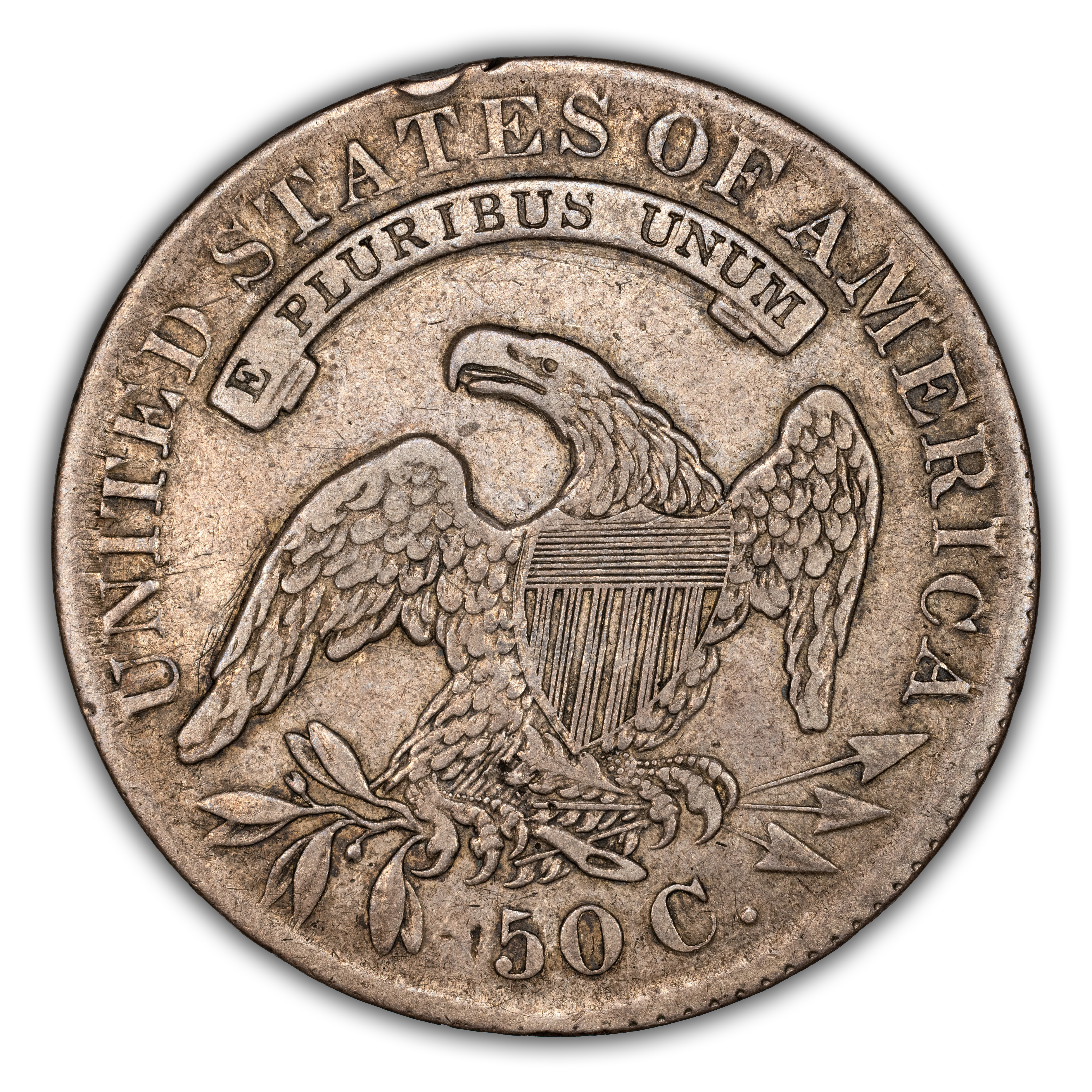 Reverse: An heraldic eagle holding olive branches and 3 arrows in its claws is surrounded by the words UNITED STATES OF AMERICA around the periphery. A ribbon below bears the motto E PLURIBUS UNUM. The denomination of 50C is centered below the eagle.