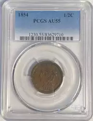 Reverse: The words UNITED STATES OF AMERICA around the periphery surround a wreath framing the words HALF CENT. The wreath is tied by a bow at the bottom.