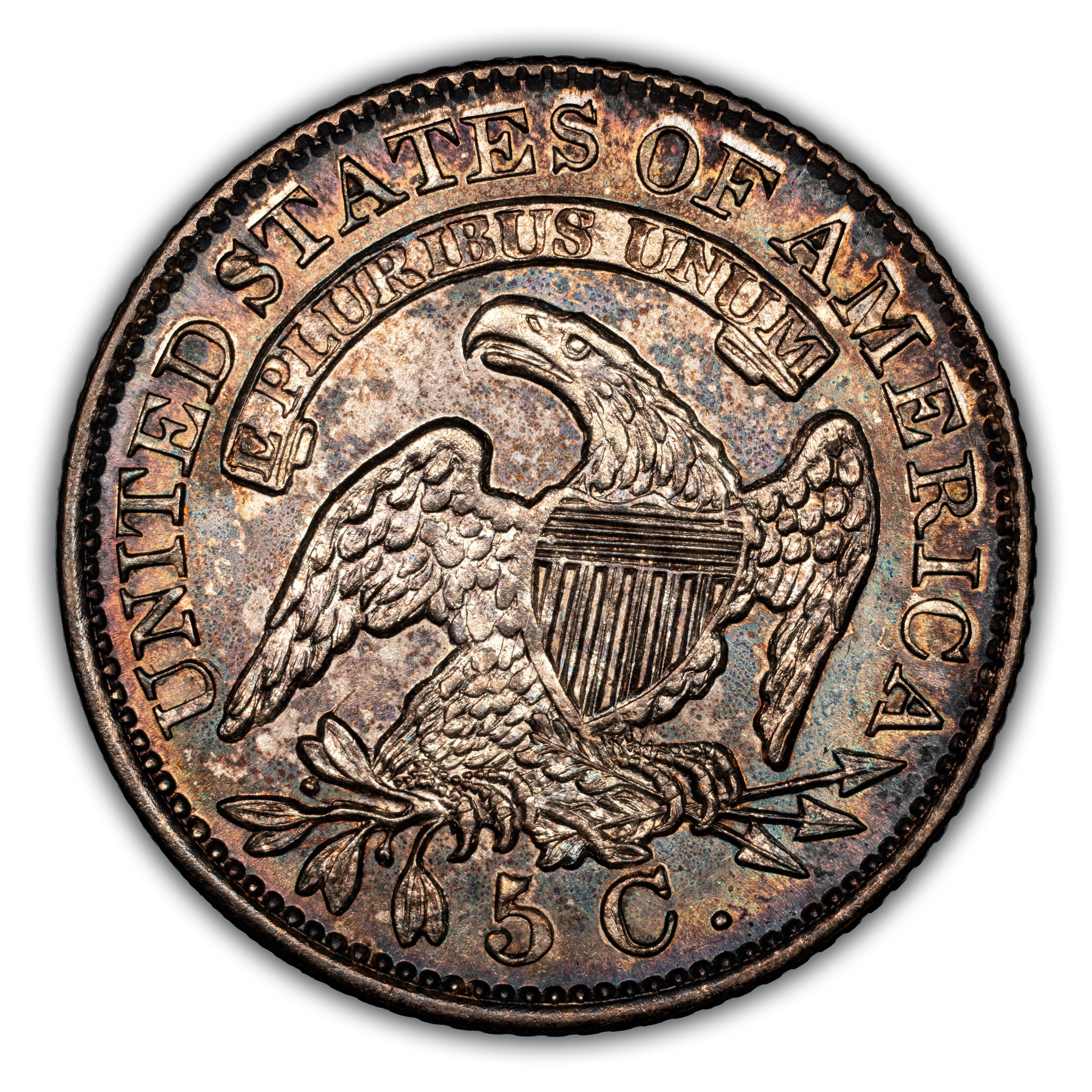 Reverse: An eagle is centered in the design with a shield over its chest, holding arrows and olive branches in its talons. A ribbon above bears the motto E PLURIBUS UNUM with UNITED STATES OF AMERICA around the periphery. The denomination listed as "5C." appears at the bottom.