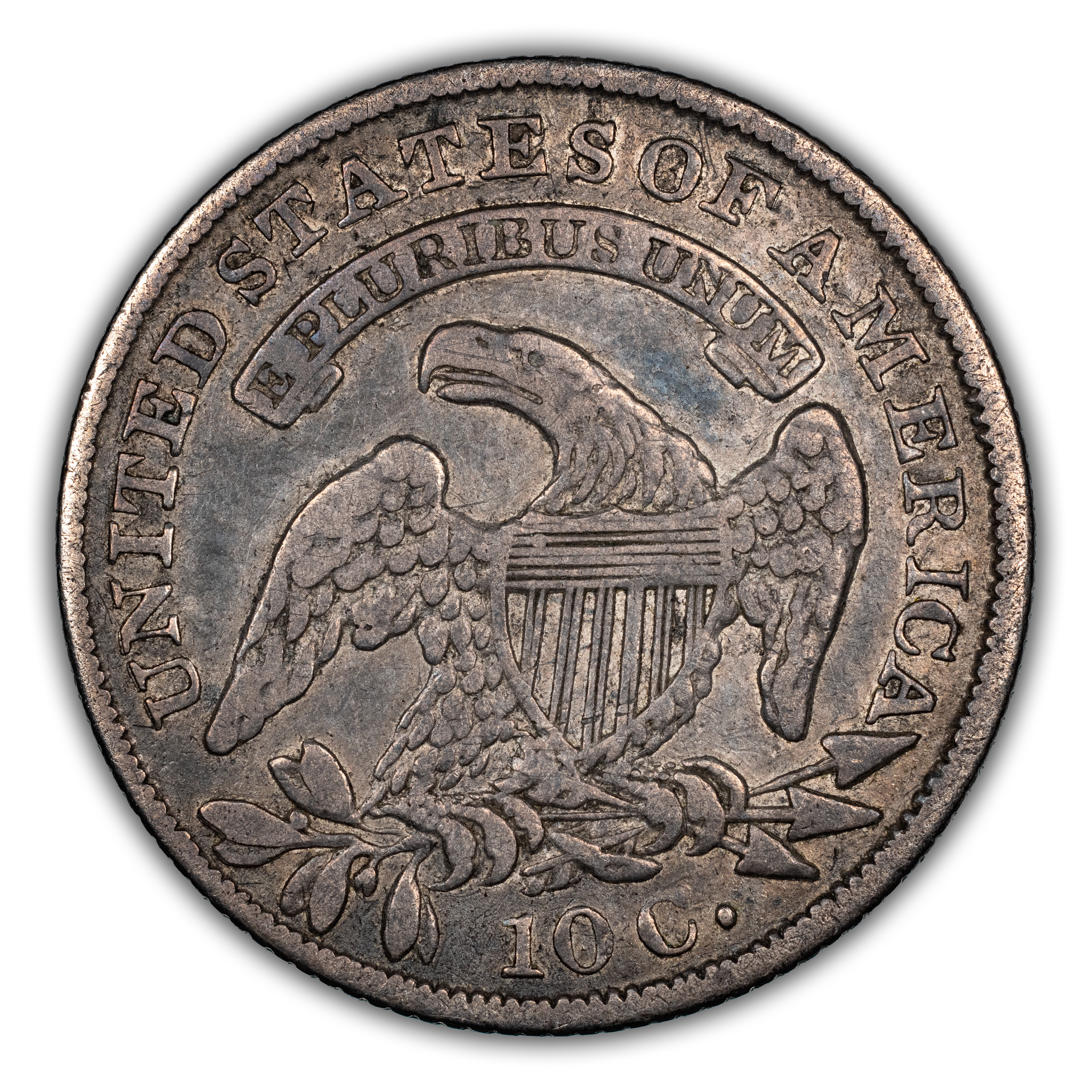 Reverse: An eagle is centered in the design with a shield over its chest, holding arrows and olive branches in its talons. A ribbon above bears the motto E PLURIBUS UNUM with UNITED STATES OF AMERICA around the periphery. The denomination listed as "10 C." appears at the bottom.