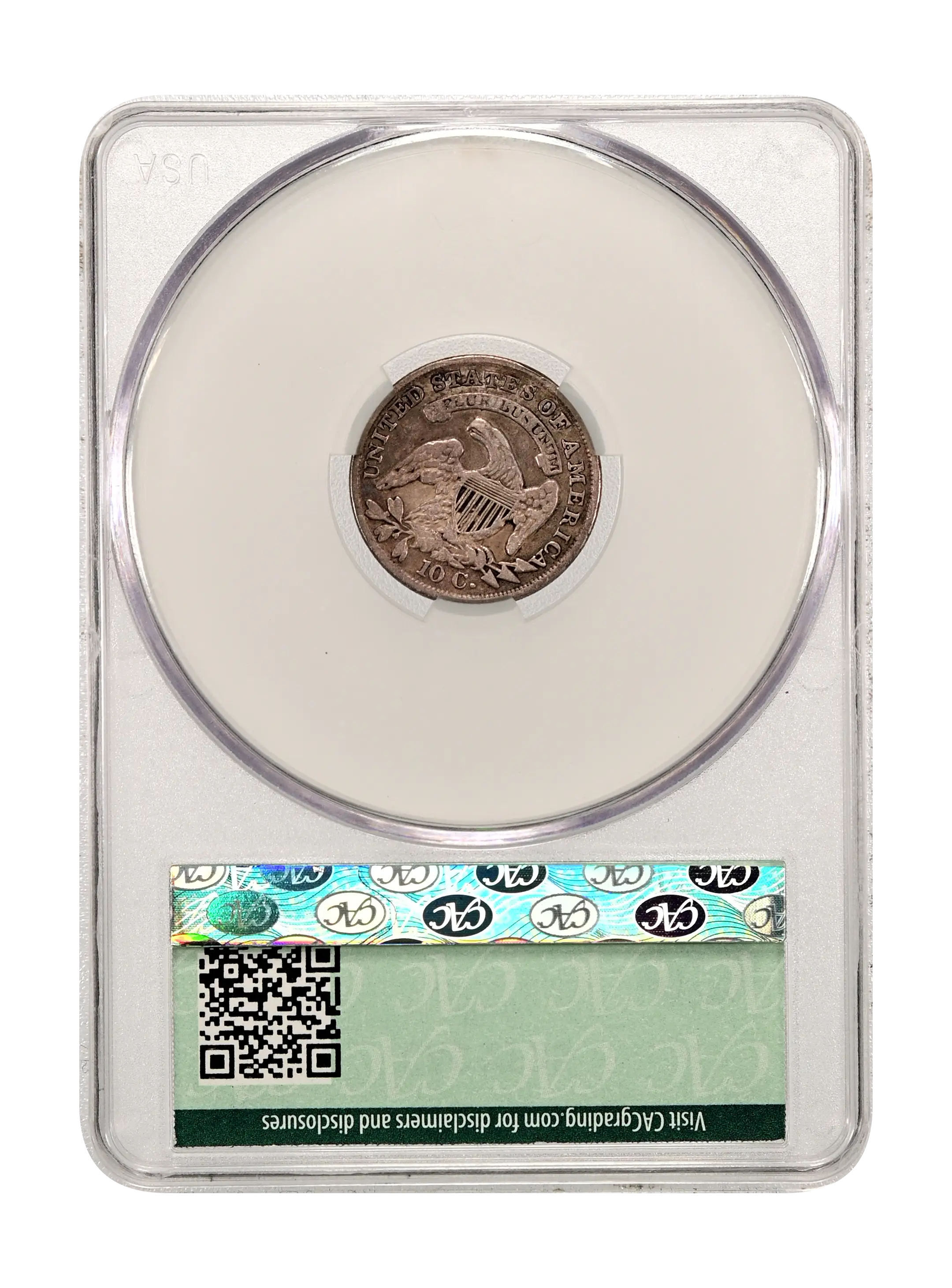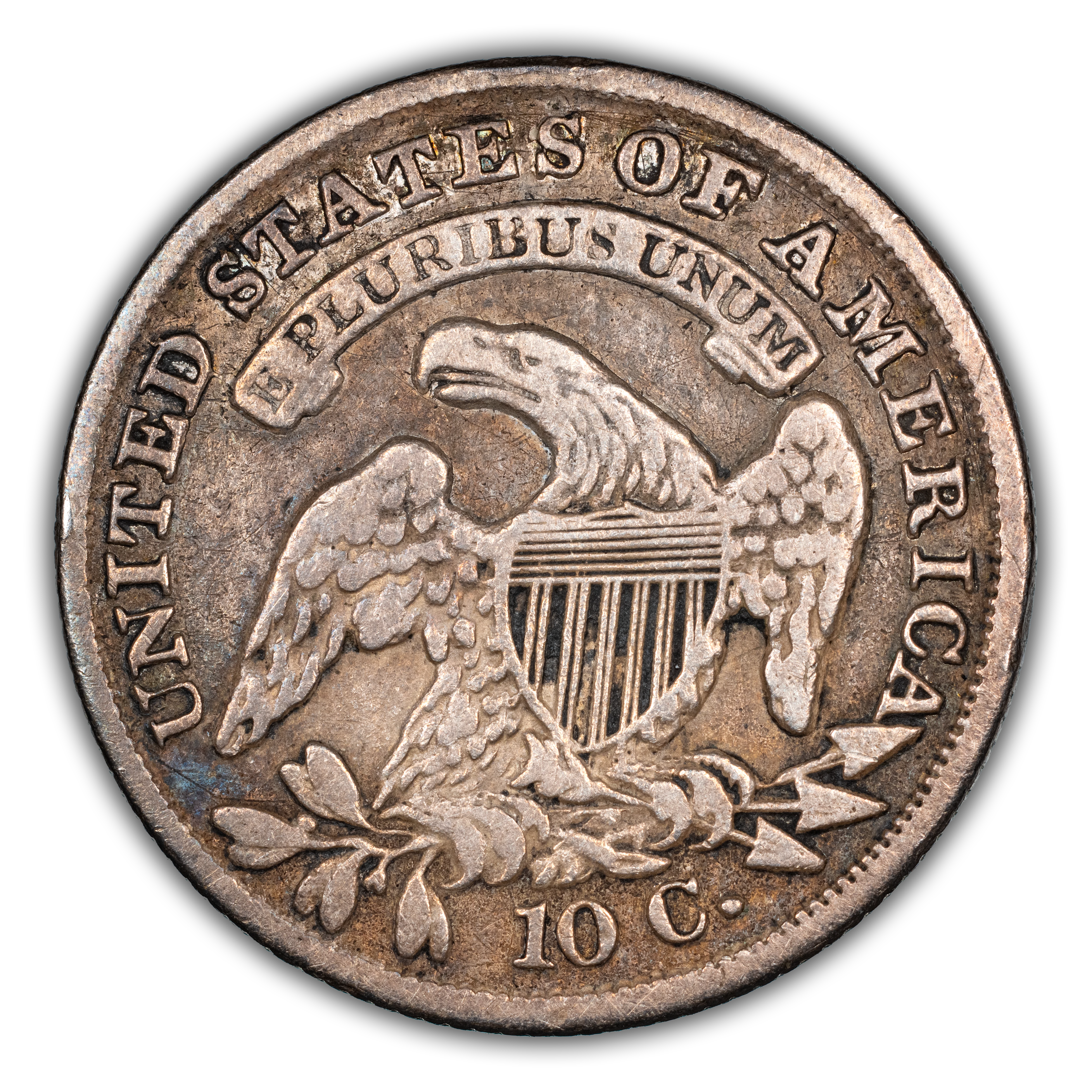 Reverse: An eagle is centered in the design with a shield over its chest, holding arrows and olive branches in its talons. A ribbon above bears the motto E PLURIBUS UNUM with UNITED STATES OF AMERICA around the periphery. The denomination listed as "10 C." appears at the bottom.