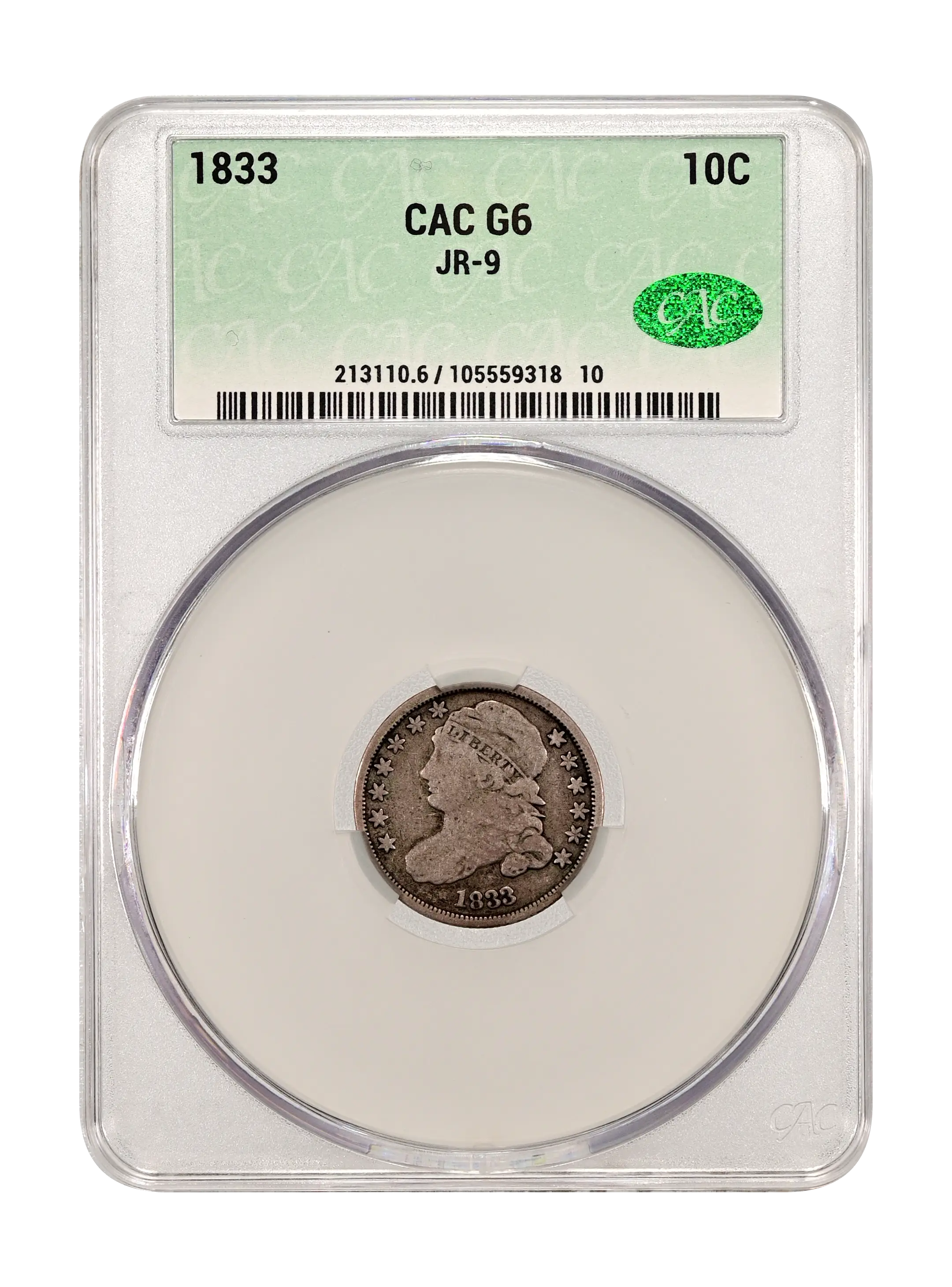 1833 10C JR-9, R.2, MS63 PCGS. PCGS Population: (39/69 and 0/3+). Mintage 485,000....
