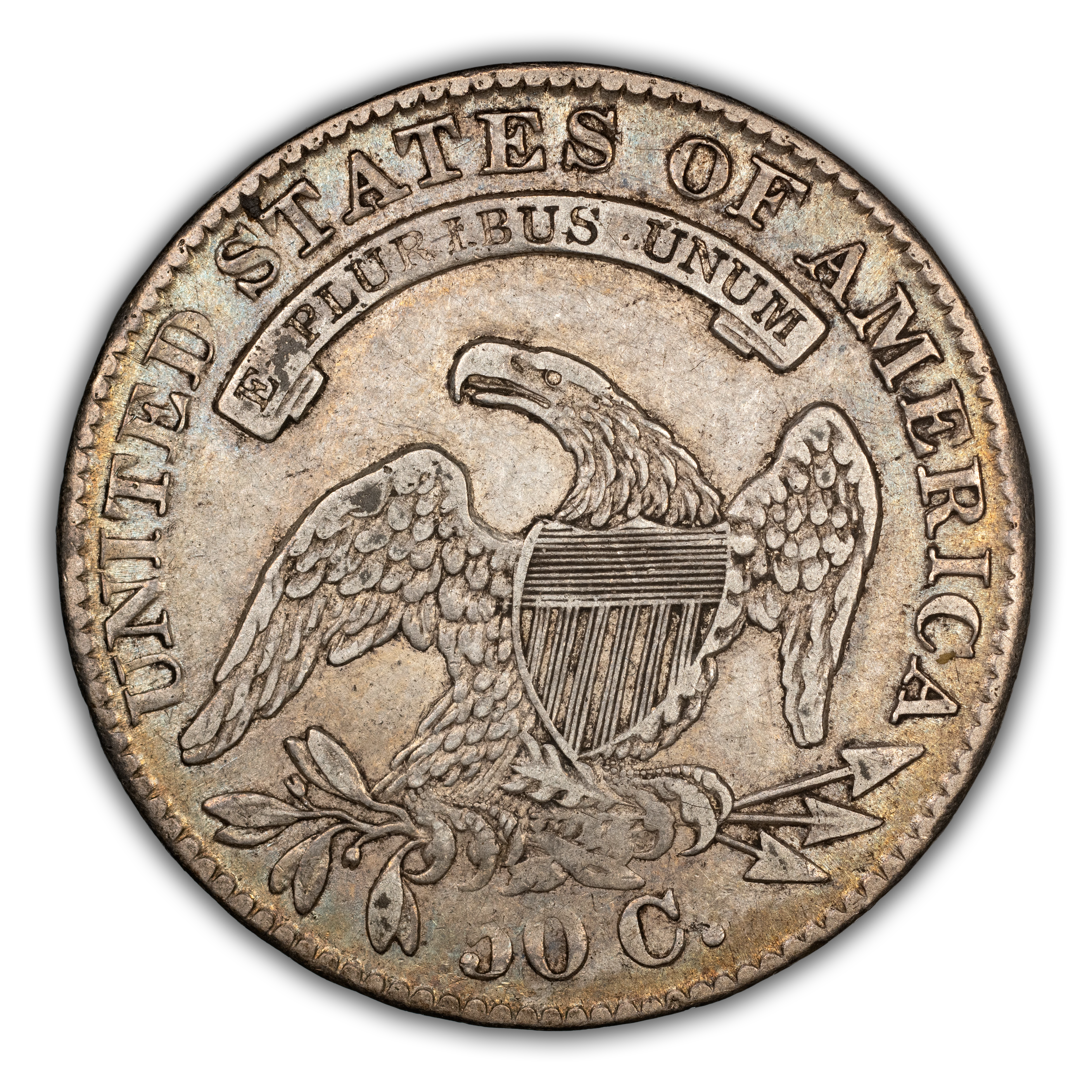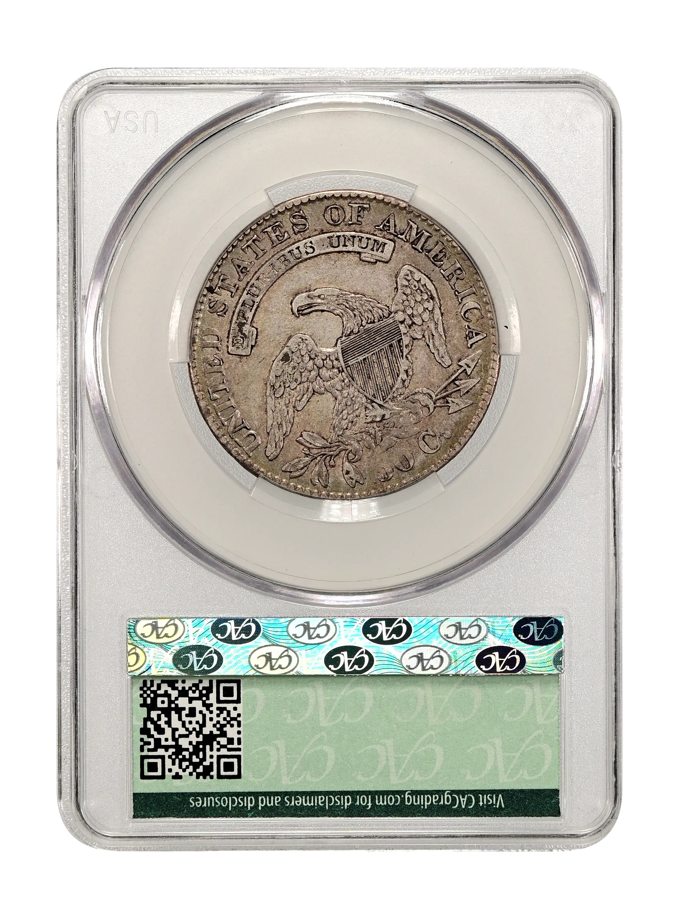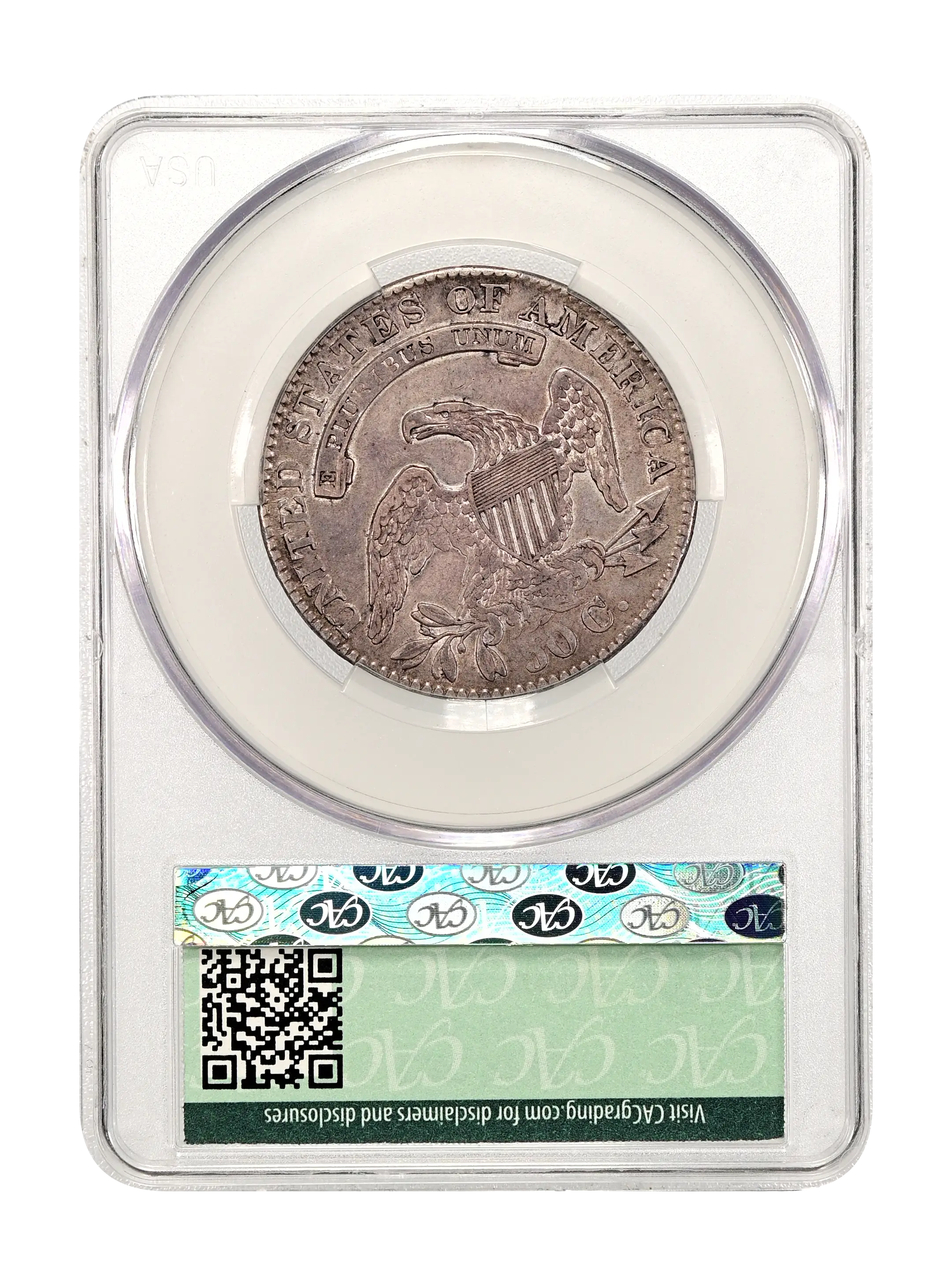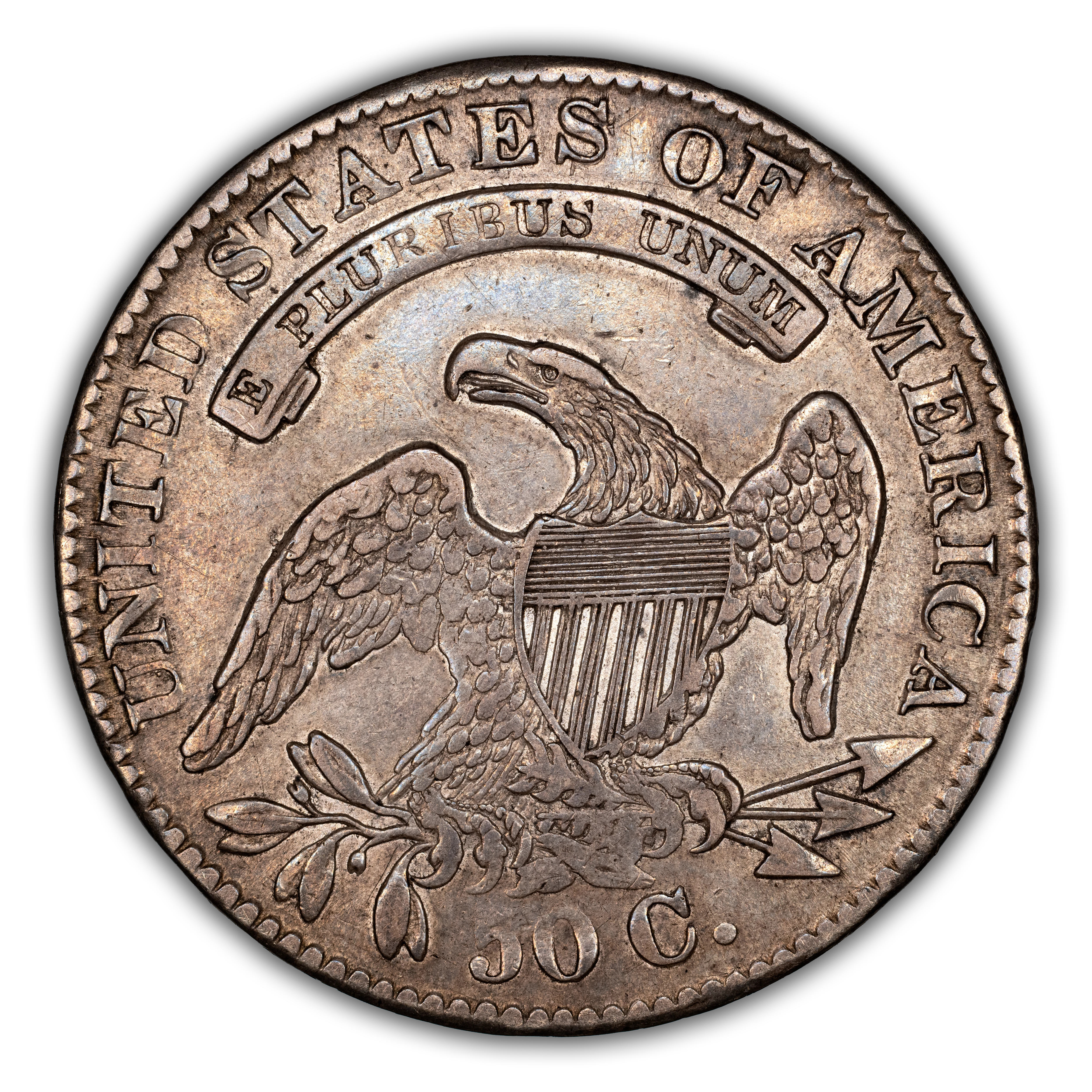Reverse: An heraldic eagle holding olive branches and 3 arrows in its claws is surrounded by the words UNITED STATES OF AMERICA around the periphery. A ribbon below bears the motto E PLURIBUS UNUM. The denomination of 50C is centered below the eagle.