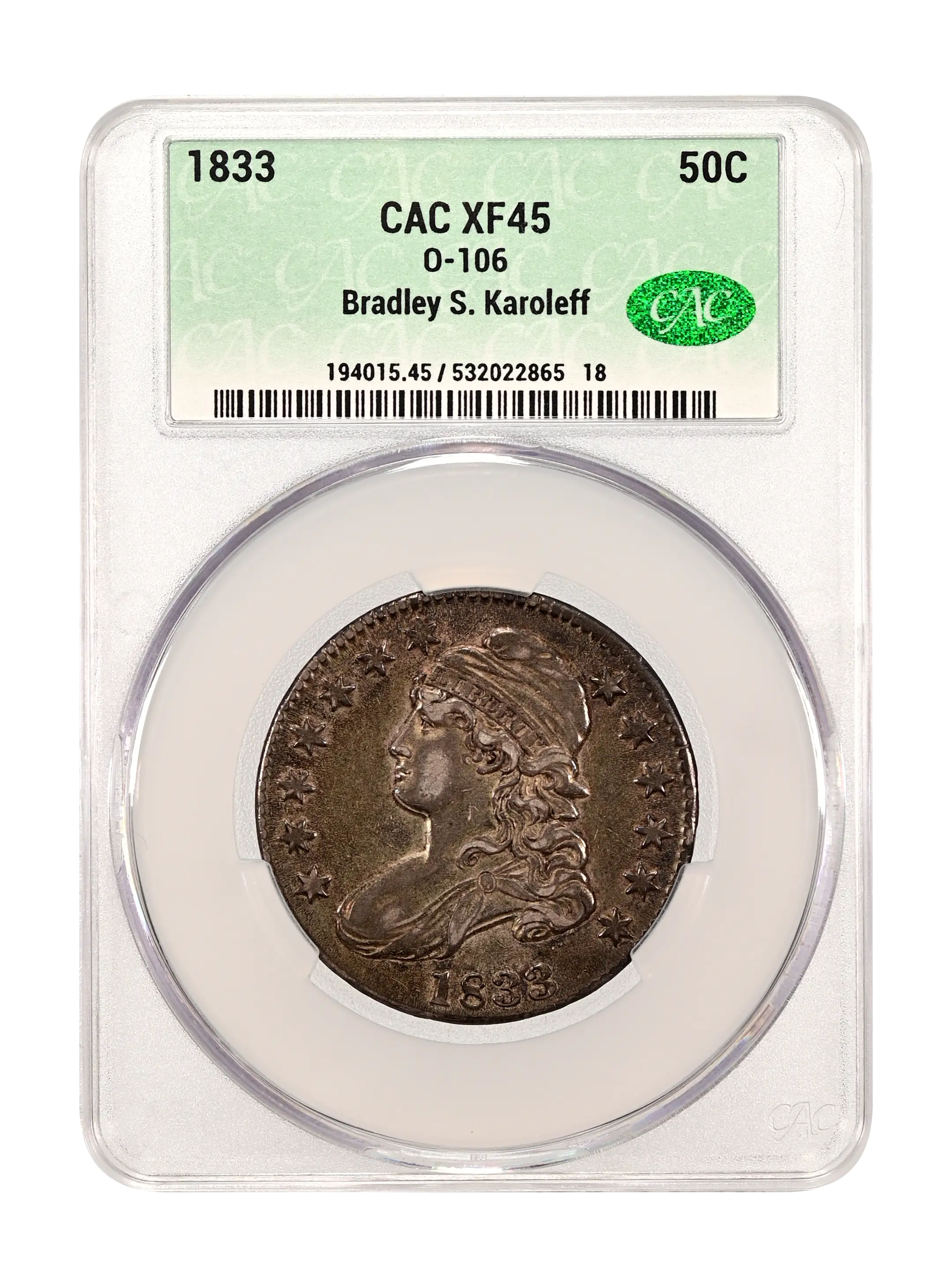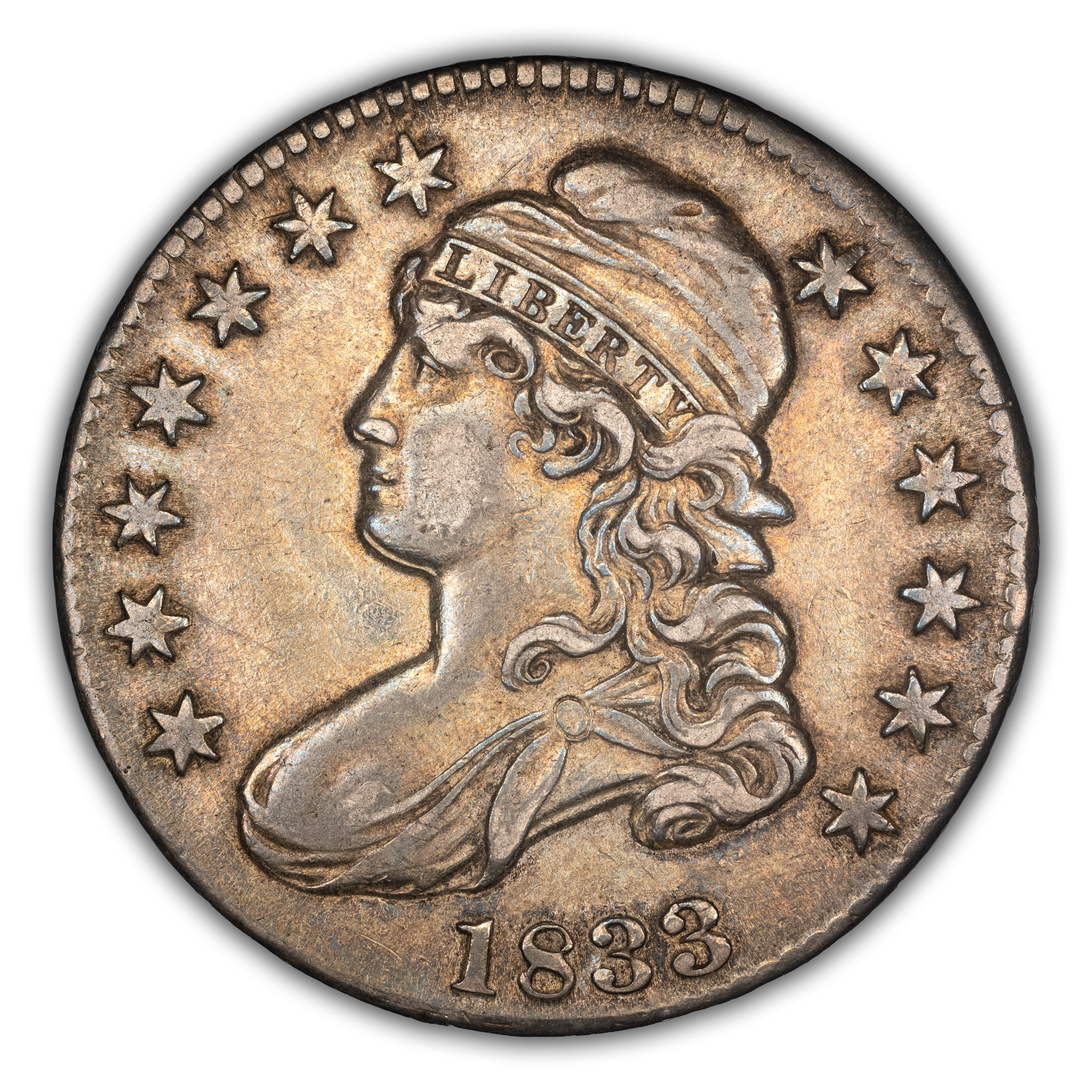 1833 50C O-106, R.2, AU55 PCGS. PCGS Population: (5/6). NGC Census: (5/15). CDN: $375 Whsle. Bid for NGC/PCGS AU55. Mintage...