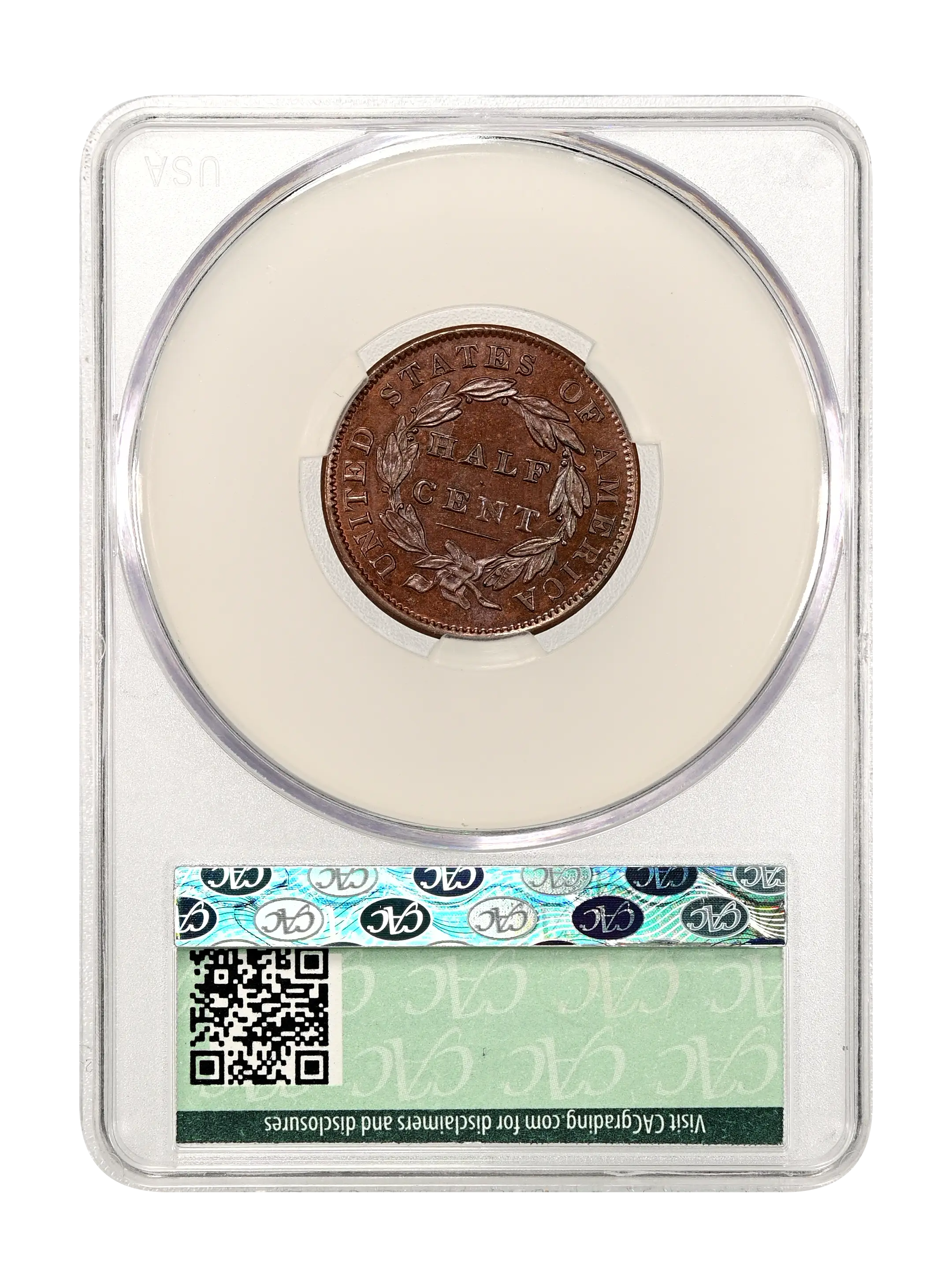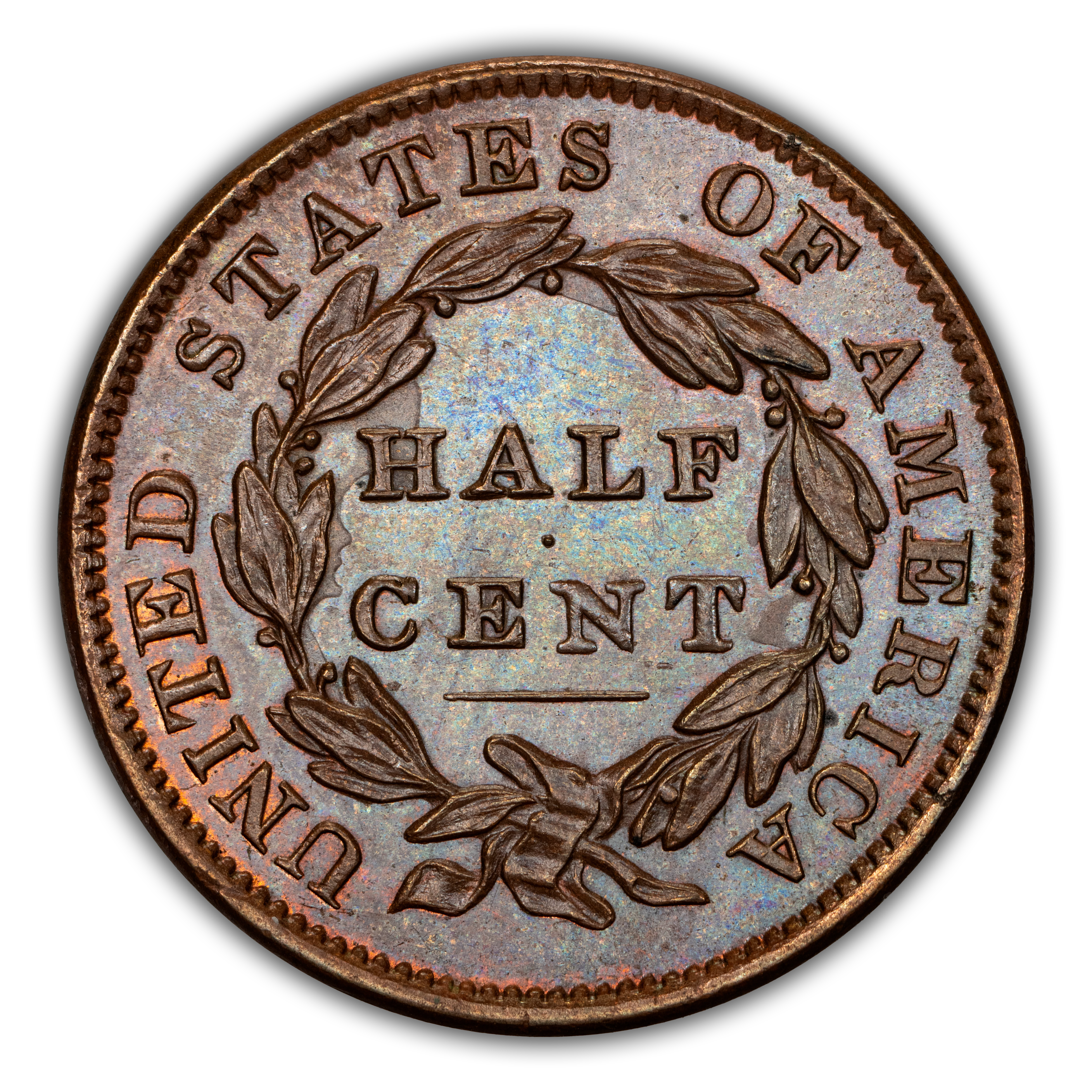 Reverse: The words UNITED STATES OF AMERICA around the periphery surround a wreath framing the words HALF CENT. The wreath is tied by a bow at the bottom.
