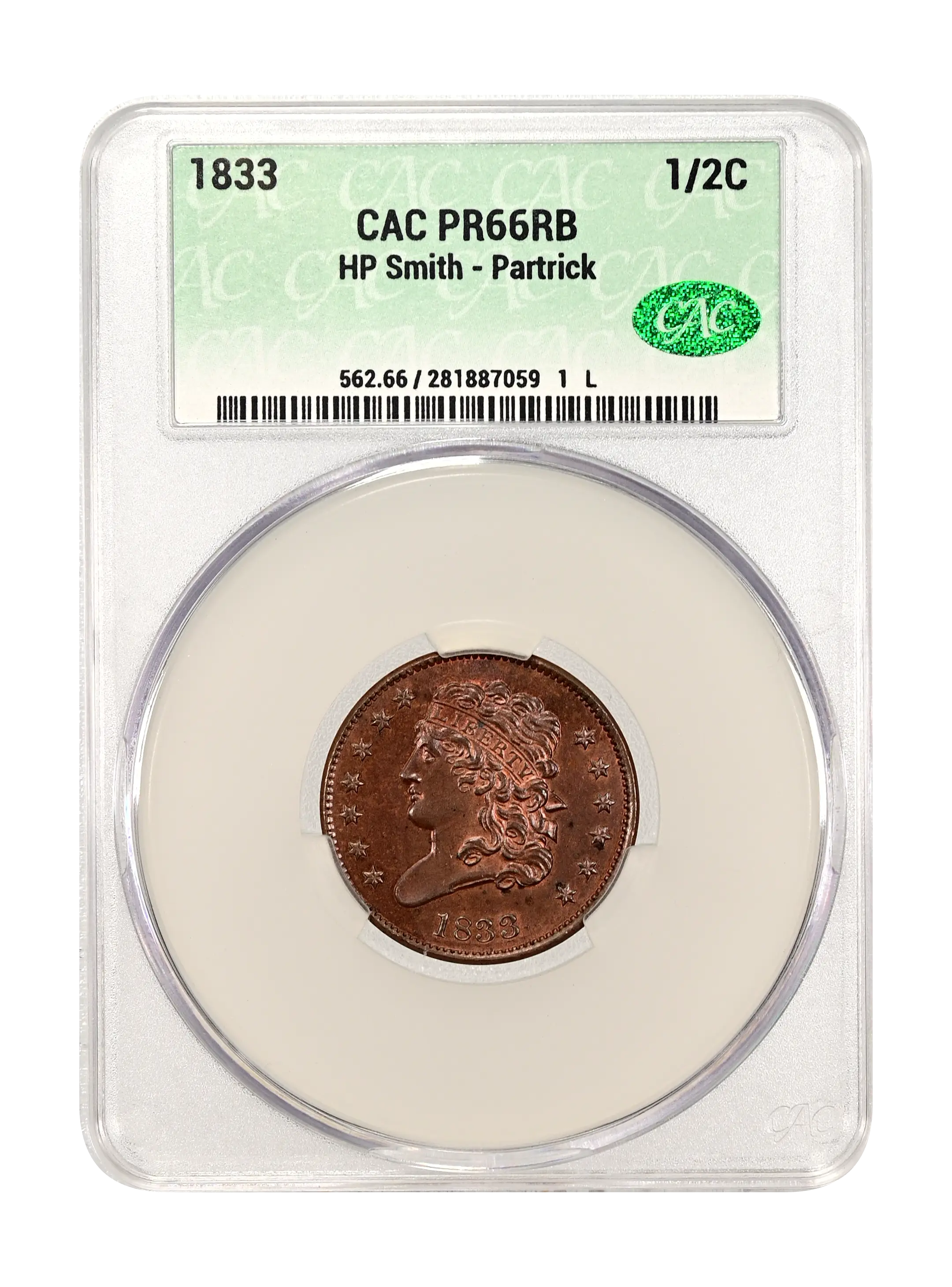 1833 1/2 C PR65 Red and Brown PCGS. CAC. C-1, B-1, R.5 as a proof....