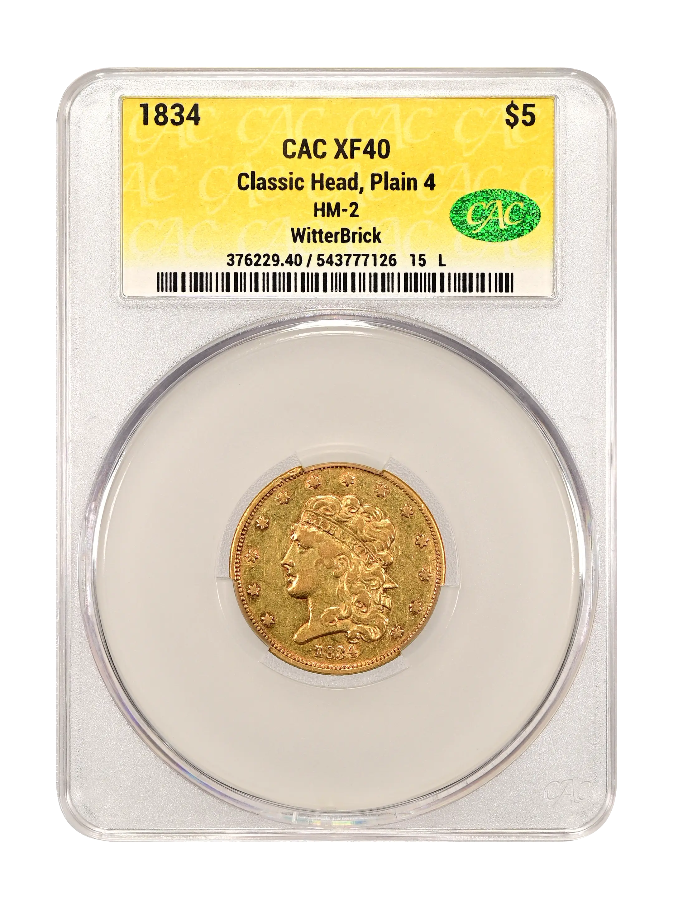 1834 Classic Head, Plain 4 $5 HM-2 CAC XF40