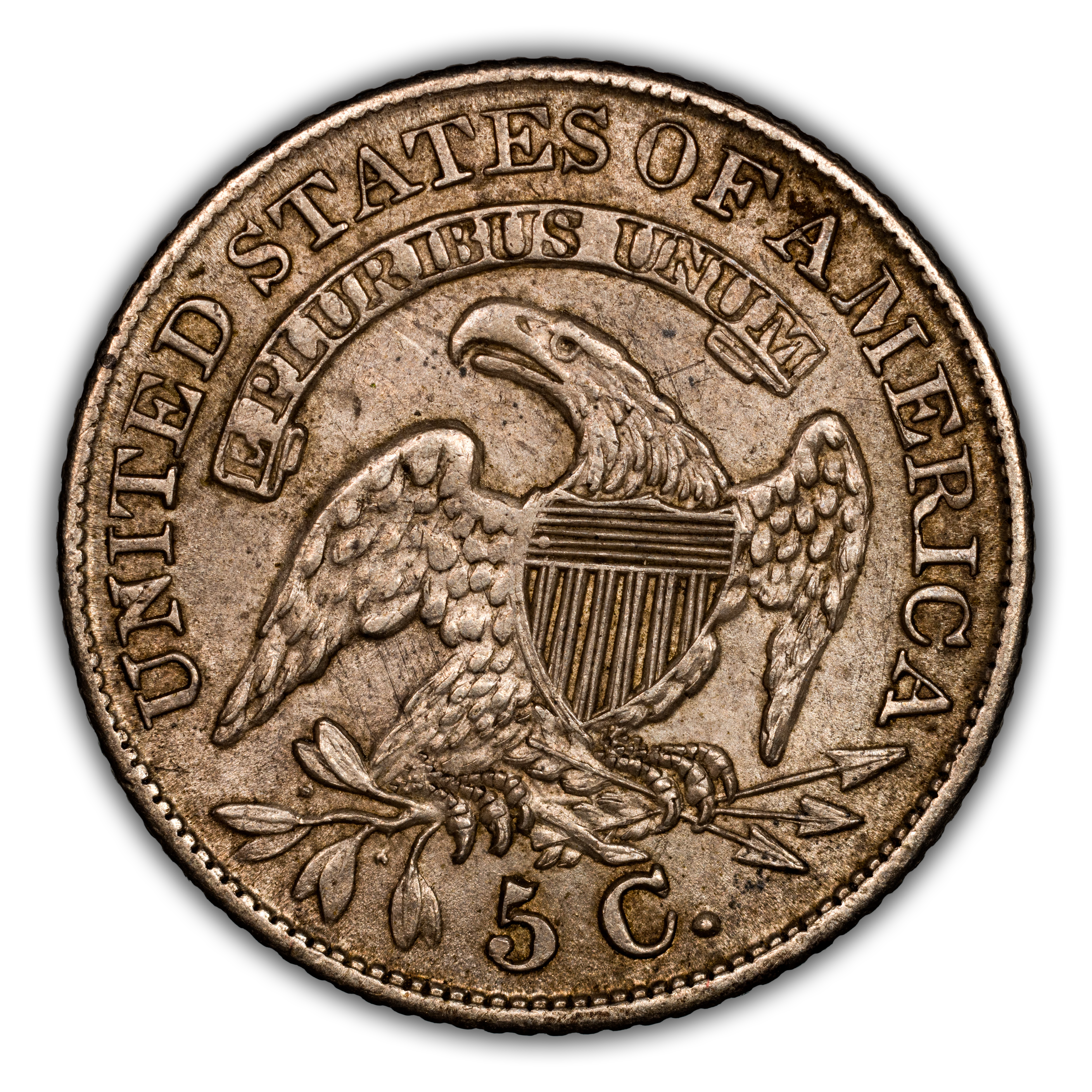Reverse: An eagle is centered in the design with a shield over its chest, holding arrows and olive branches in its talons. A ribbon above bears the motto E PLURIBUS UNUM with UNITED STATES OF AMERICA around the periphery. The denomination listed as "5C." appears at the bottom.