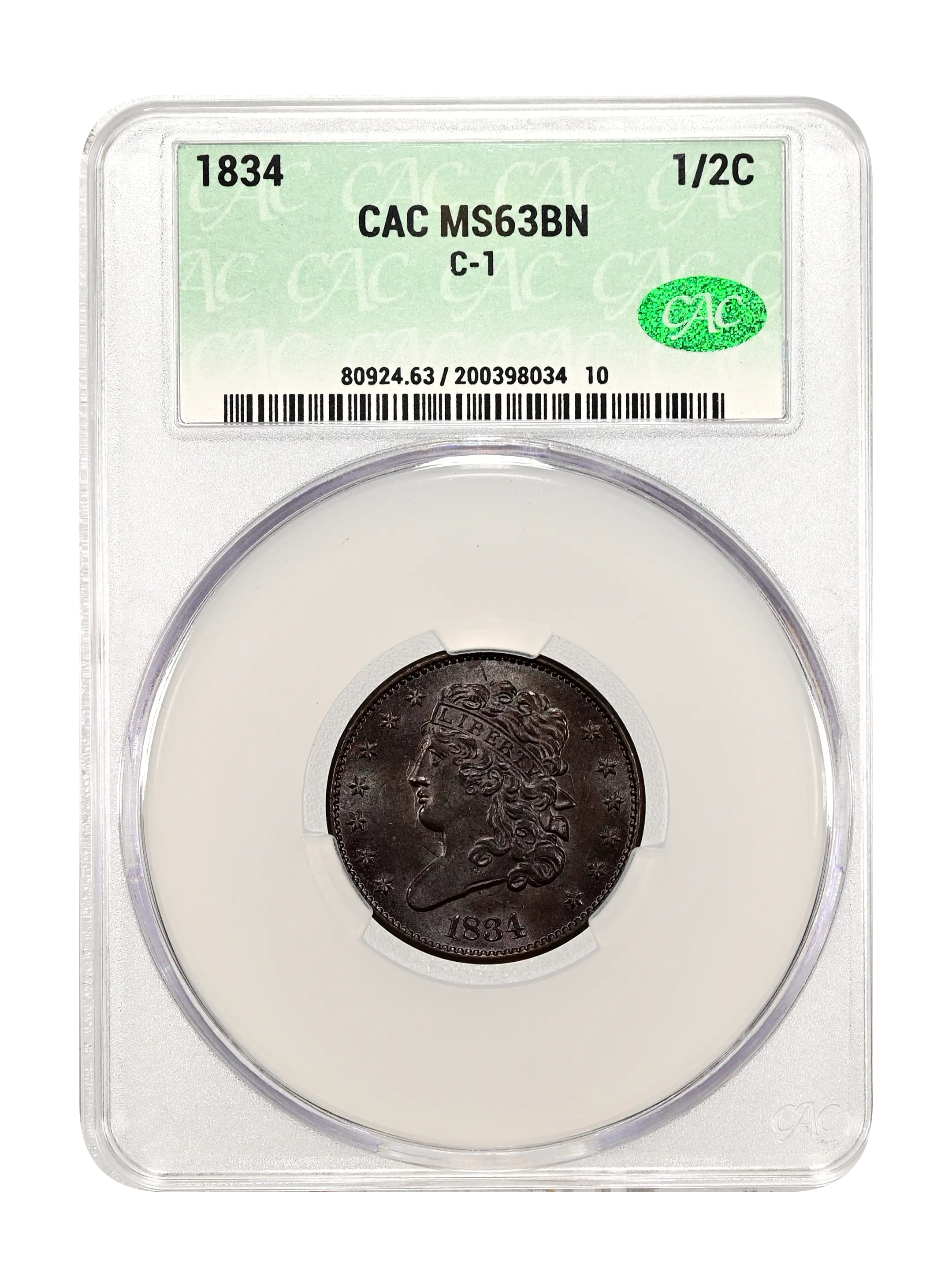 1834 1/2 C C-1, B-1, R.1, MS63 Brown PCGS. Mintage 141,000....