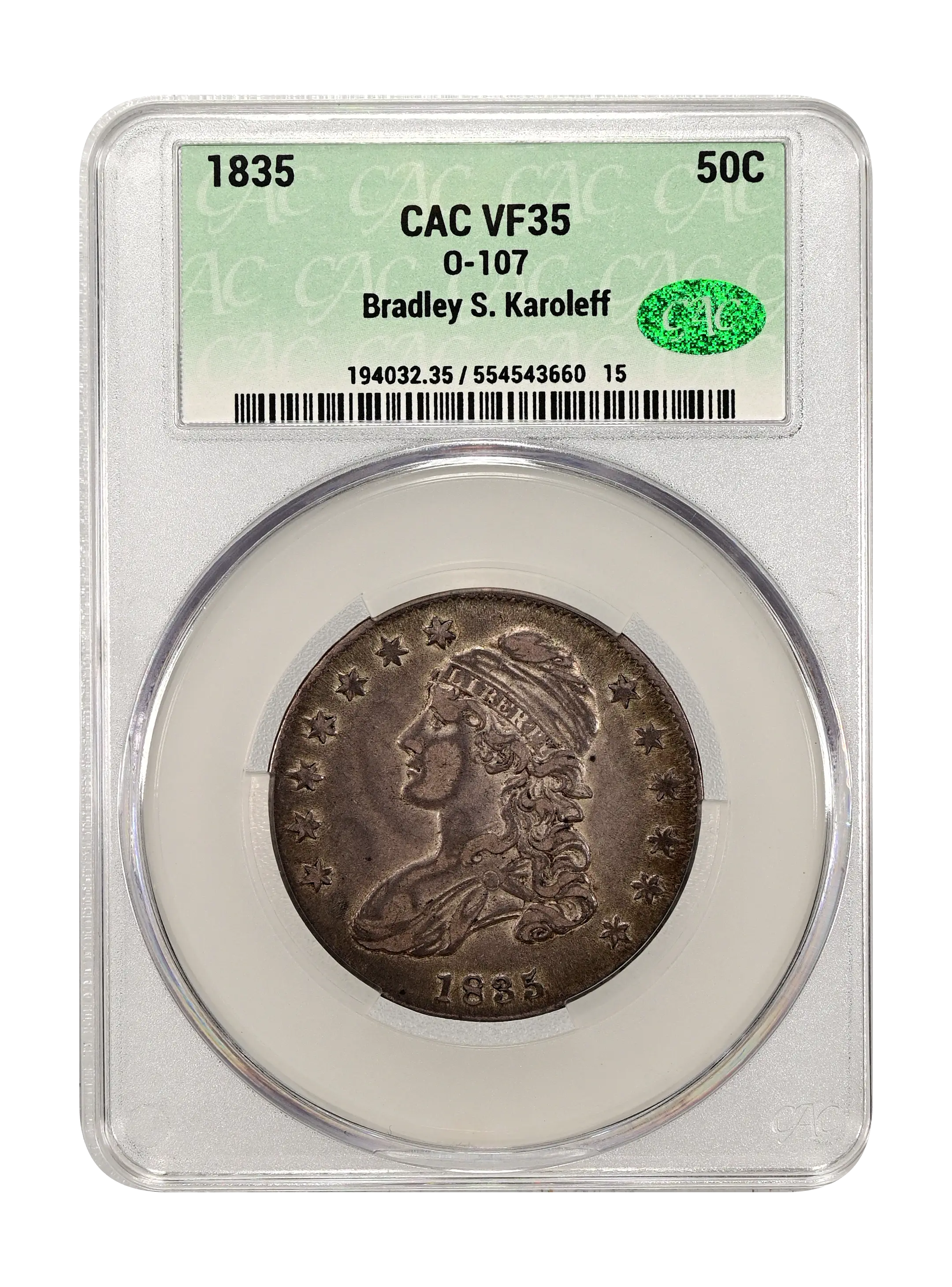 1835 50C O-107, R.1, MS62 NGC. NGC Census: (4/2). PCGS Population: (4/2). CDN: $1,050 Whsle. Bid for NGC/PCGS MS62. Mintage...