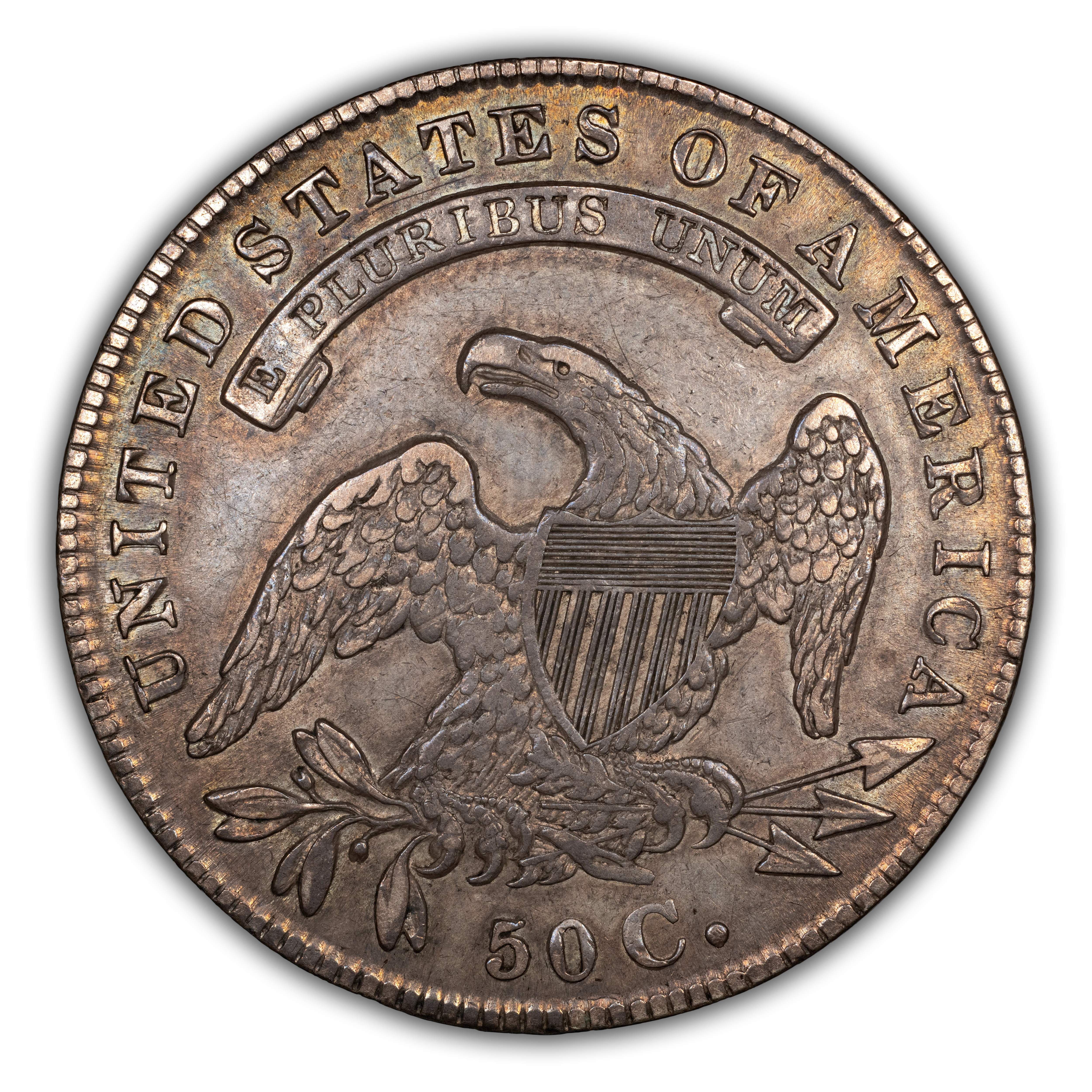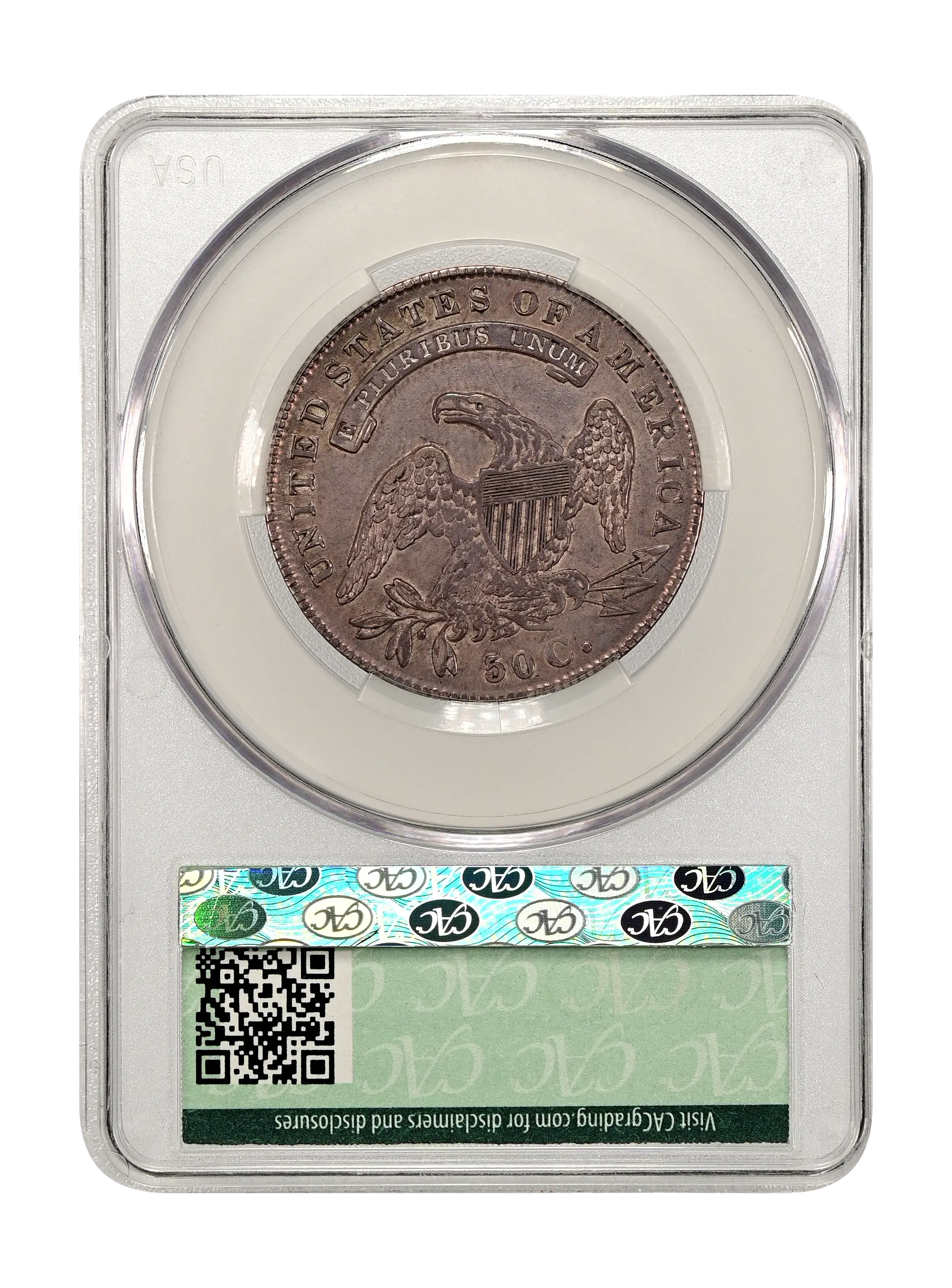 Reverse: An heraldic eagle holding olive branches and 3 arrows in its claws is surrounded by the words UNITED STATES OF AMERICA around the periphery. A ribbon below bears the motto E PLURIBUS UNUM. The denomination of 50C is centered below the eagle.
