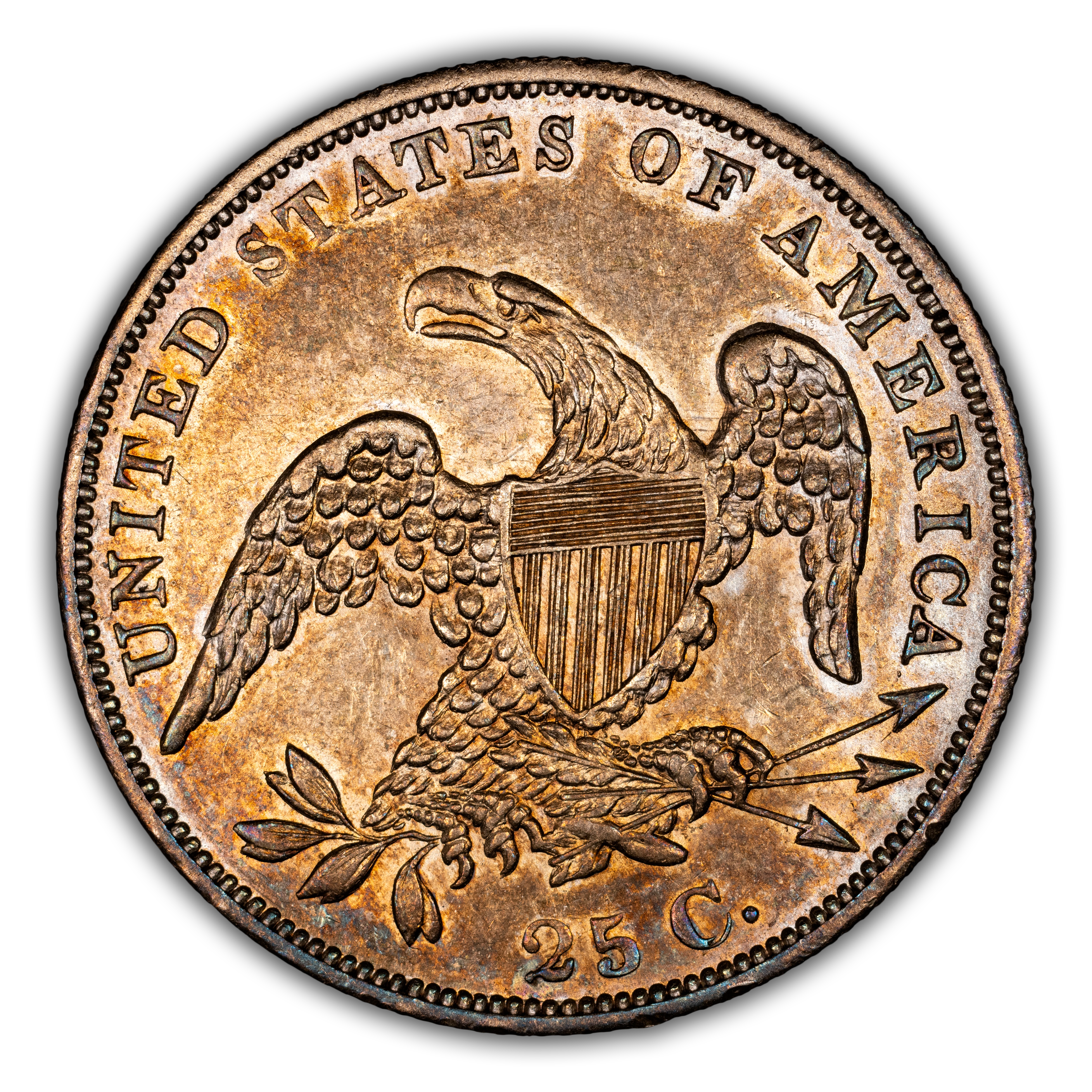 Reverse: The centerpiece of the reverse is the so-called "heraldic eagle" with wings fully spread and emblazoned with a shield replacing the chest. A ribbon bearing the motto E PLURIBUS UNUM hangs from the beak. The eagles right talon holds bundle of arrows and an olive branch in the right. Above the eagle's head are a group of stars and clouds with the words UNITED STATES OF AMERICA at the top periphery. The denomination of 25 C. appears at the bottom.