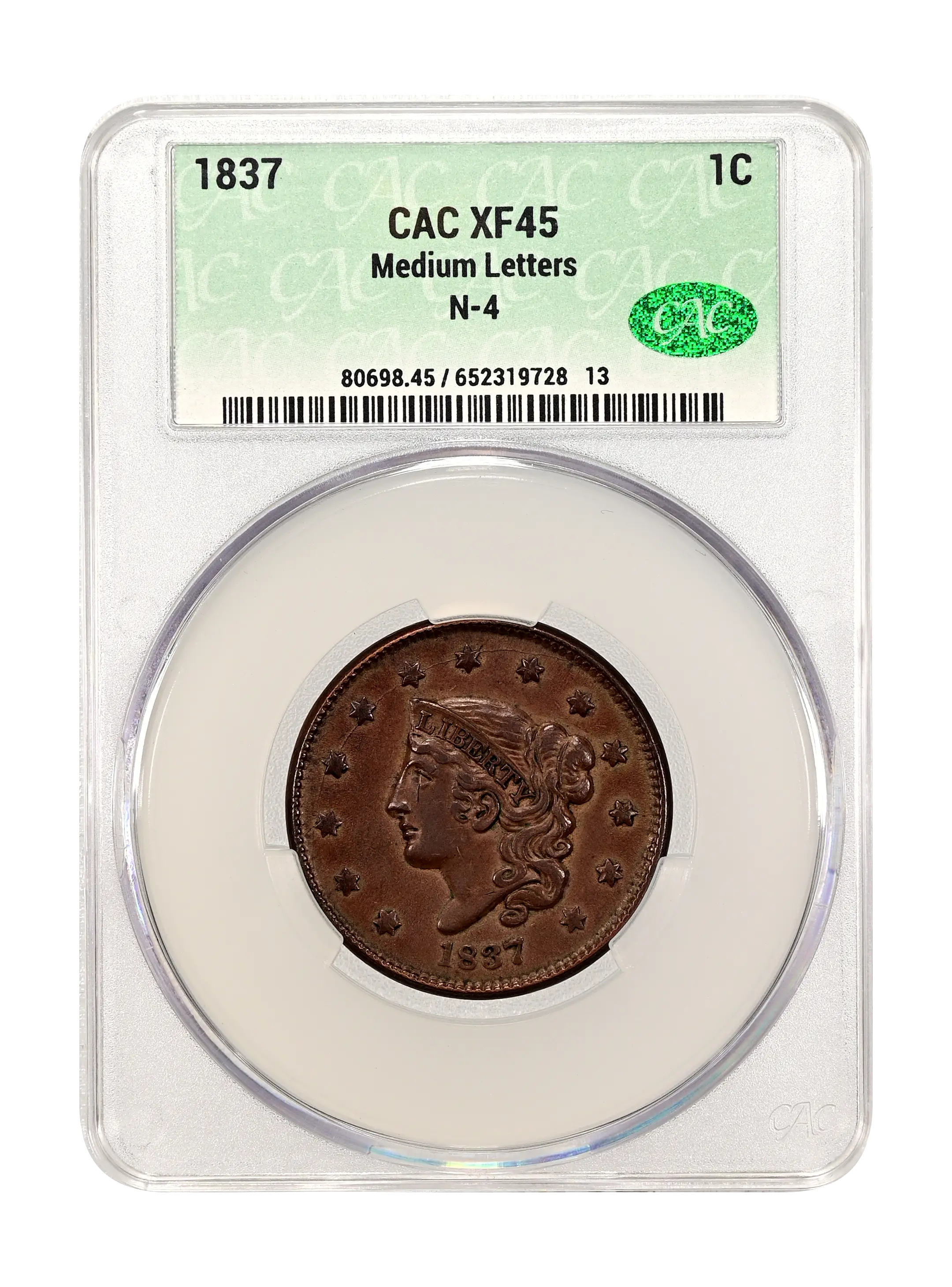 1837 Medium Letters 1c N-4 BN CAC XF45BN