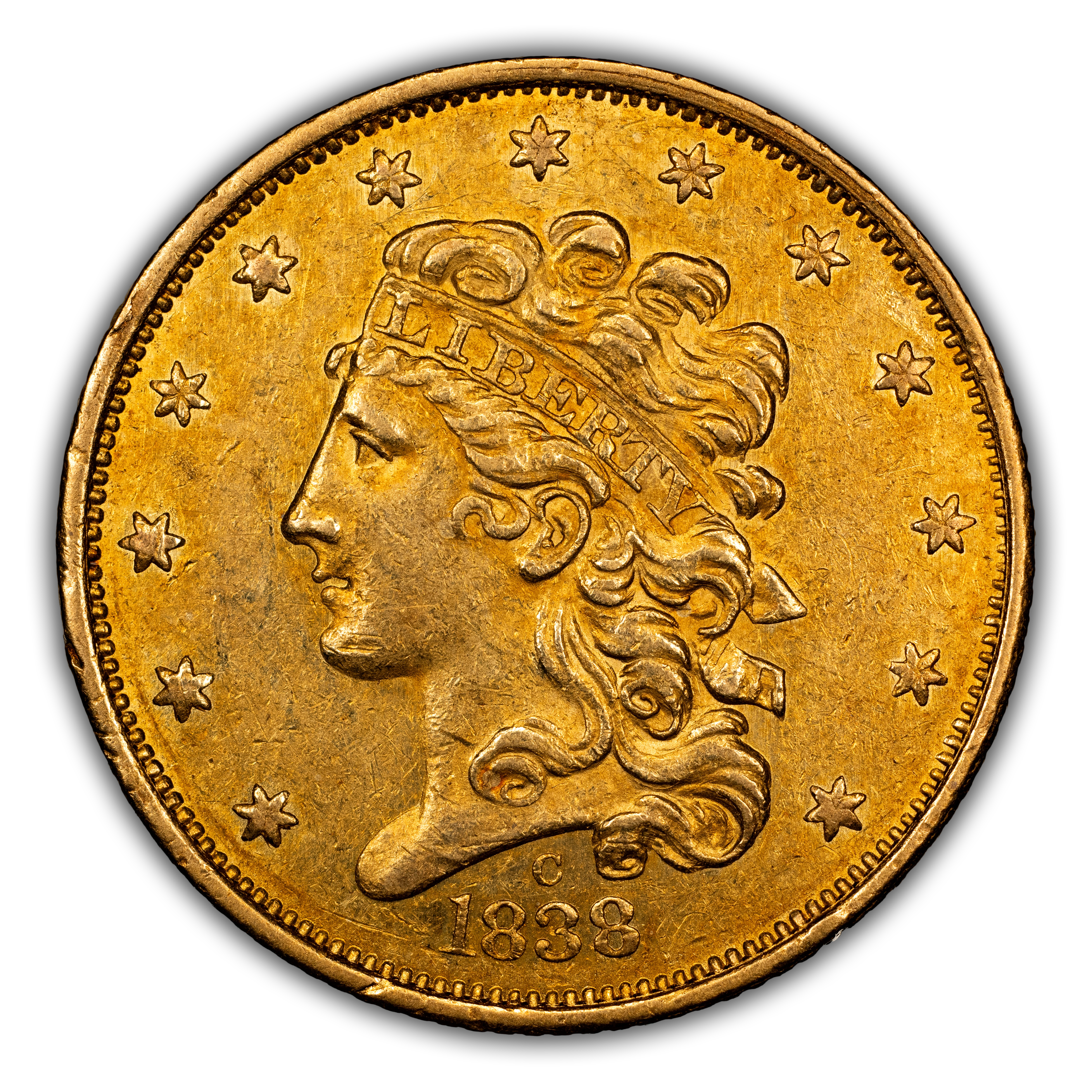1838-C Classic Head Half Eagle. McCloskey-2, Dies 1-B. Mint State-63 (PCGS).