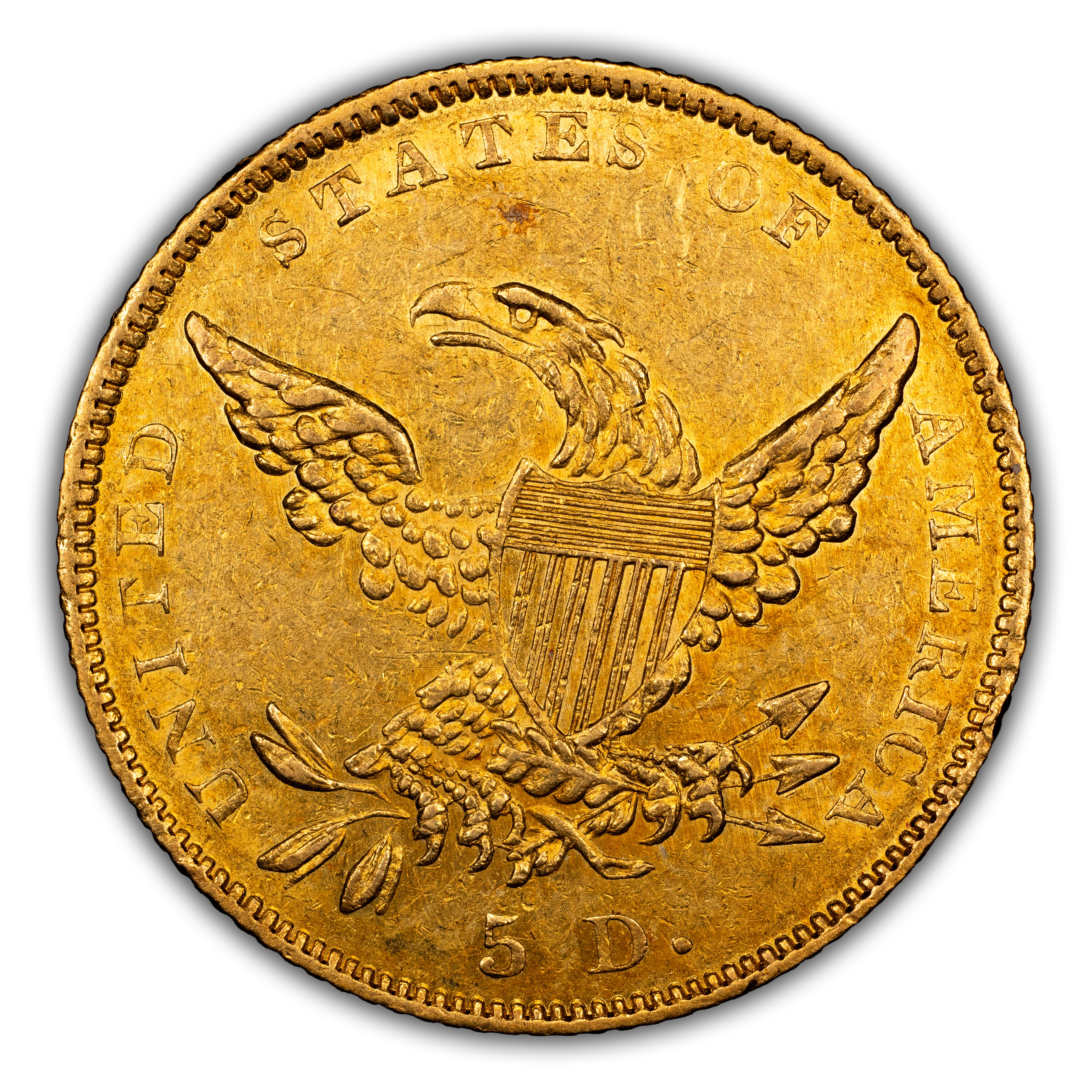 Reverse: An eagle with wings fully spread. The words UNITED STATES OF AMERICA around the periphery with "5 D." written as a fraction appears at the bottom.
