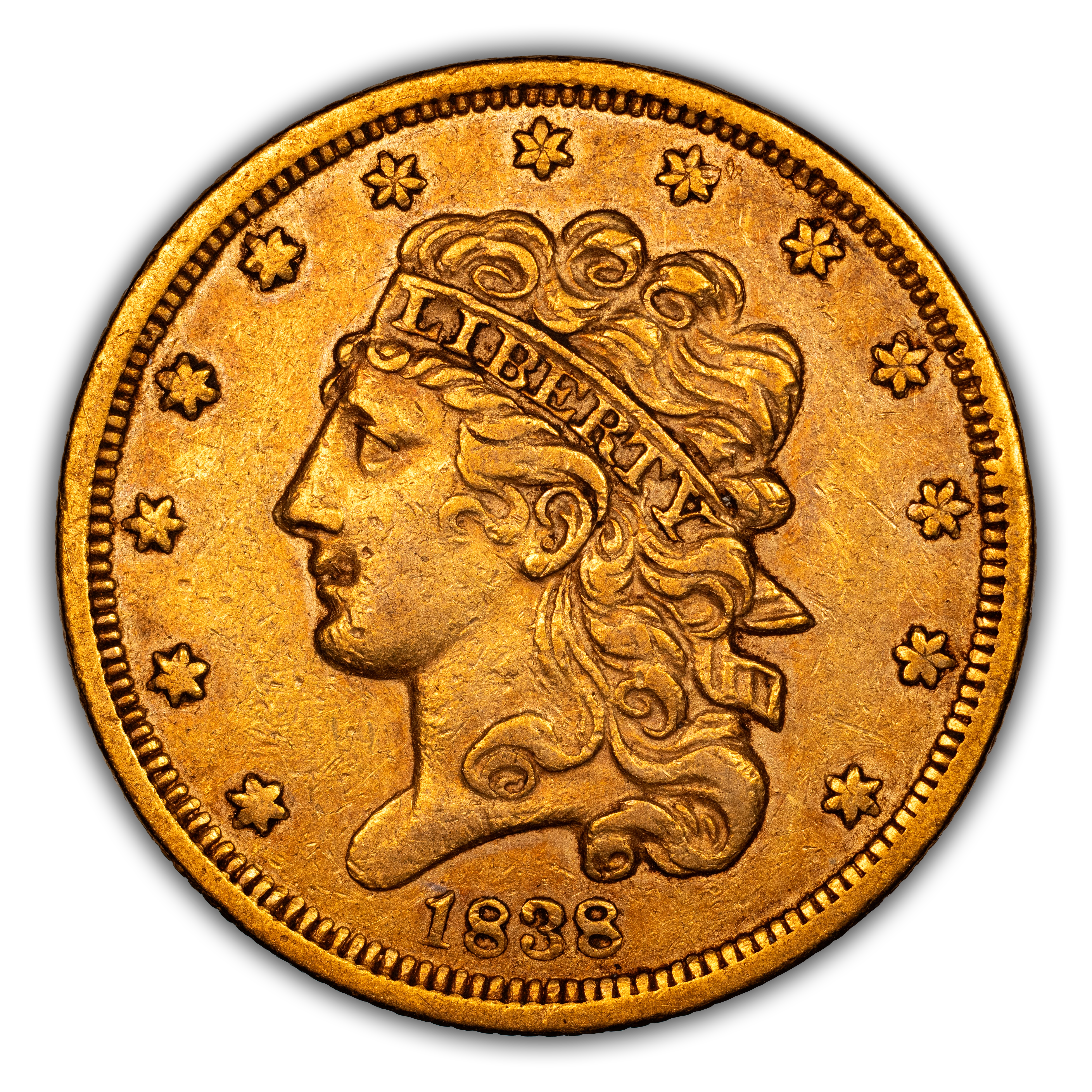 1838 Classic Head Half Eagle. McCloskey-2, Dies 2-B. Mint State-66 (PCGS).