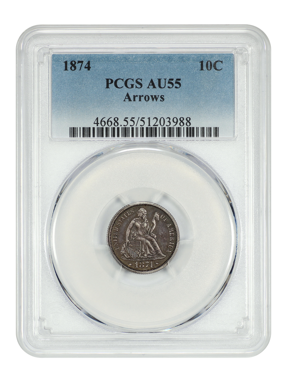 Obverse: Lady Liberty is seated on a rock, holding a staff, and bearing a shield with the word LIBERTY on a flowing ribbon. UNITED STATES OF AMERICA adorns the periphery and the date appears at the bottom center.