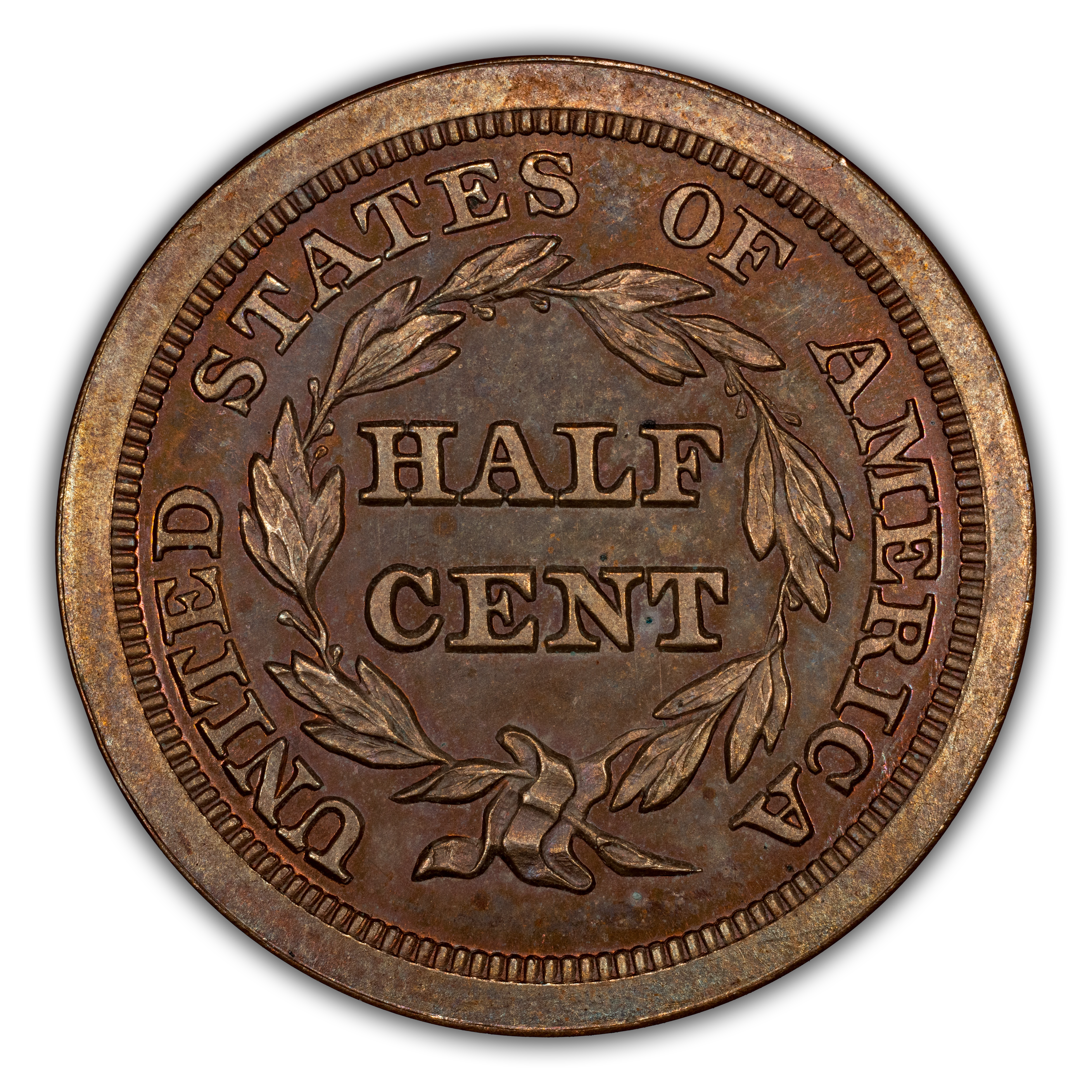 Reverse: The words UNITED STATES OF AMERICA around the periphery surround a wreath framing the words HALF CENT. The wreath is tied by a bow at the bottom.