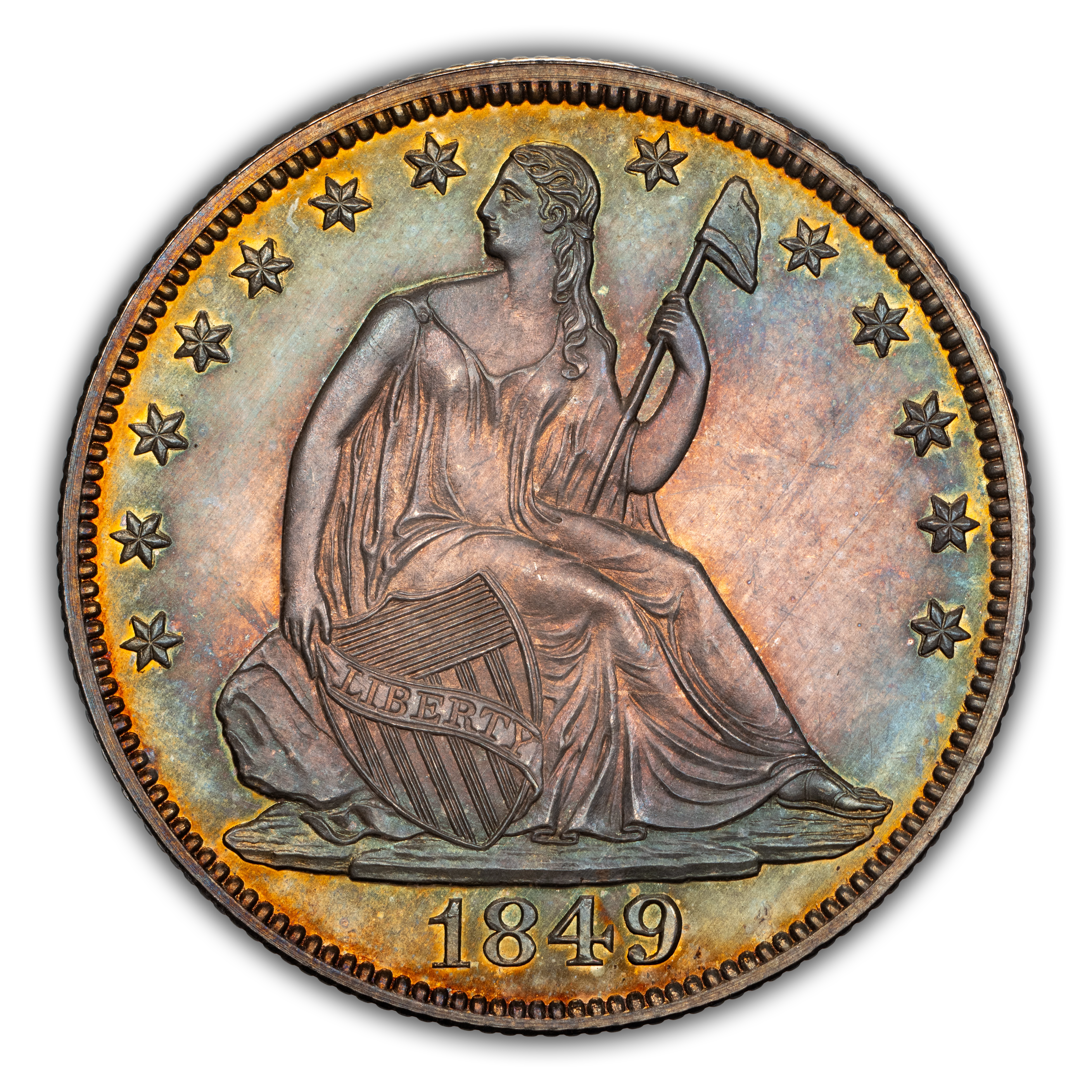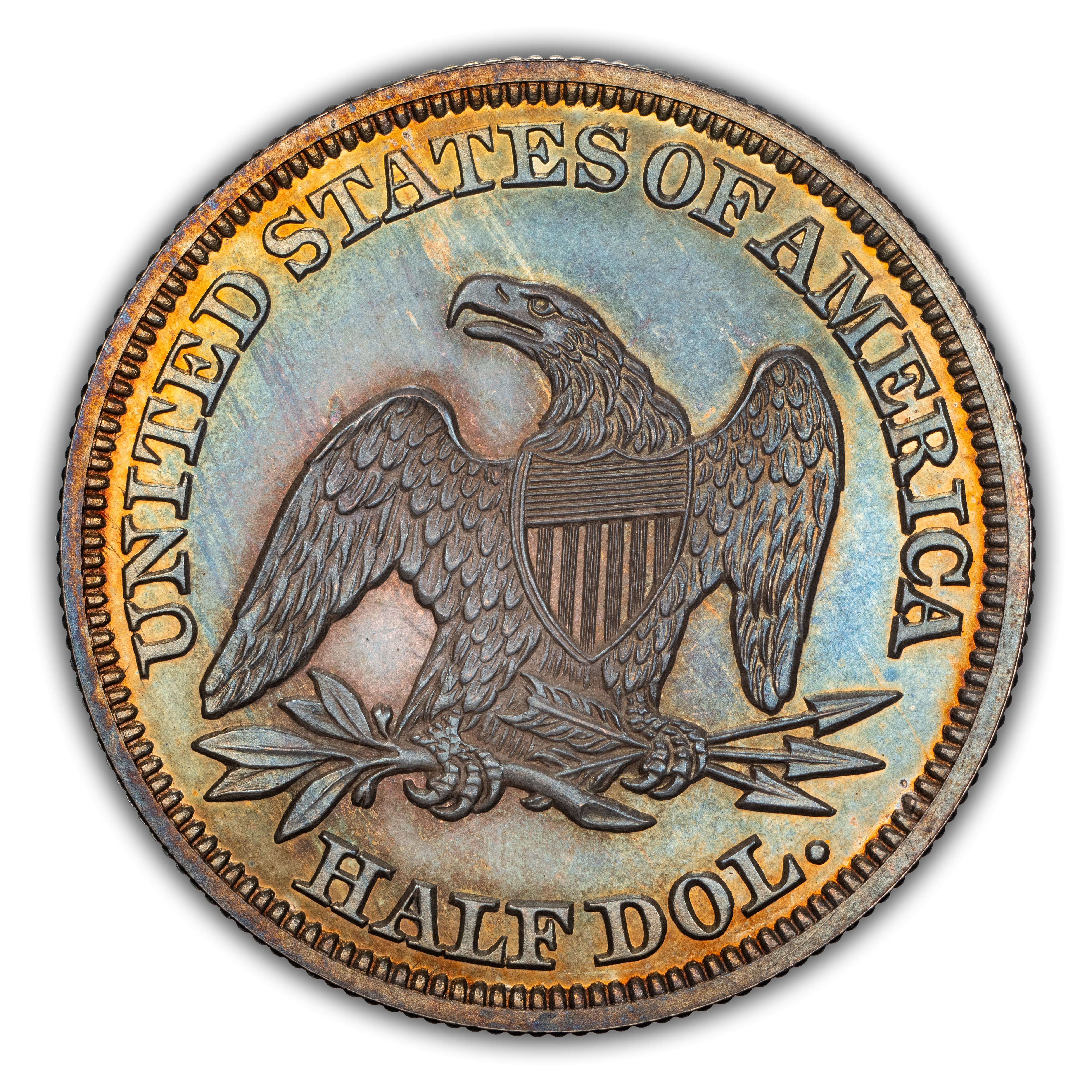 Reverse: The heraldic eagle is centered in the design with the words UNITED STATES OF AMERICA and HALF DOL. around the periphery.