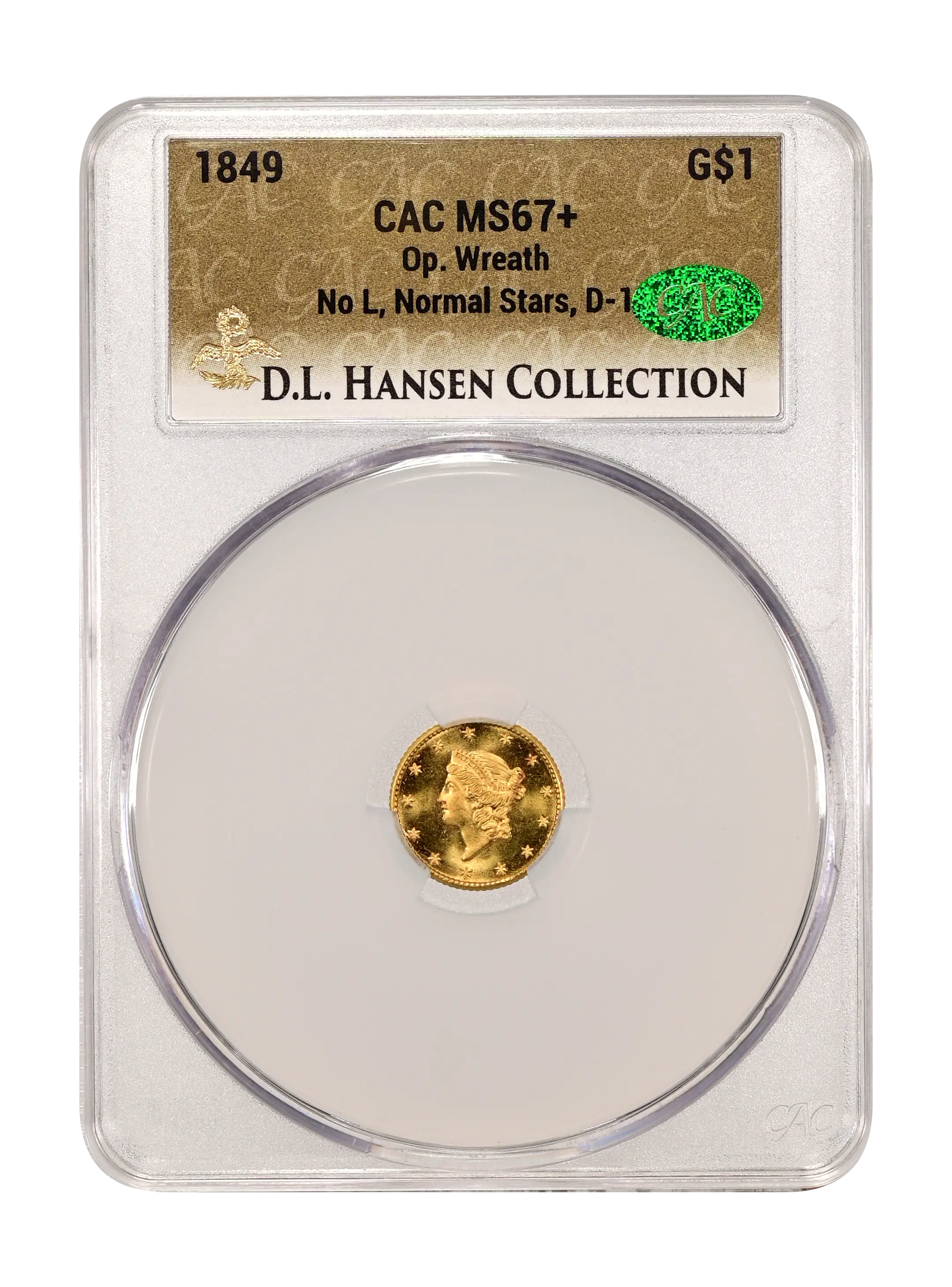 1849 Op. Wreath G$1 No L, Normal Stars, D-1 CAC MS67+