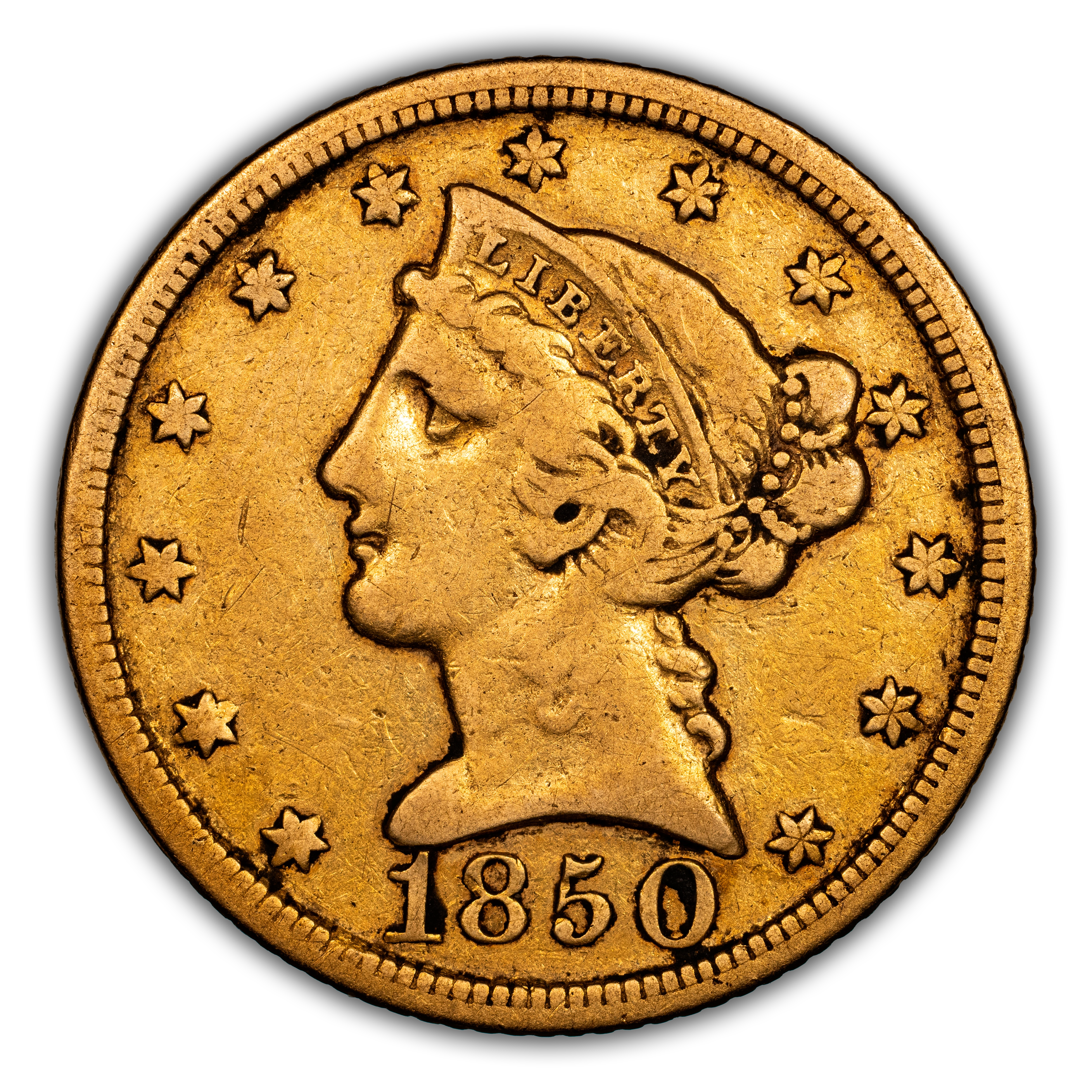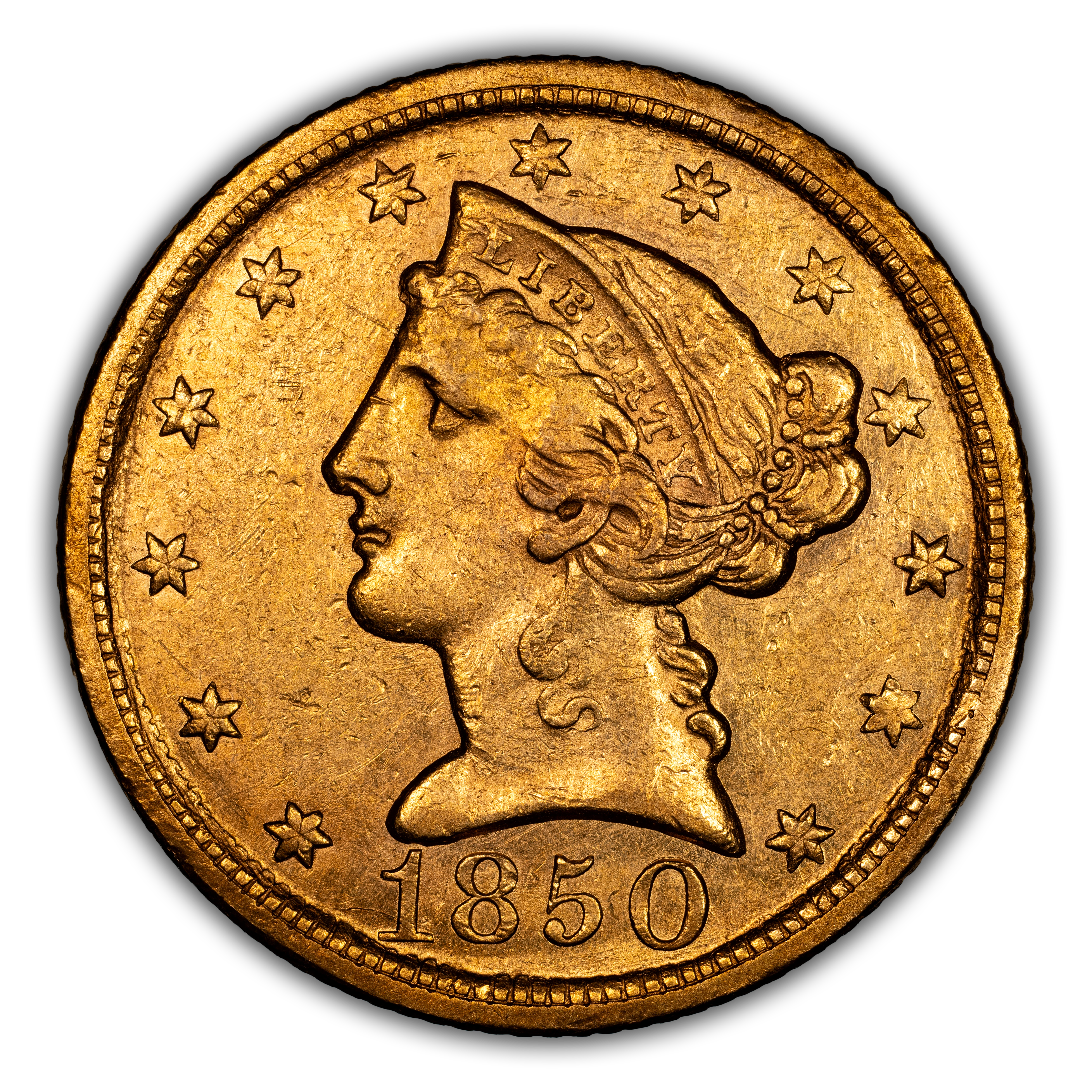 1850-D $5 AU53 NGC. Variety 28-U. Ex: Rive d'Or Collection. The 1850-D is an elusive Dahlonega issue, with an estimated sur...