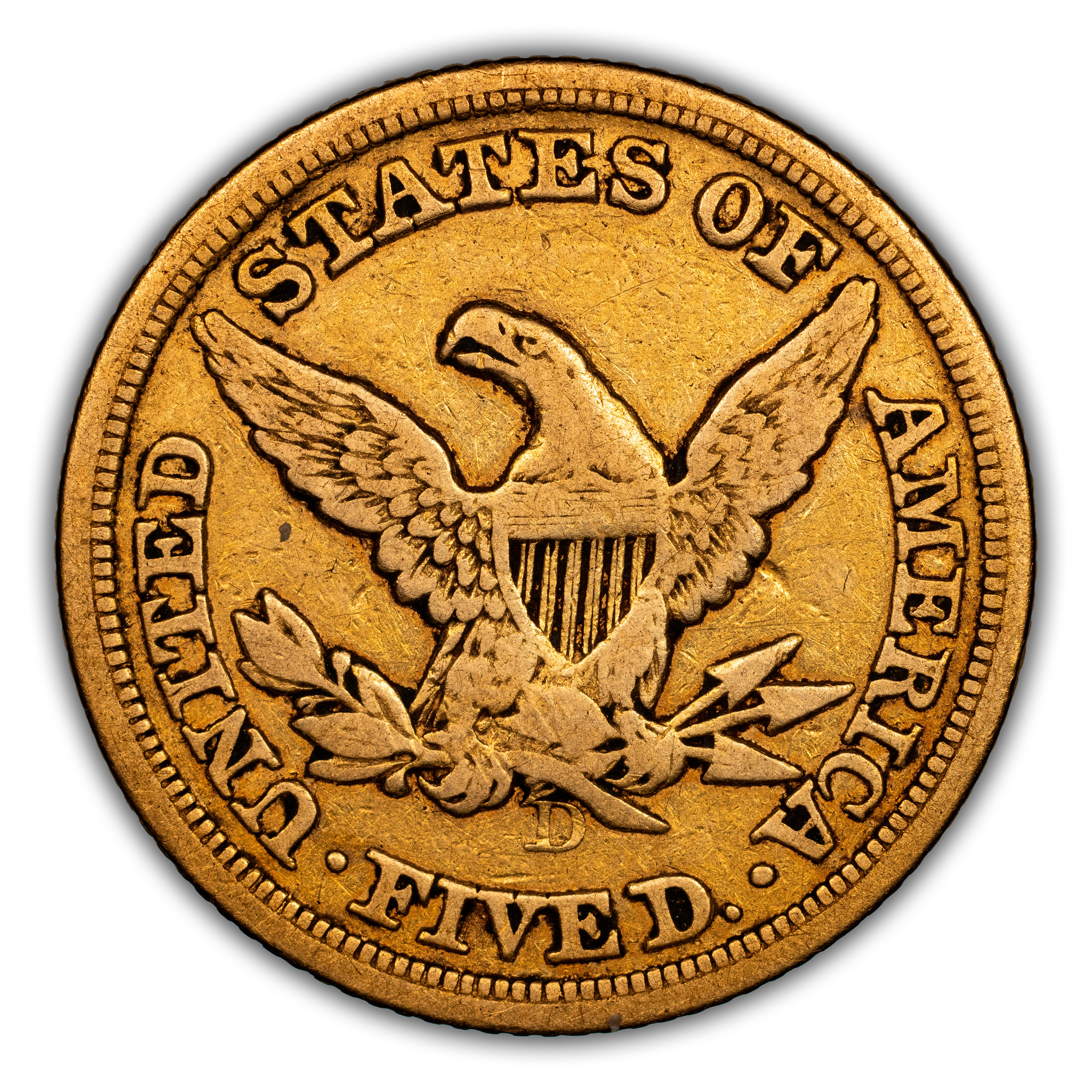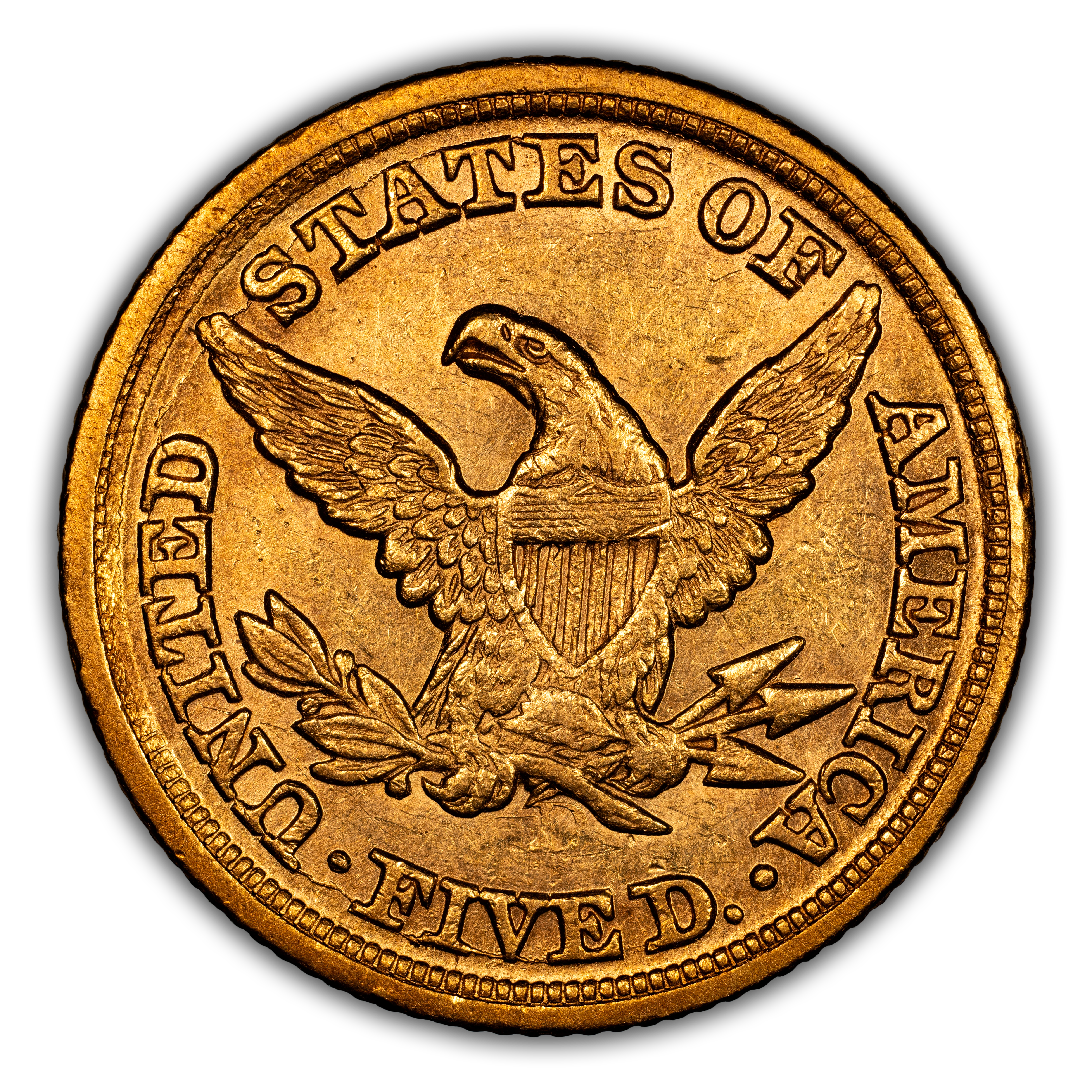 Reverse: Heraldic eagle holding arrows and branch in its claws is centered in the design with the words UNITED STATES OF AMERICA * FIVE D. around the periphery. Mintmark (if any) is located under the eagle's claws.