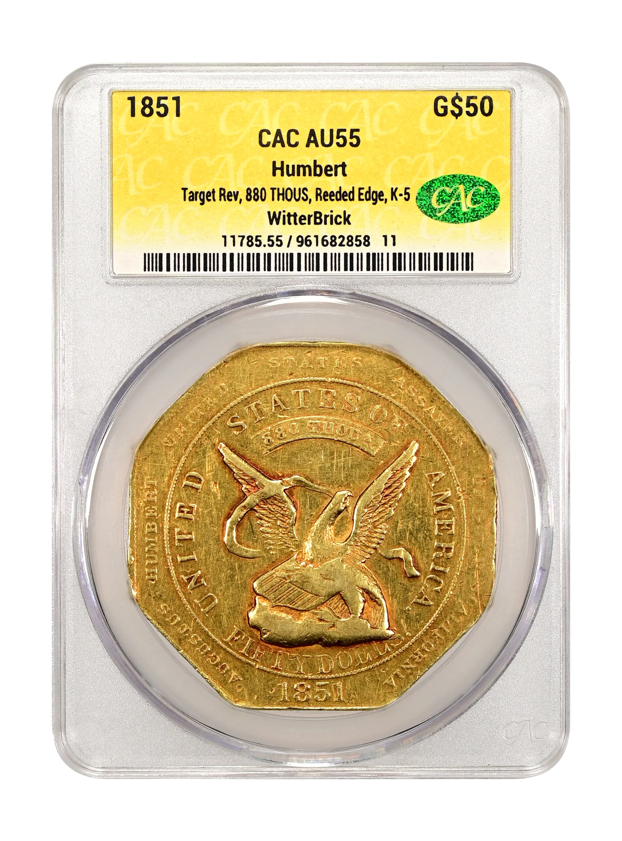 1851 $50 Humbert PCGS/CAC AU55 (Reeded Edge, 880 Thous)