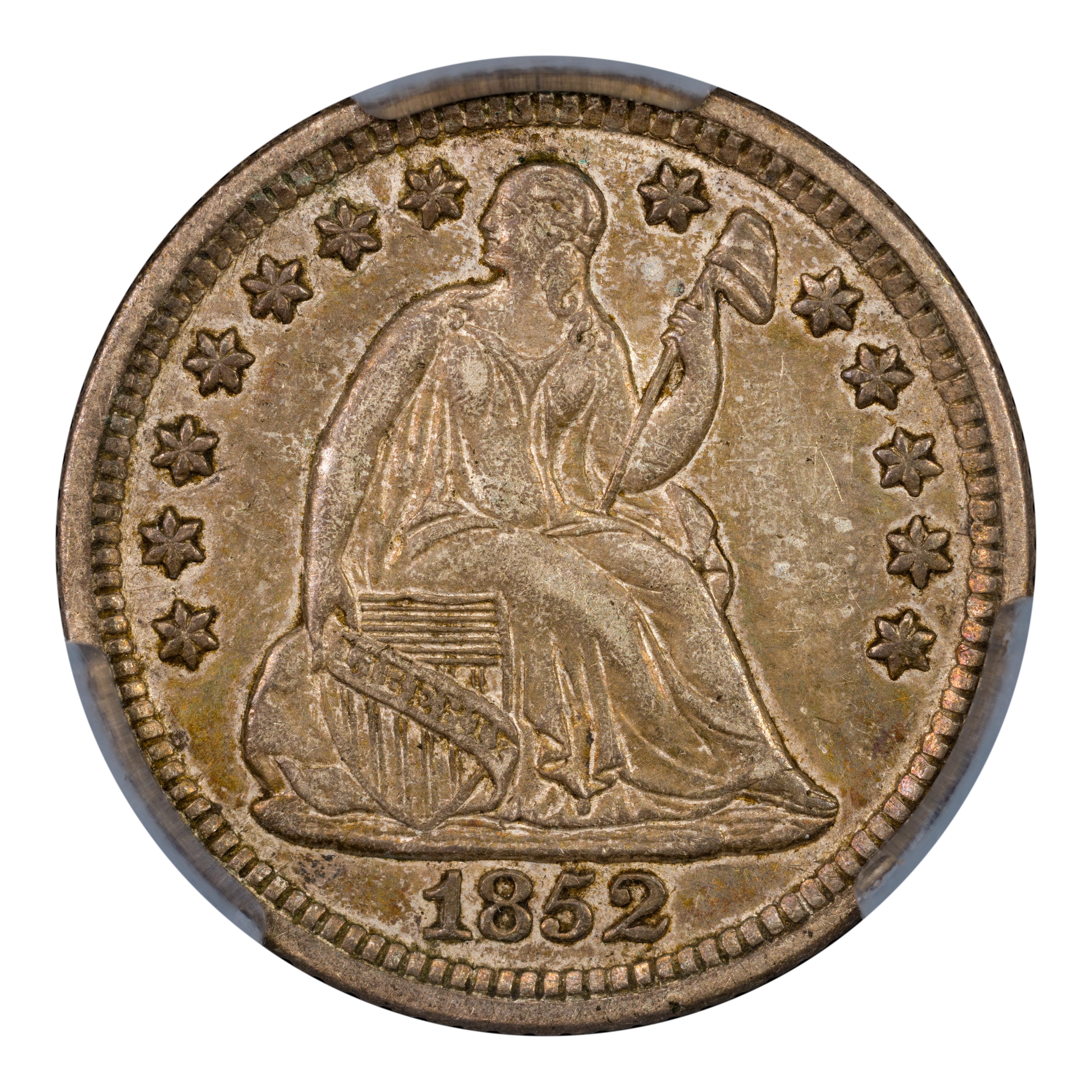 Reverse: The words HALF DIME are centered and surrounded by a wreath tied by ribbon and bow at the bottom with UNITED STATES OF AMERICA around the periphery. Mint mark, if any, appears at bottom center under the bow.