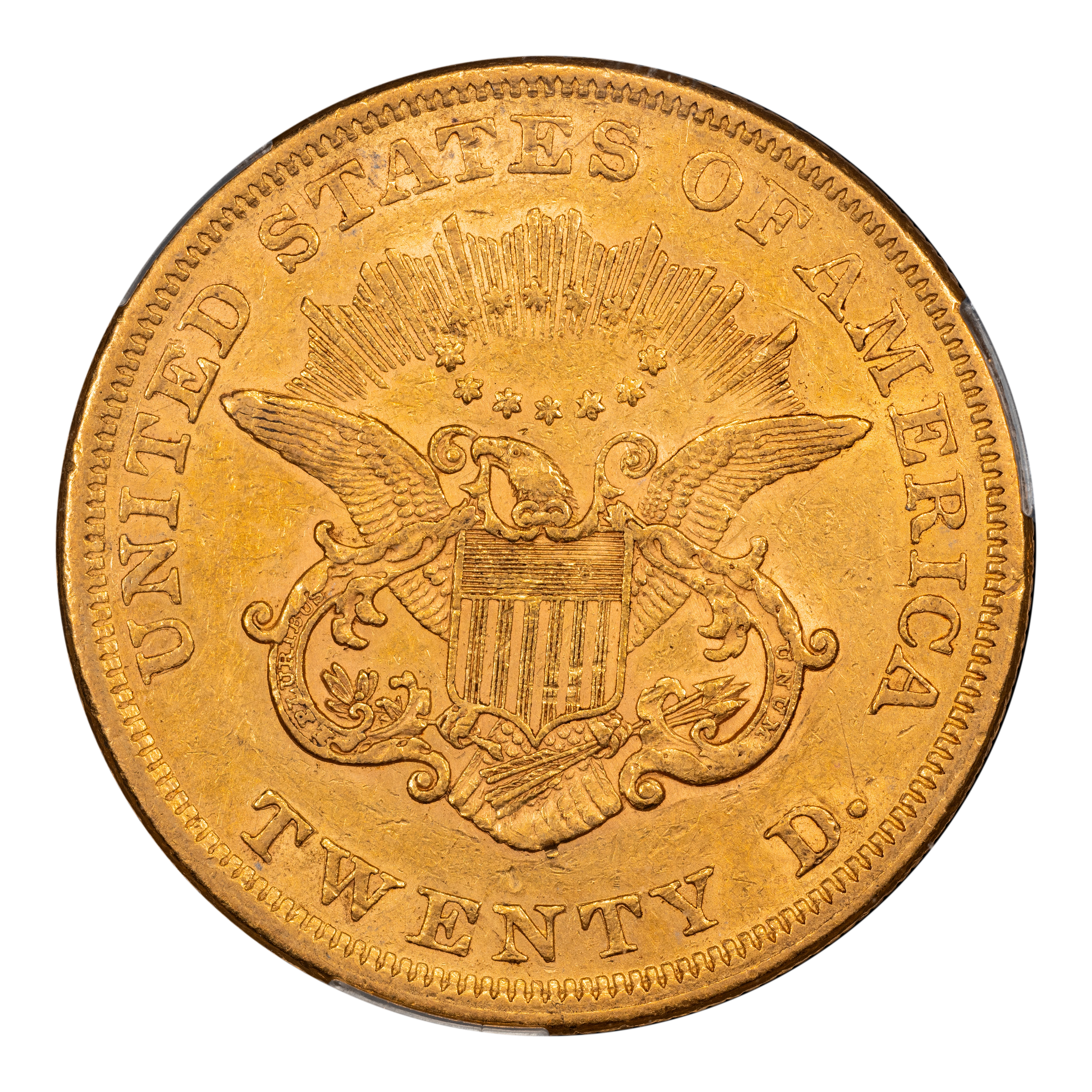 Reverse: Shielded eagle with wings outstretched holding arrows and olive branches. The words UNITED STATES OF AMERICA * TWENTY D. appear around the periphery. Mint mark, if any, appears below the eagle's tail, above the N in TWENTY.