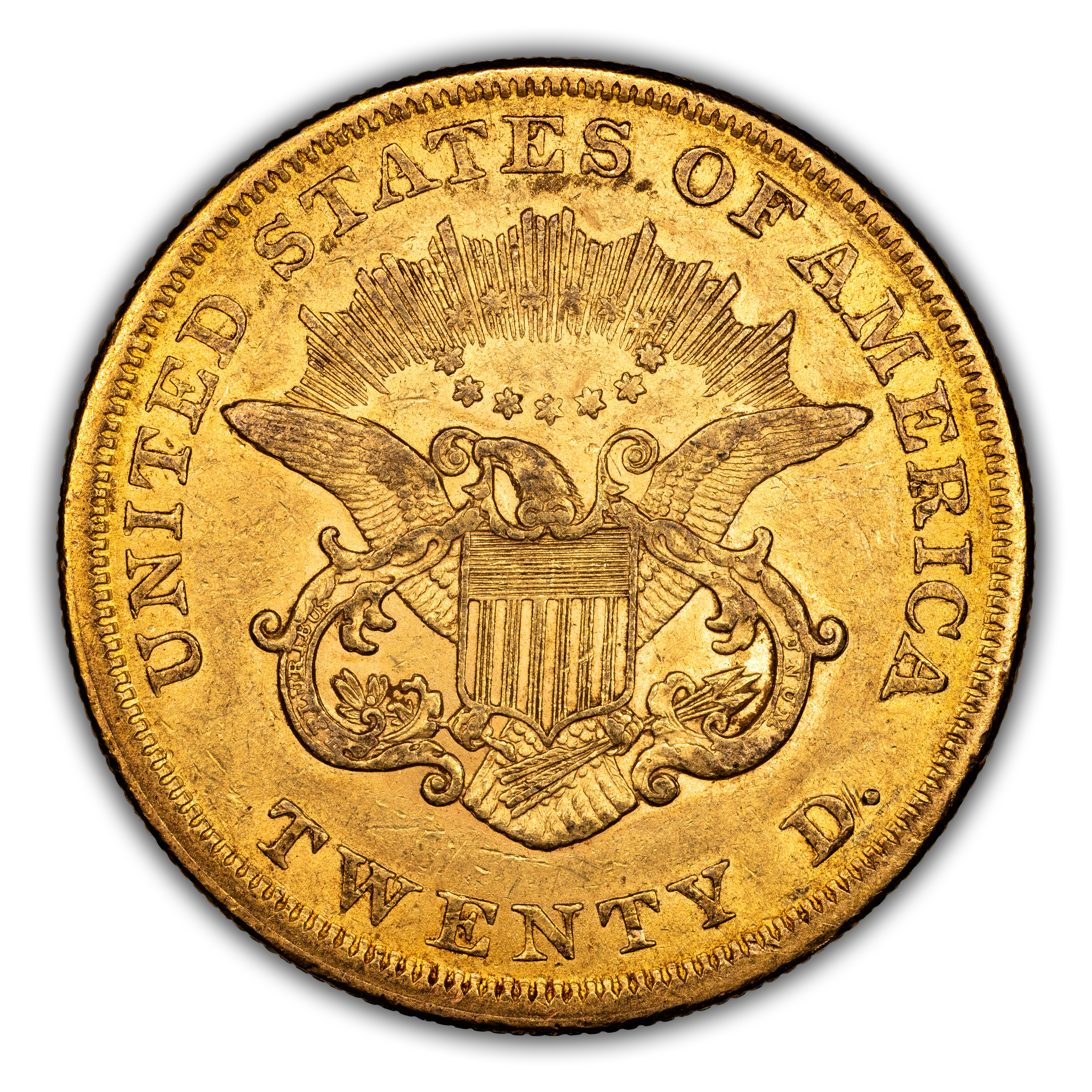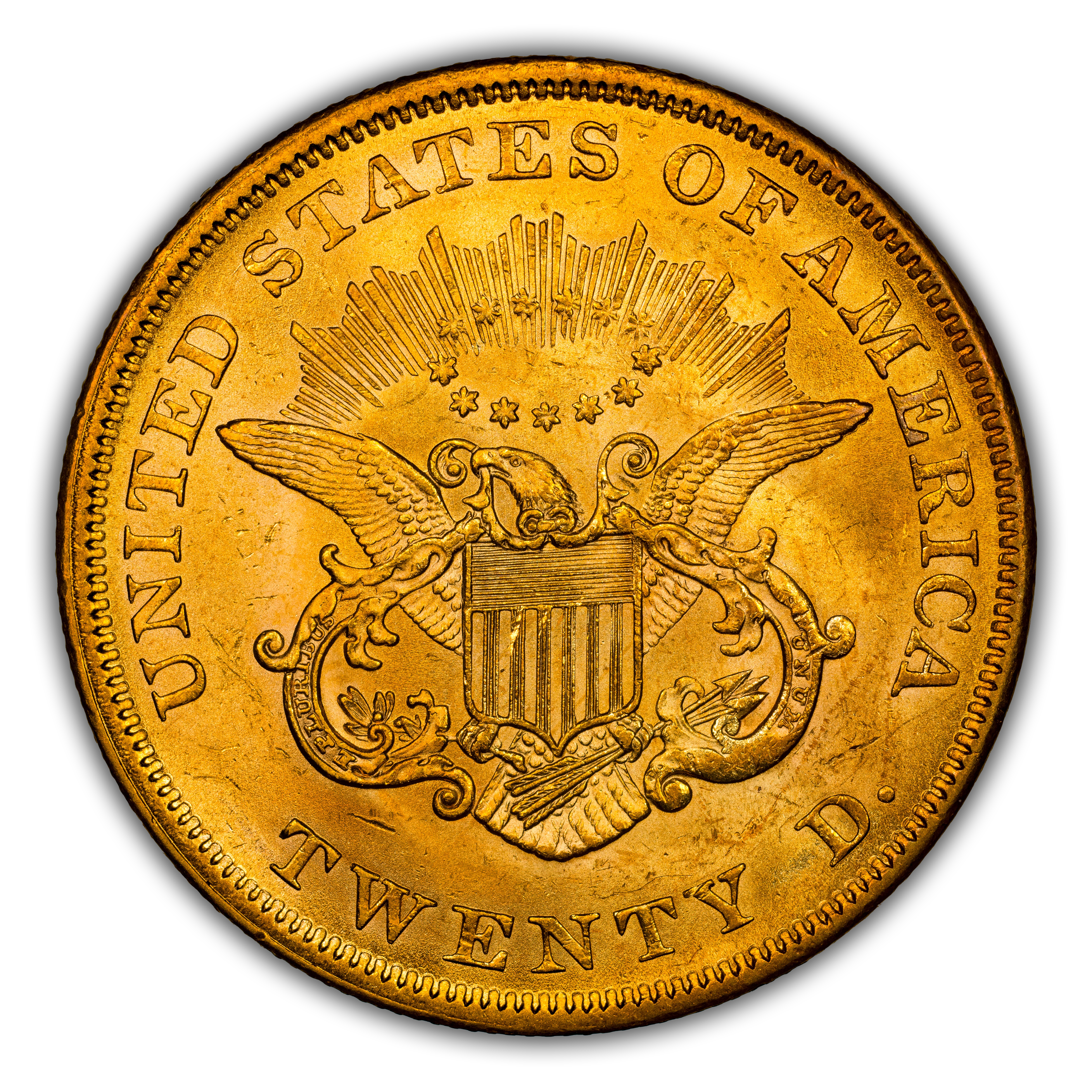 Reverse: Shielded eagle with wings outstretched holding arrows and olive branches. The words UNITED STATES OF AMERICA * TWENTY D. appear around the periphery. Mint mark, if any, appears below the eagle's tail, above the N in TWENTY.