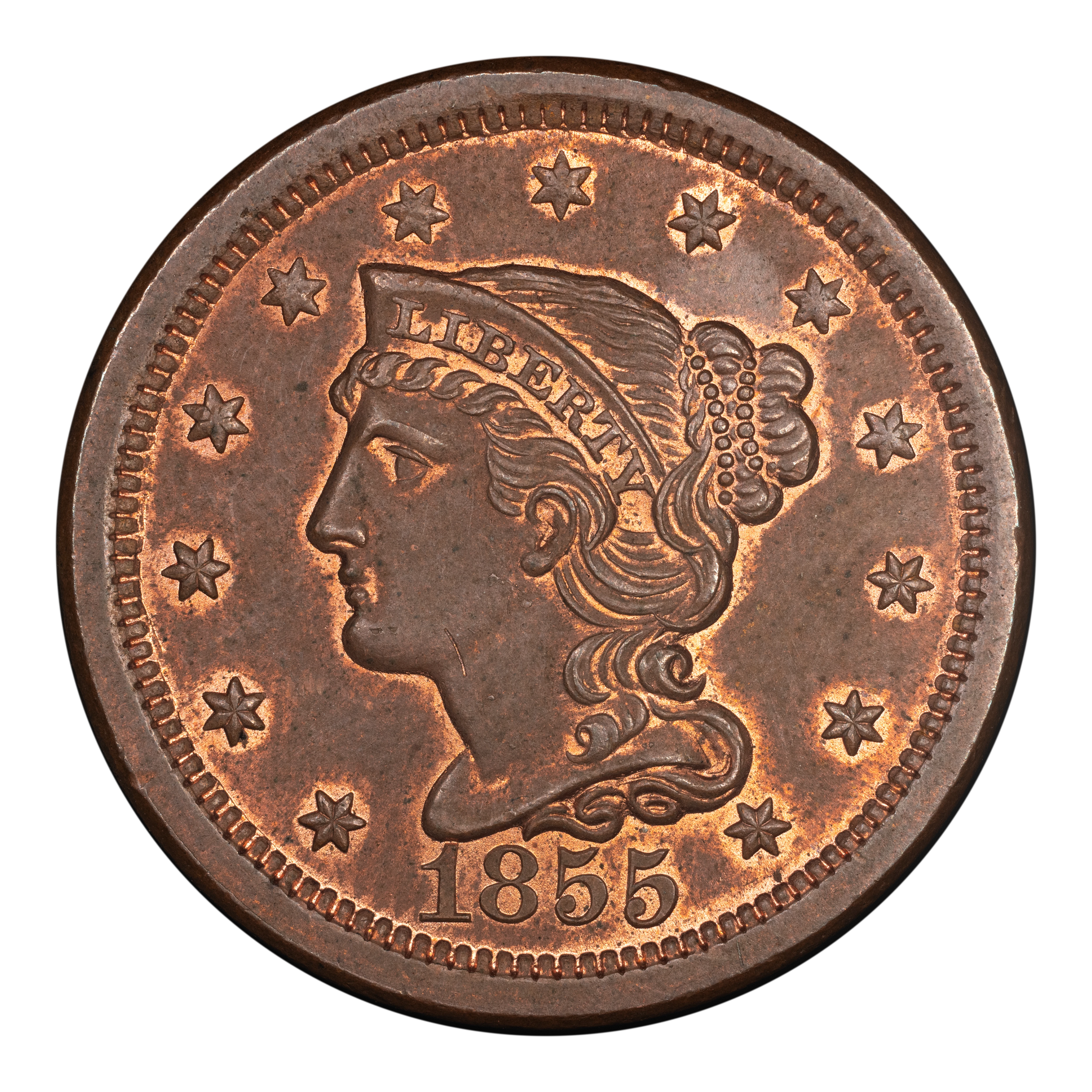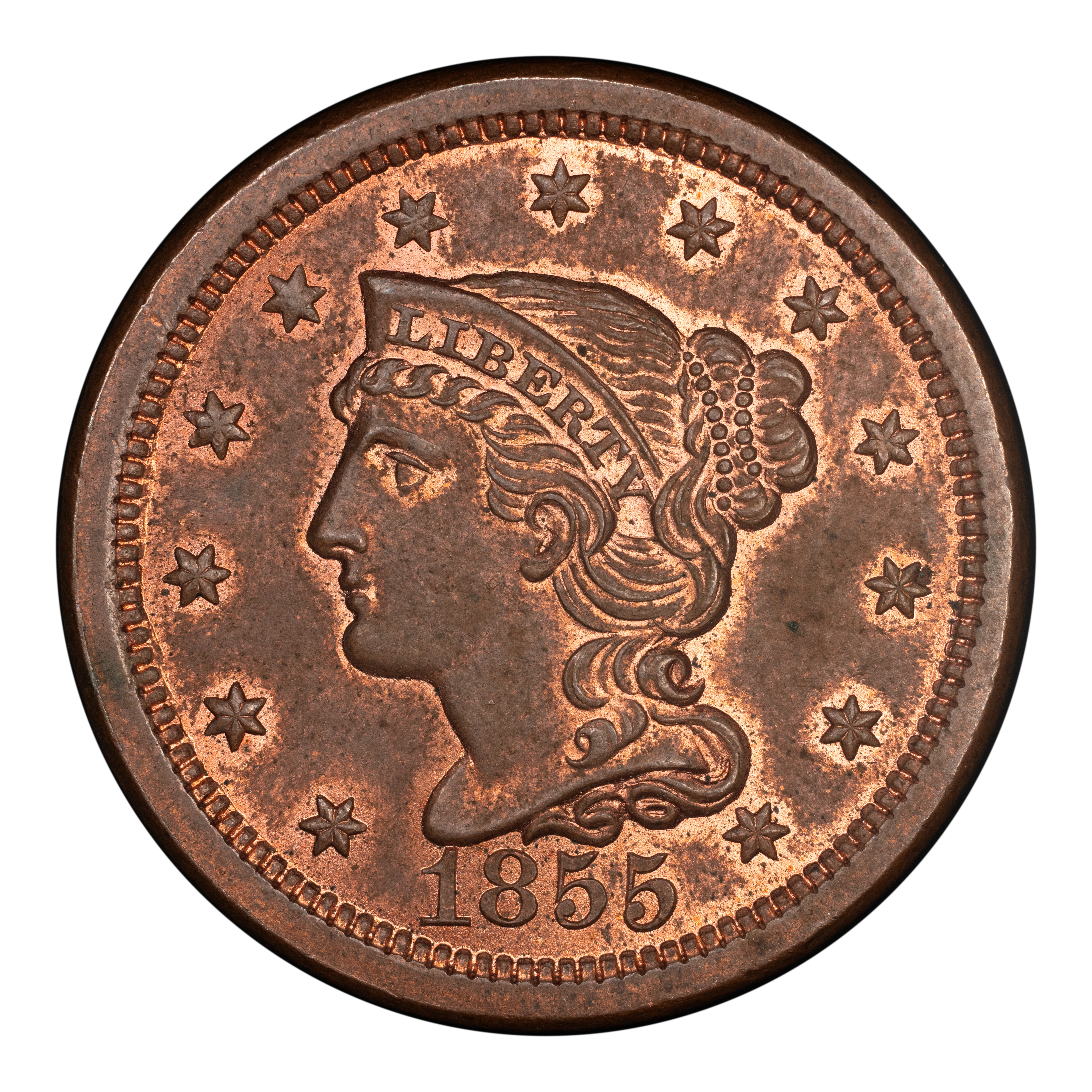 1855 1C Upright 55, N-4, R.1, MS65 Red and Brown PCGS. CAC. CAC Population: (32/2). Mintage 1,574,829....