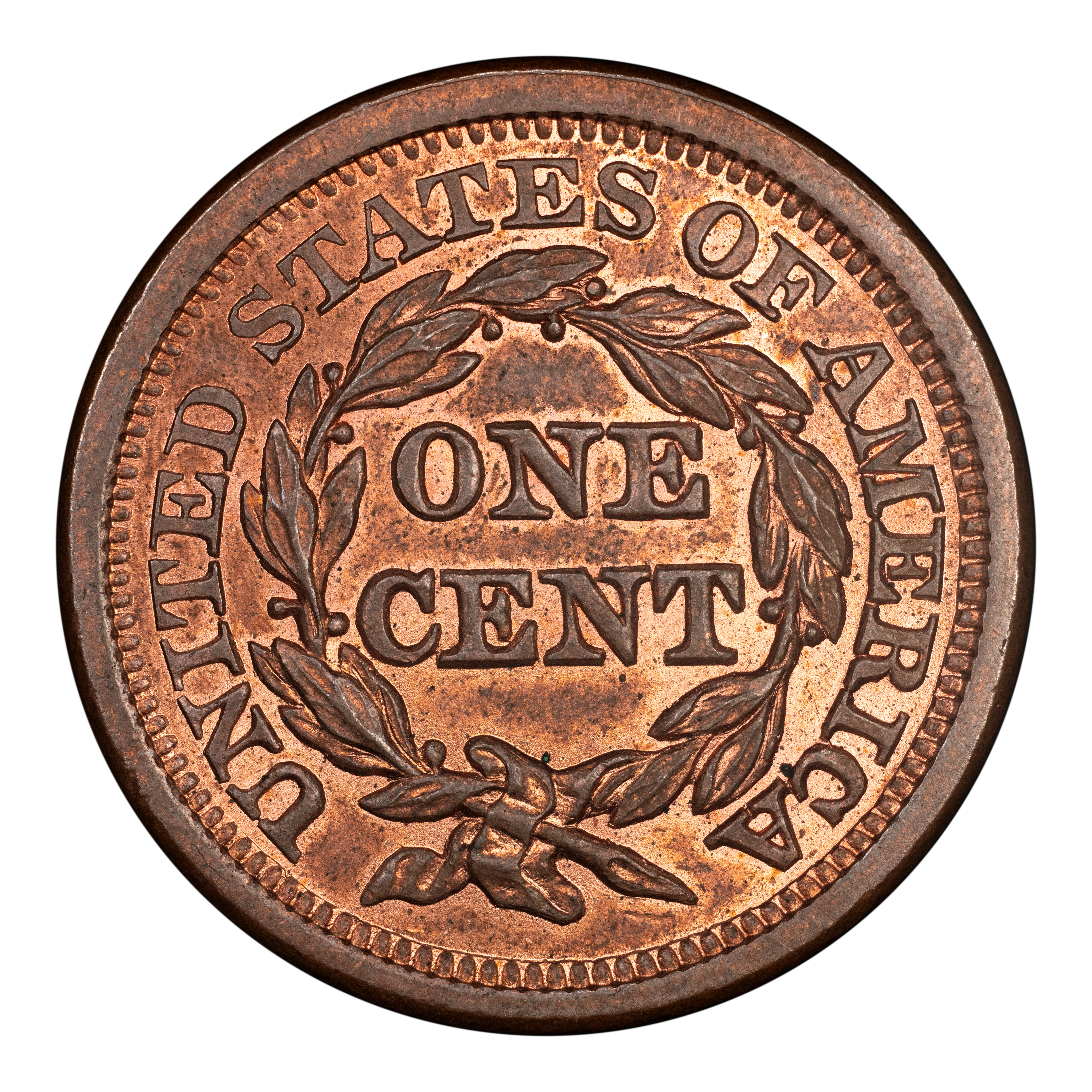 Reverse: The words UNITED STATES OF AMERICA around the periphery surround a wreath framing the words ONE CENT. The wreath is tied by a bow at the bottom.