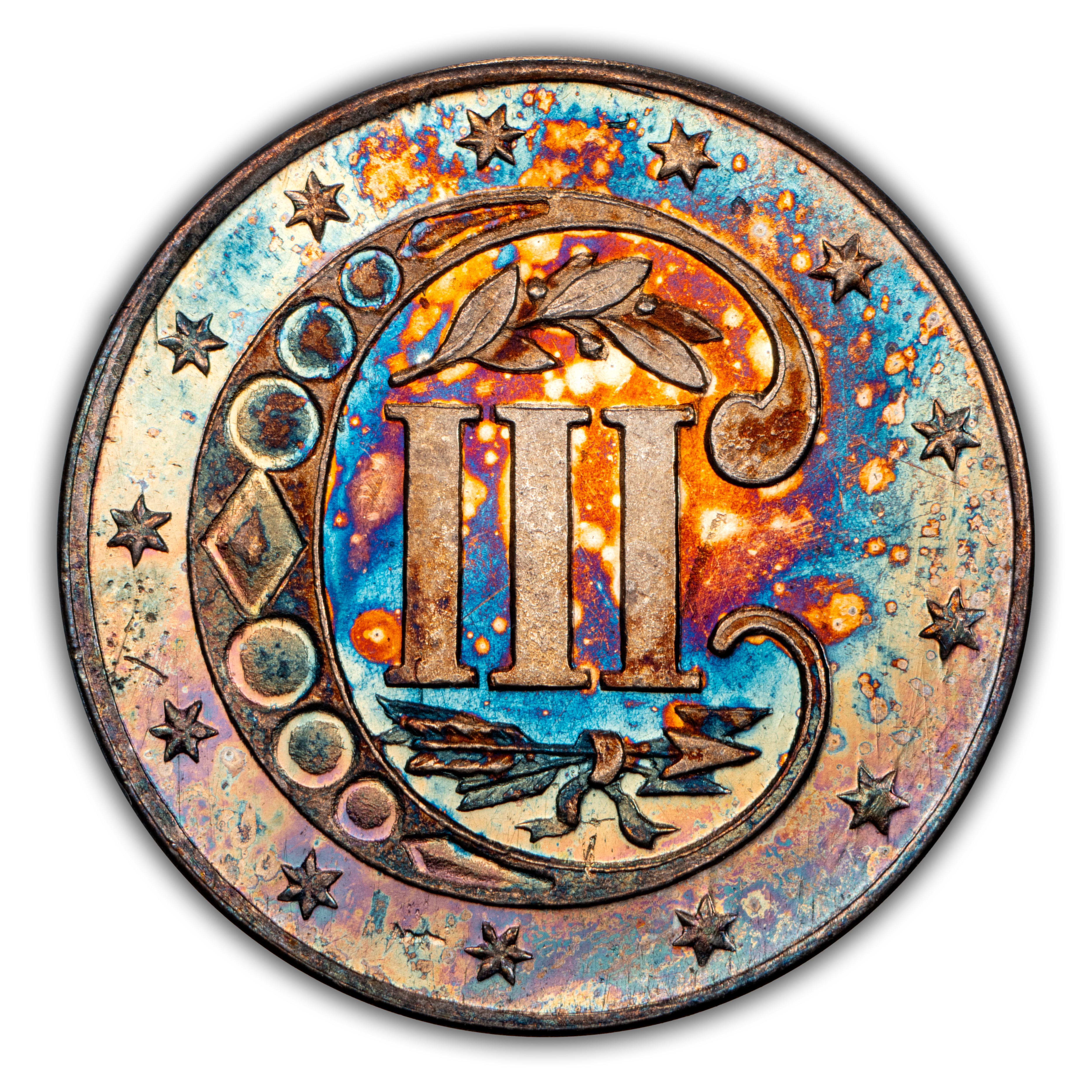 The 1855 Proof Three Cent Silver is a very desirable rarity in the series with a mintage of just 50 coins. Rare from MS60 through MS63. MS64 is very rare with gems being extreme rarities. Cameo pieces are extremely difficult to locate as only a handful exist. Look for attractive toners as this series has many.