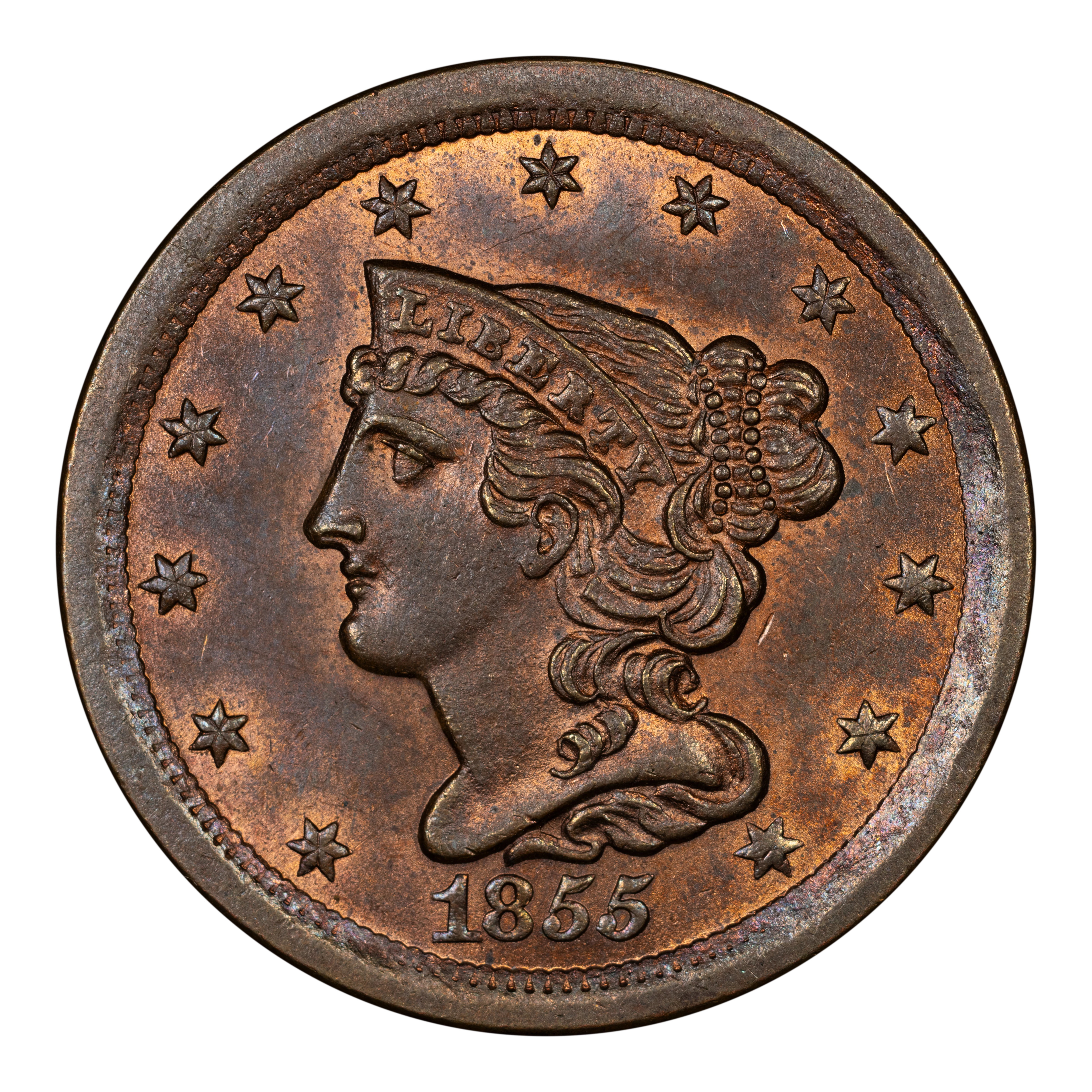 1855 1/2 C C-1, B-1, R.1, MS63 Red and Brown PCGS. Mintage 56,500....