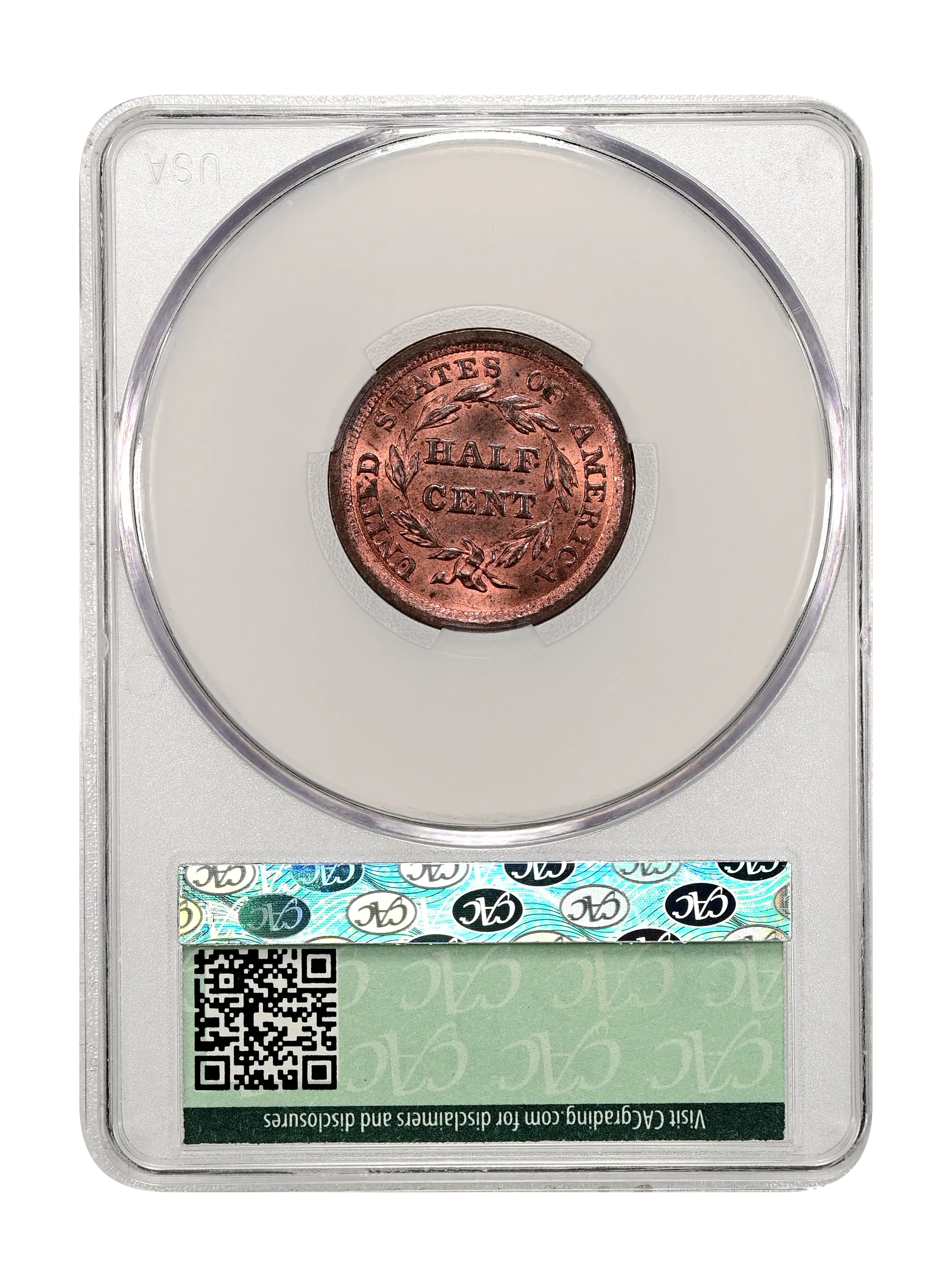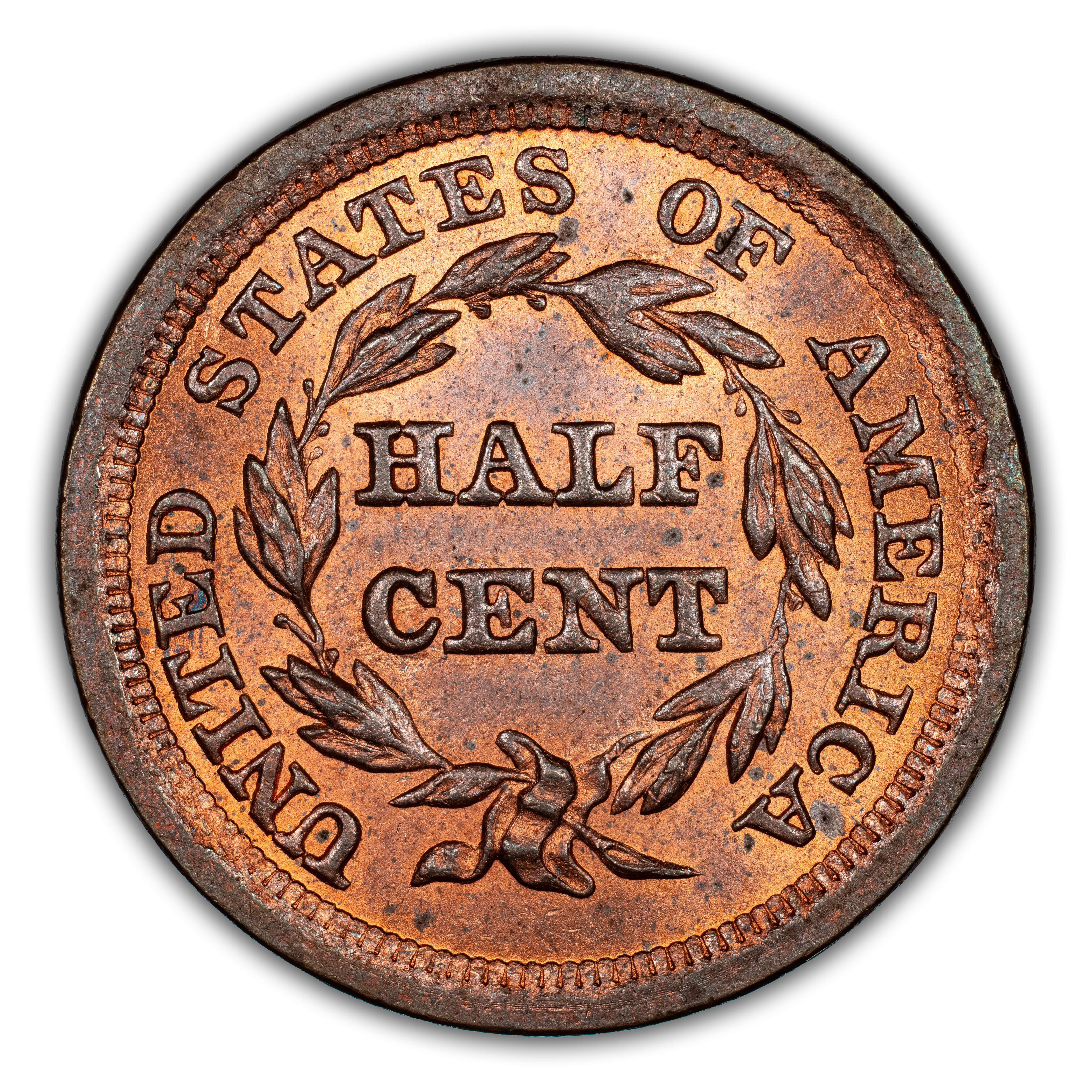 Reverse: The words UNITED STATES OF AMERICA around the periphery surround a wreath framing the words HALF CENT. The wreath is tied by a bow at the bottom.