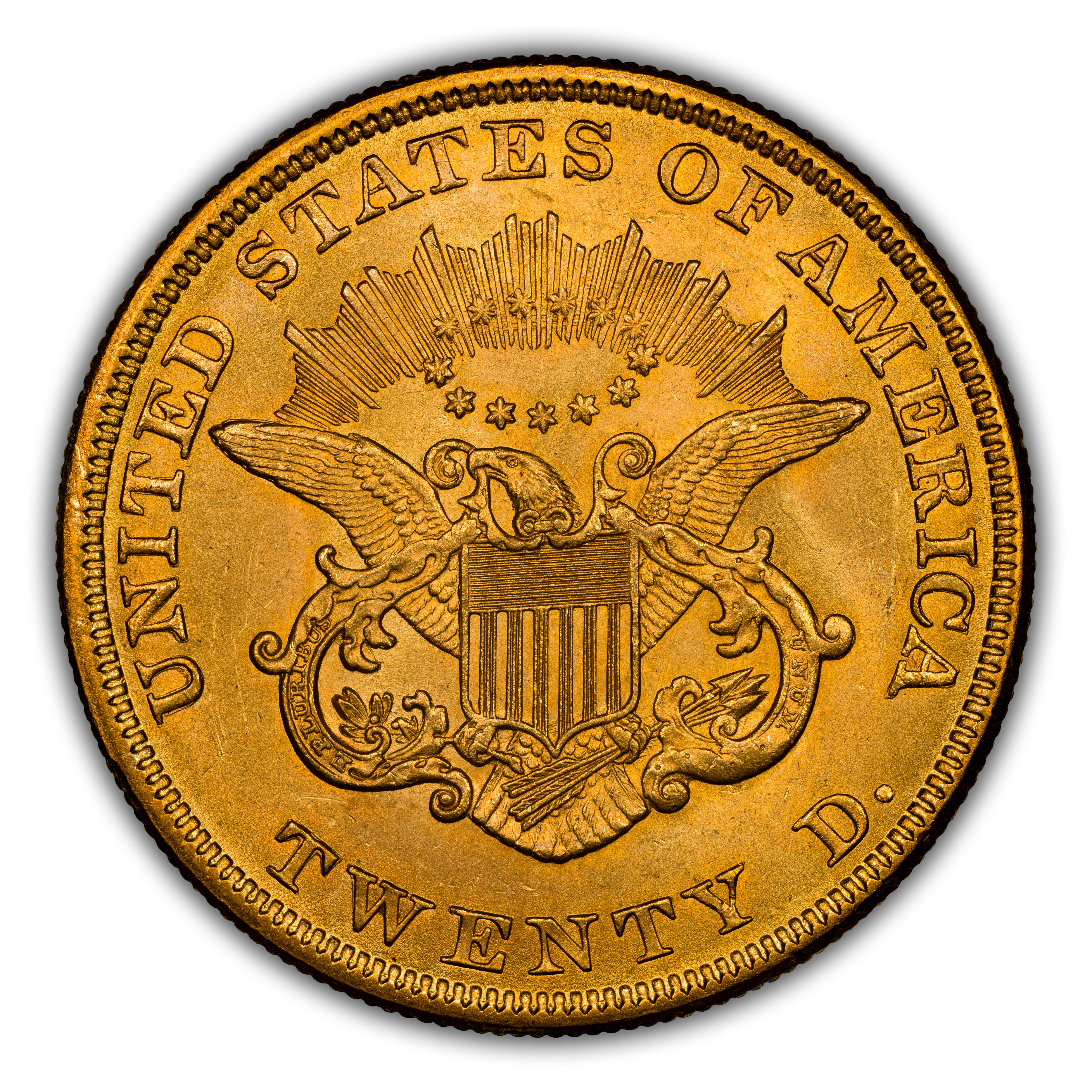 Reverse: Shielded eagle with wings outstretched holding arrows and olive branches. The words UNITED STATES OF AMERICA * TWENTY D. appear around the periphery. Mint mark, if any, appears below the eagle's tail, above the N in TWENTY.