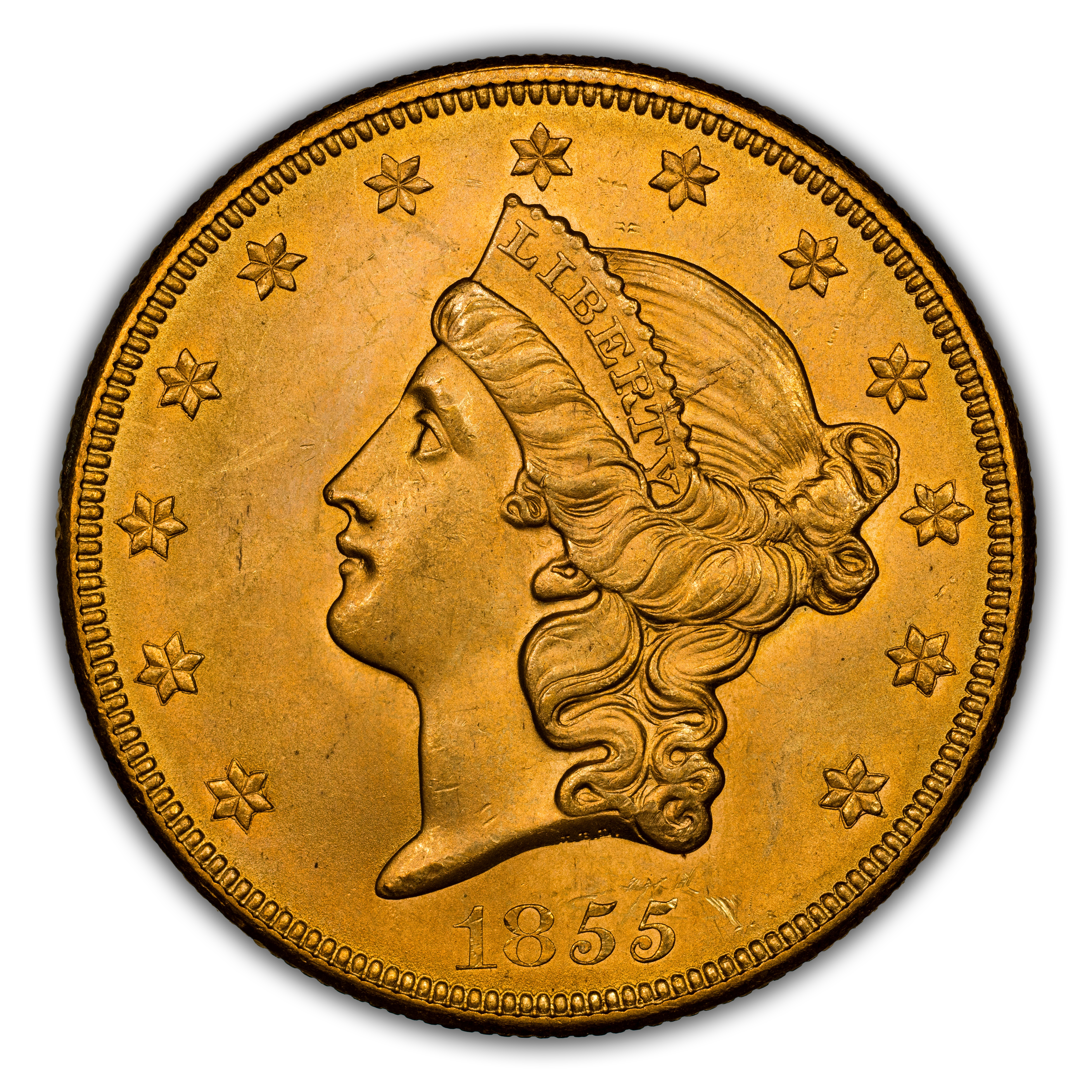 1855 $20 NGC AU55 - Desirable Type 1 Double Eagle