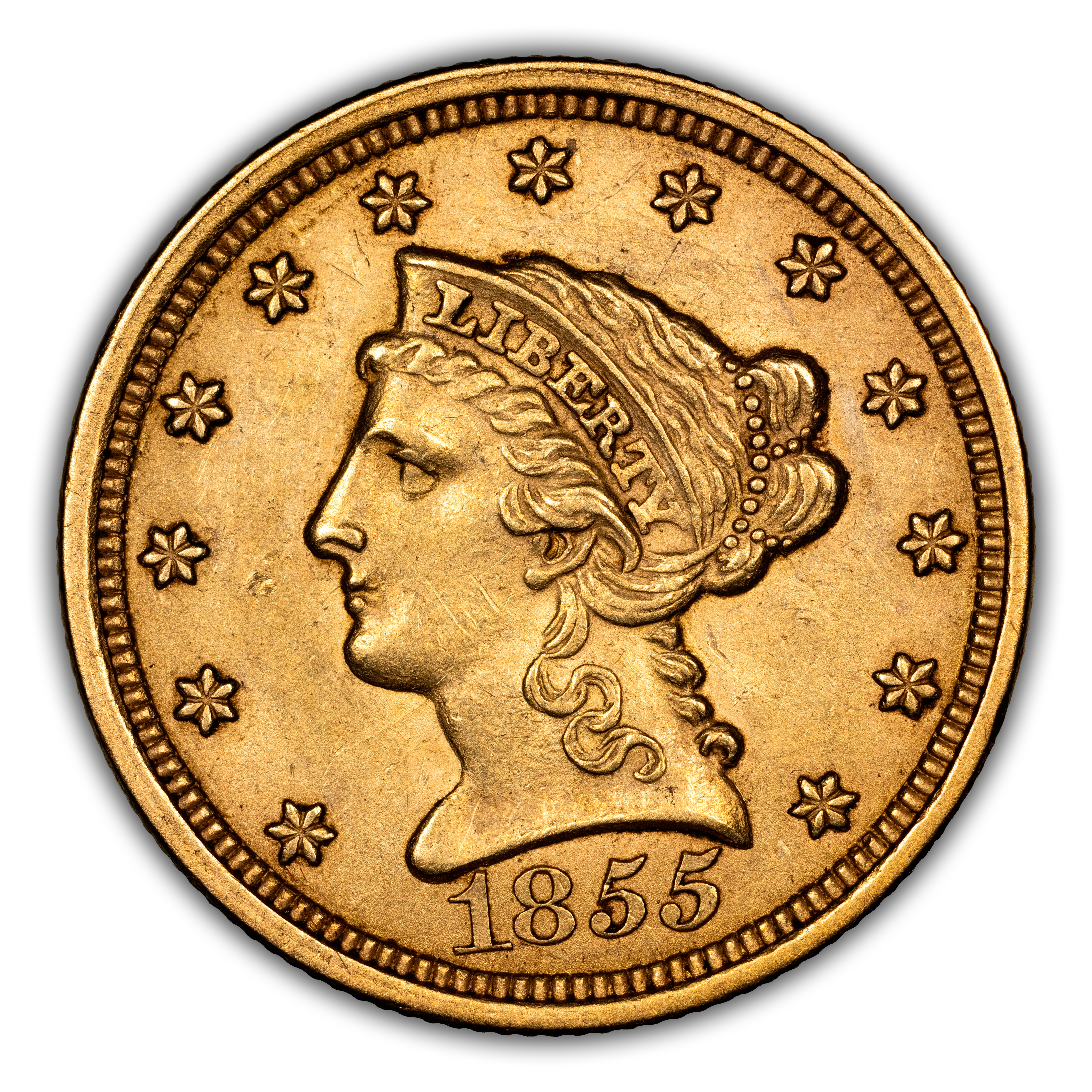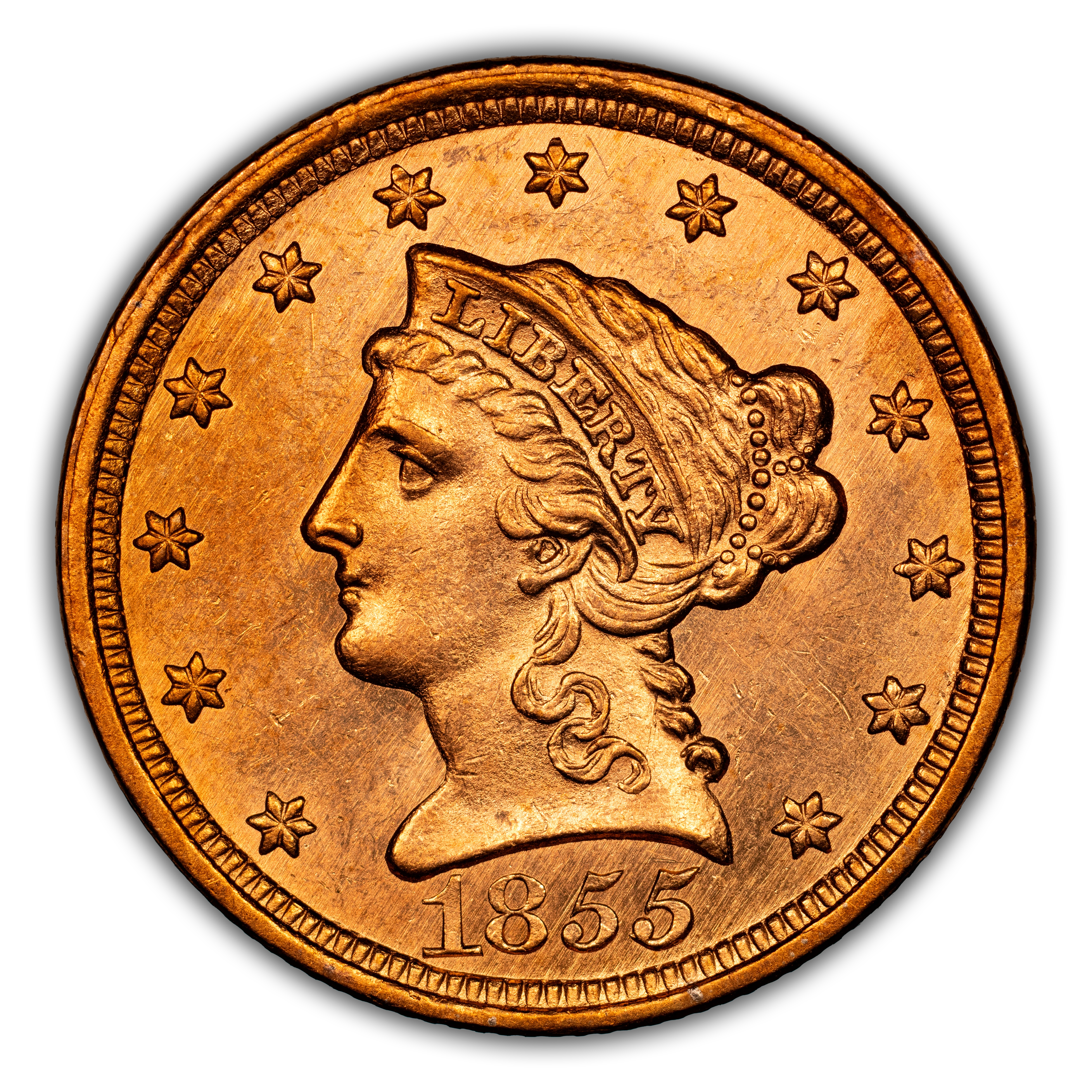 1855 $2 1/2 MS63 PCGS. PCGS Population: (34/21 and 0/4+). NGC Census: (21/20 and 1/0+). CDN: $1,600 Whsle. Bid for NGC/PCGS...