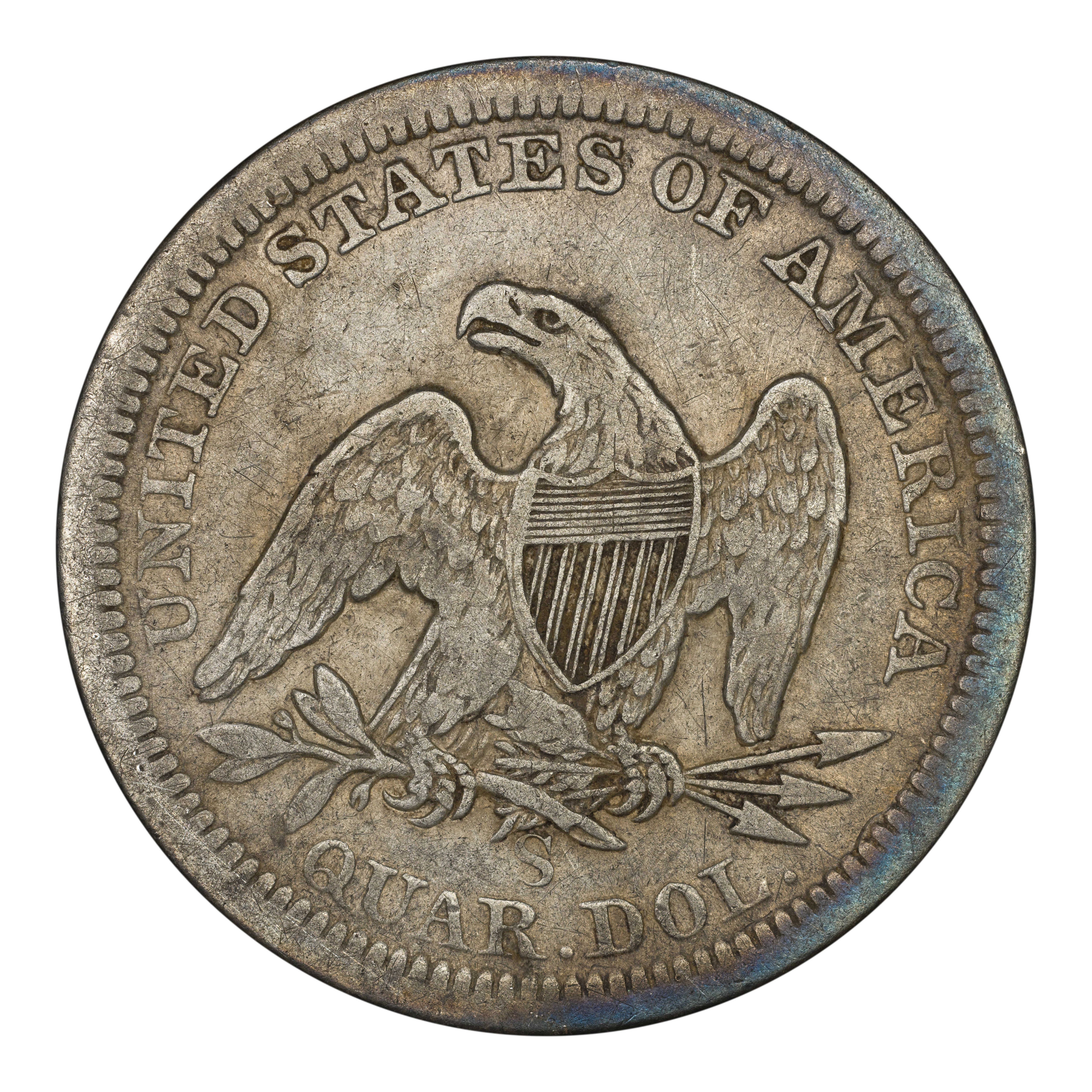Reverse: The heraldic eagle is centered in the design with the words UNITED STATES OF AMERICA and QUAR. DOL. around the periphery.