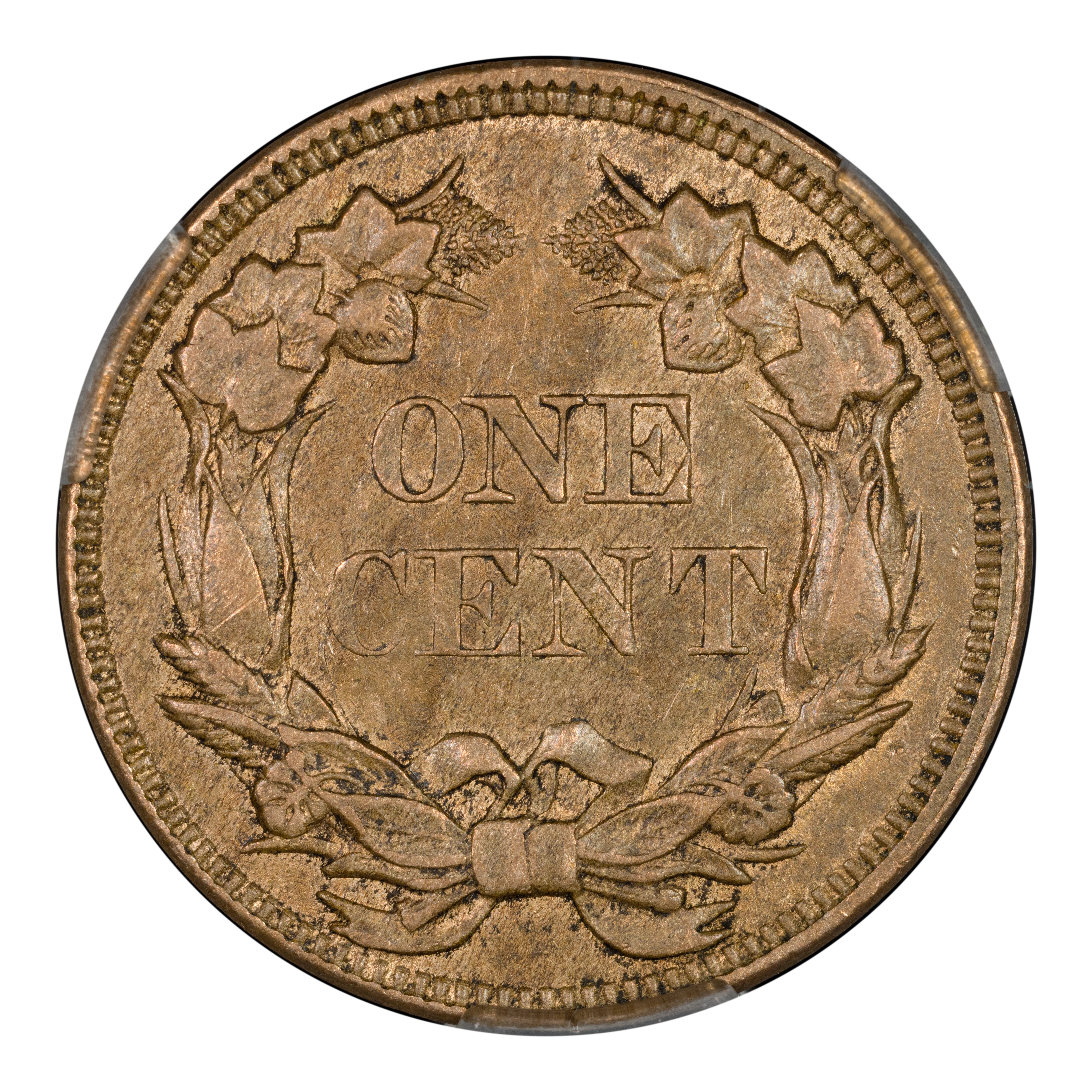 Reverse: The reverse bears the denomination of ONE CENT in the center surrounded by a wreath bearing a ribbon tied in at the bottom center.
