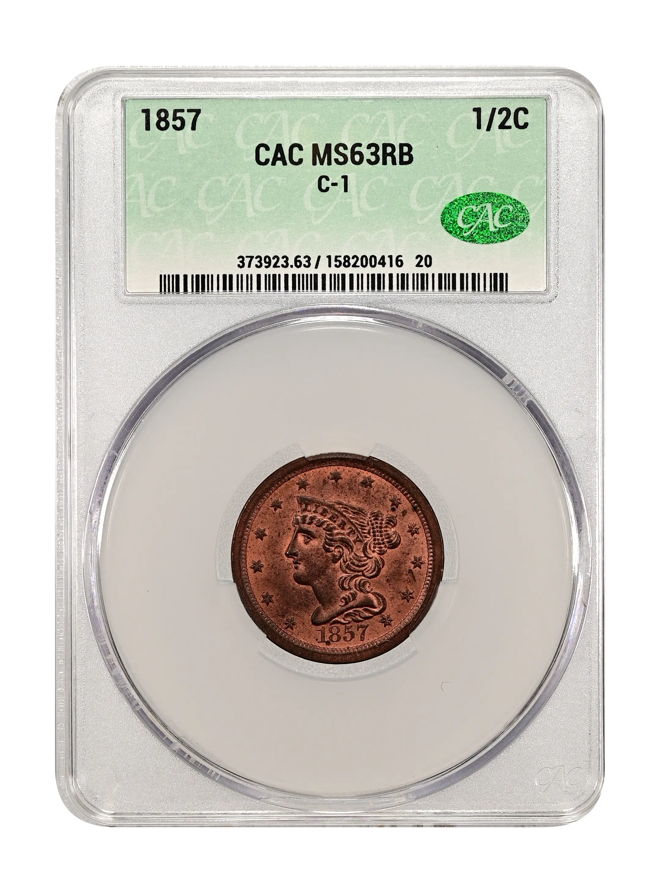 1857 1/2 C C-1, B-1, R.2, MS63 Red and Brown PCGS. PCGS Population: (99/57). Mintage 35,180....