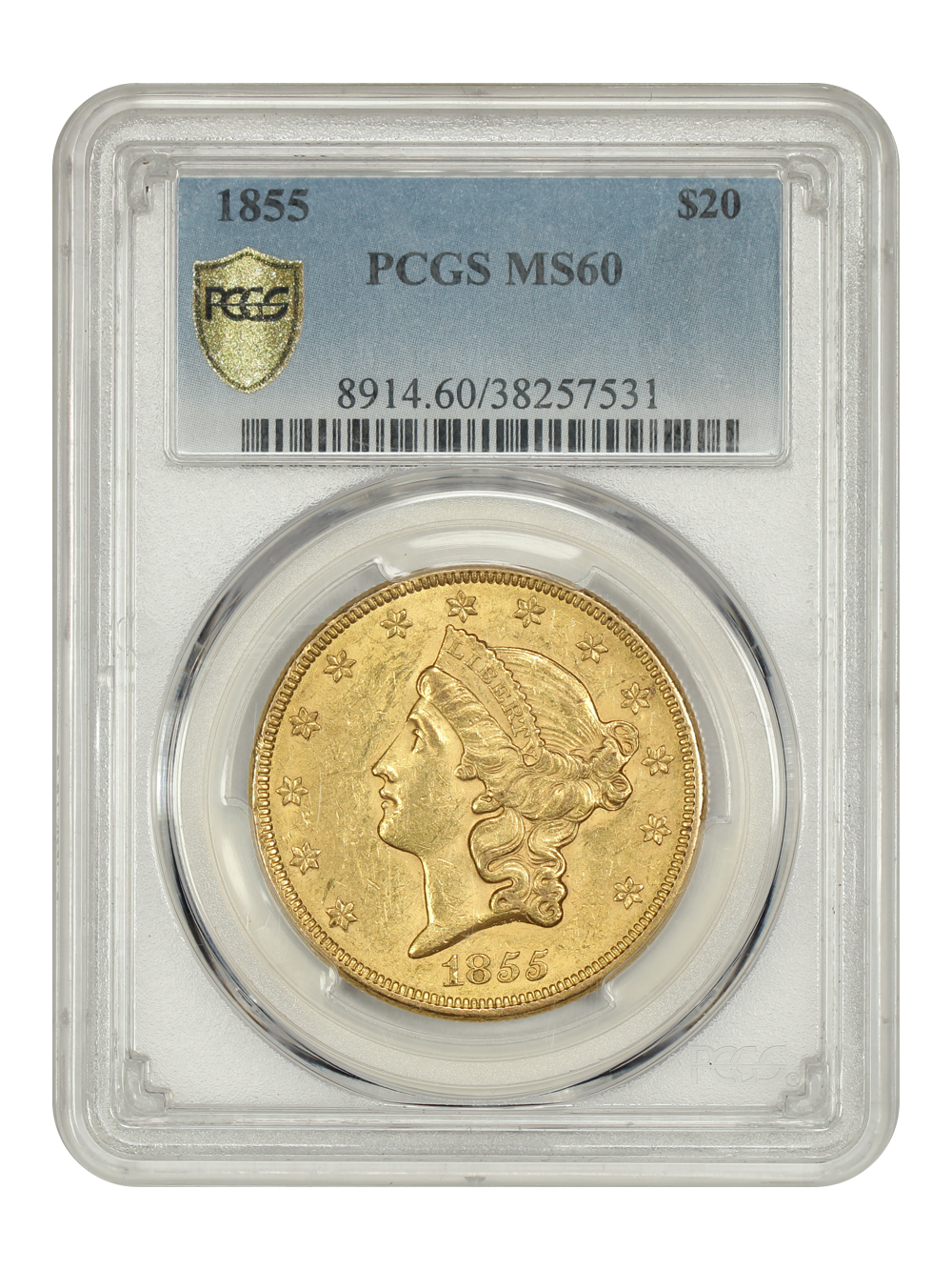 1857-S $20 Broken A, Variety 20E, MS63 PCGS....