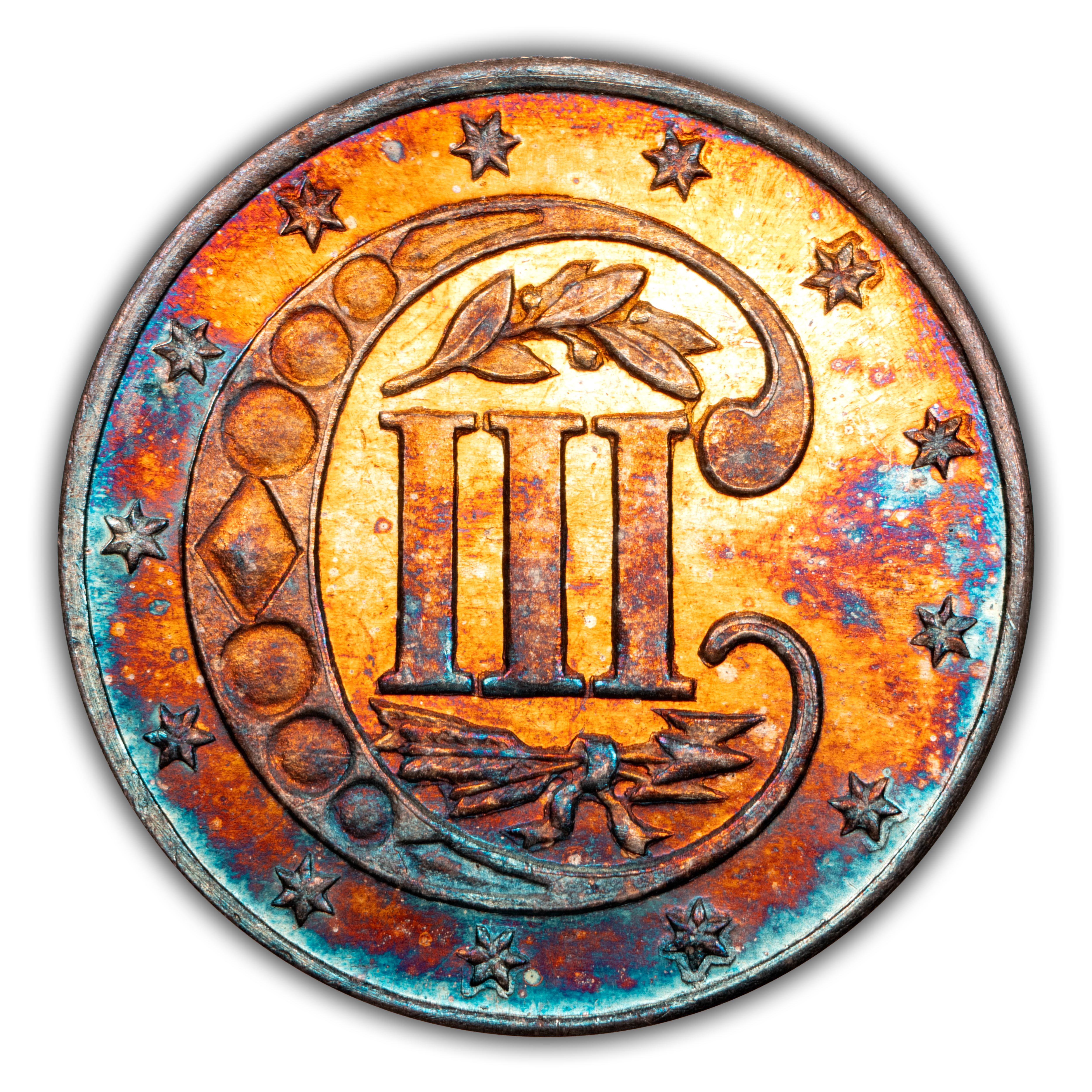 Reverse: The roman numeral III is centered in the design ensconced in a large, bejeweled letter C surrounded by 13 stars on the periphery. An olive sprig is added above the roman numerals.