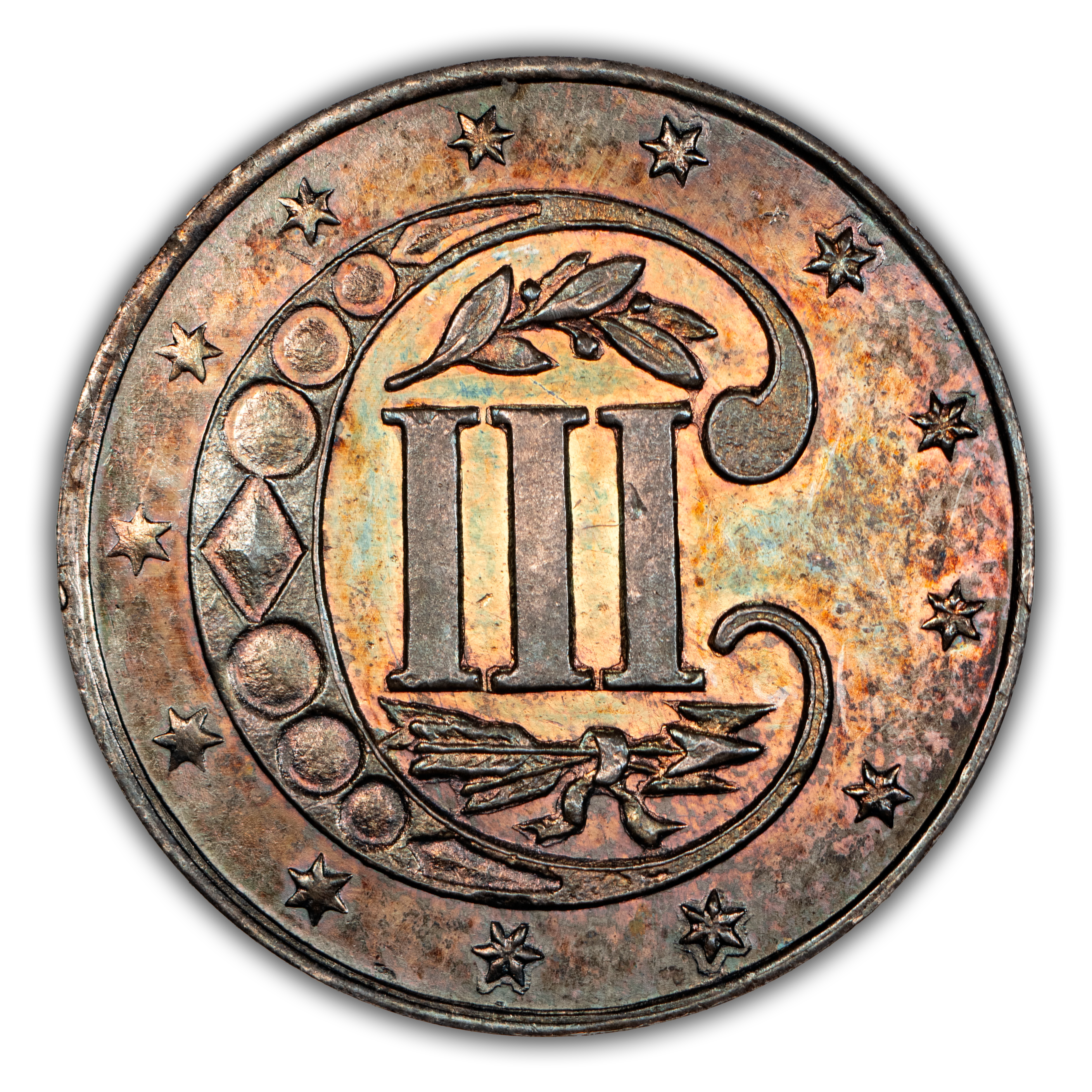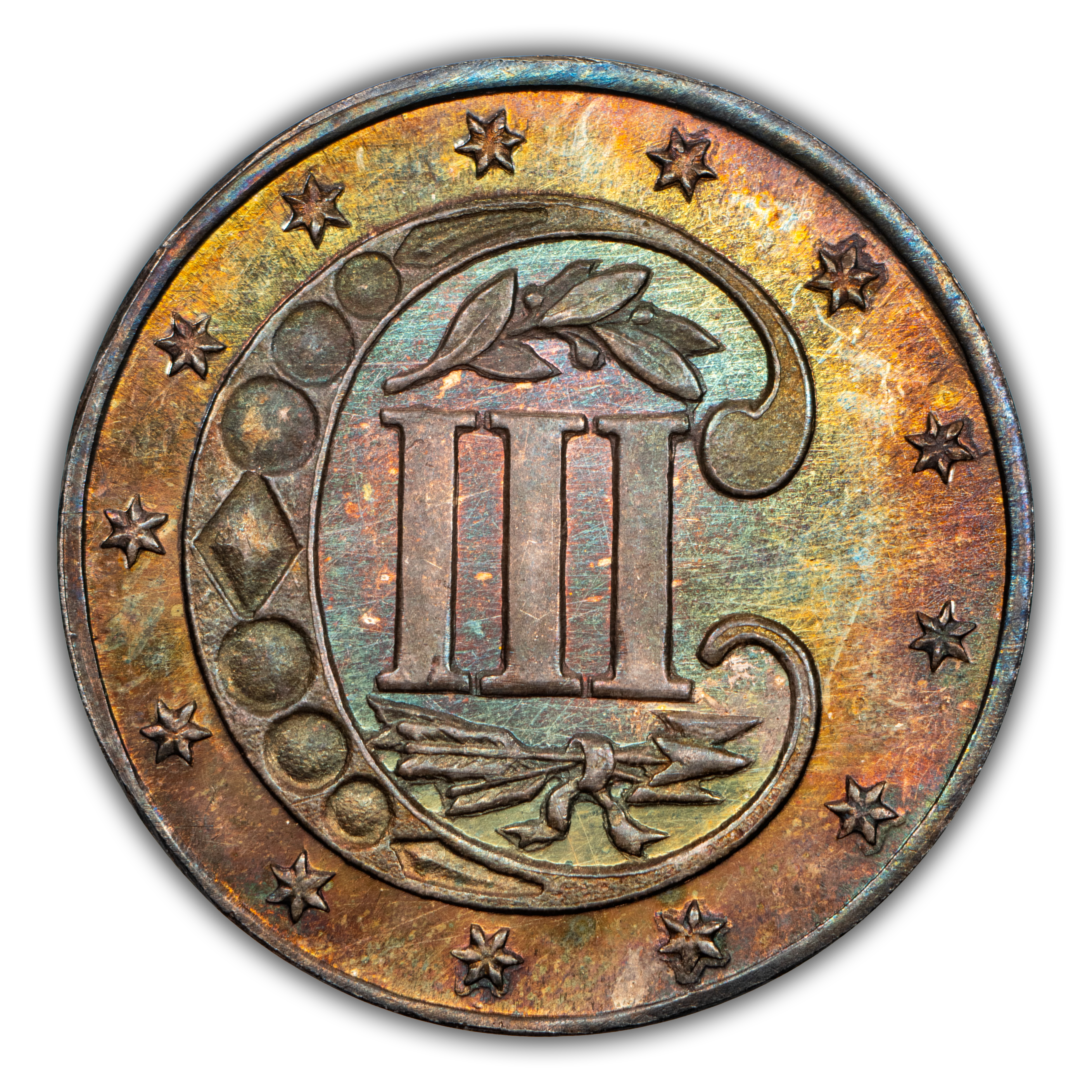Reverse: The roman numeral III is centered in the design ensconced in a large, bejeweled letter C surrounded by 13 stars on the periphery. An olive sprig is added above the roman numerals.