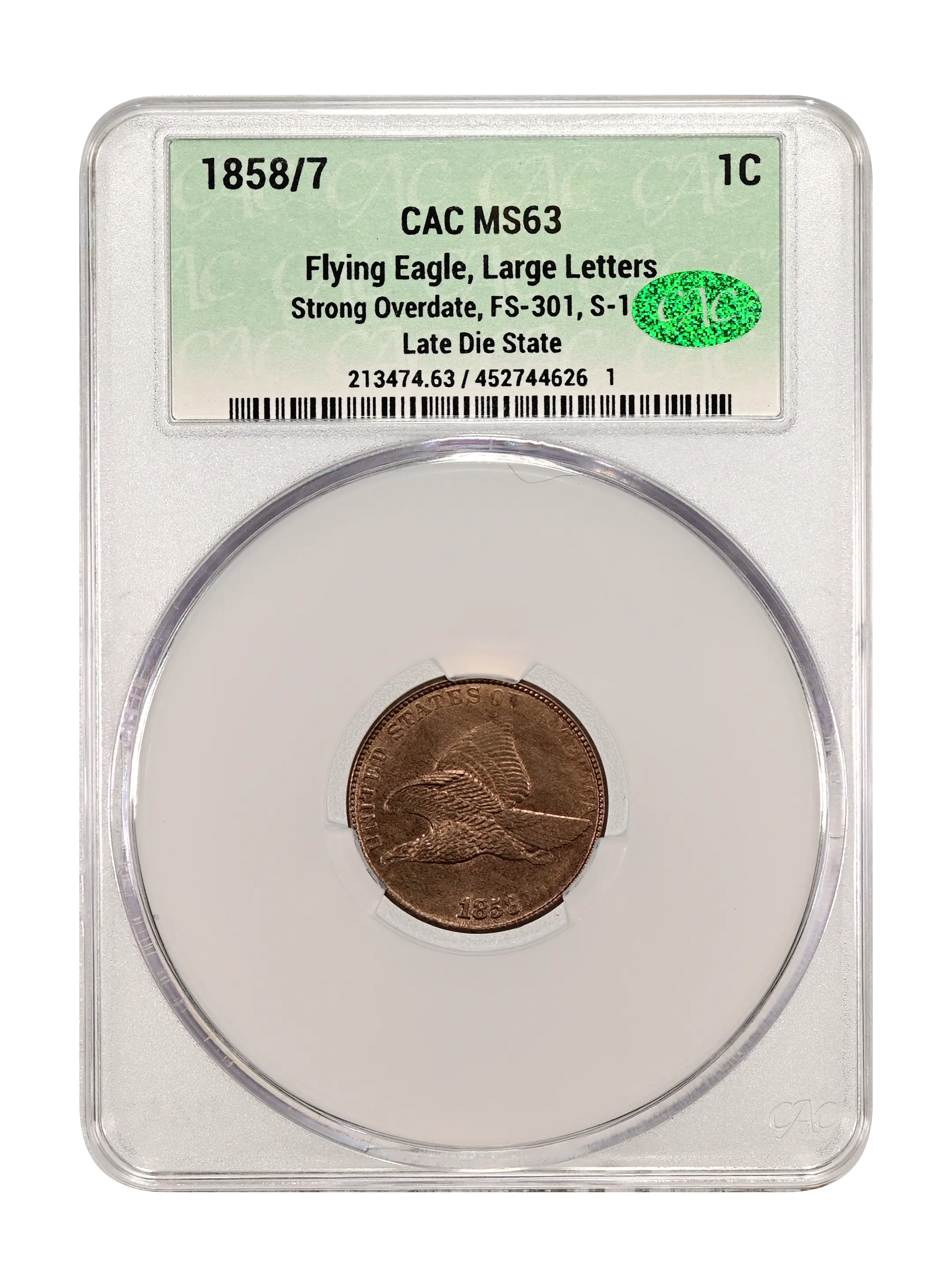 - 1858/7 1c Flying Eagle, LL, Strong Overdate, FS-301, S-1 MS