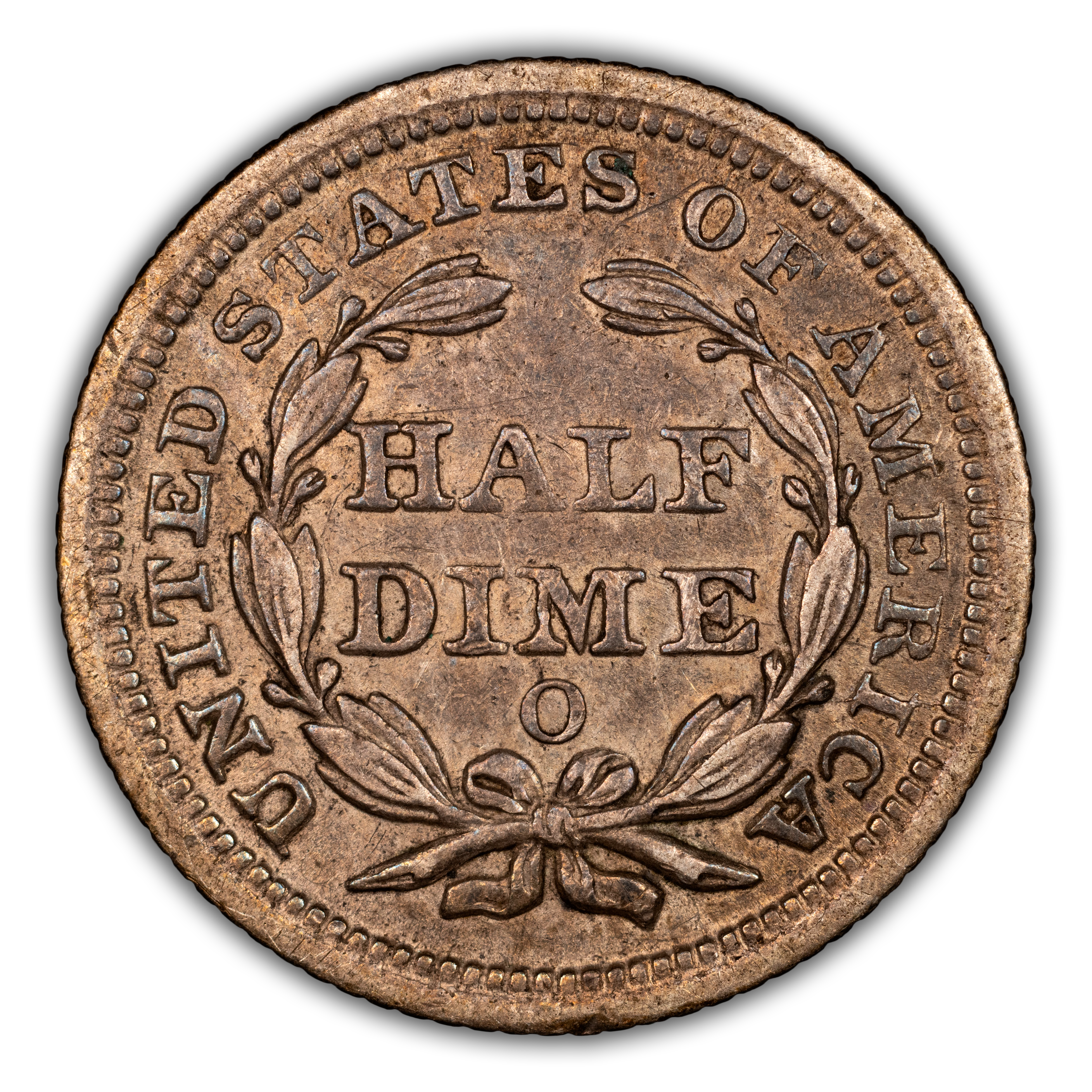 Reverse: The words HALF DIME are centered and surrounded by a wreath tied by ribbon and bow at the bottom with UNITED STATES OF AMERICA around the periphery. Mint mark, if any, appears at bottom center under the bow.