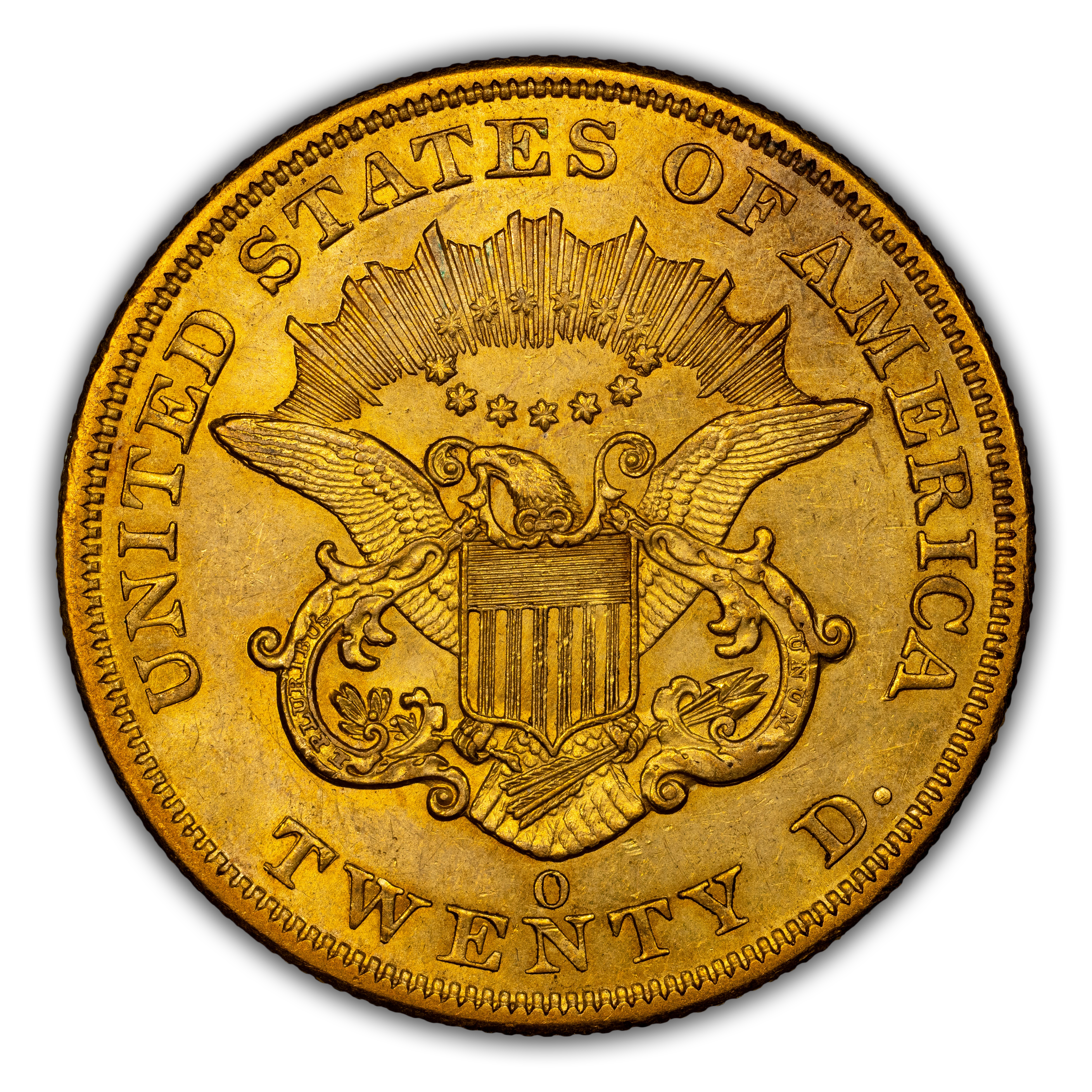 Reverse: Shielded eagle with wings outstretched holding arrows and olive branches. The words UNITED STATES OF AMERICA * TWENTY D. appear around the periphery. Mint mark, if any, appears below the eagle's tail, above the N in TWENTY.