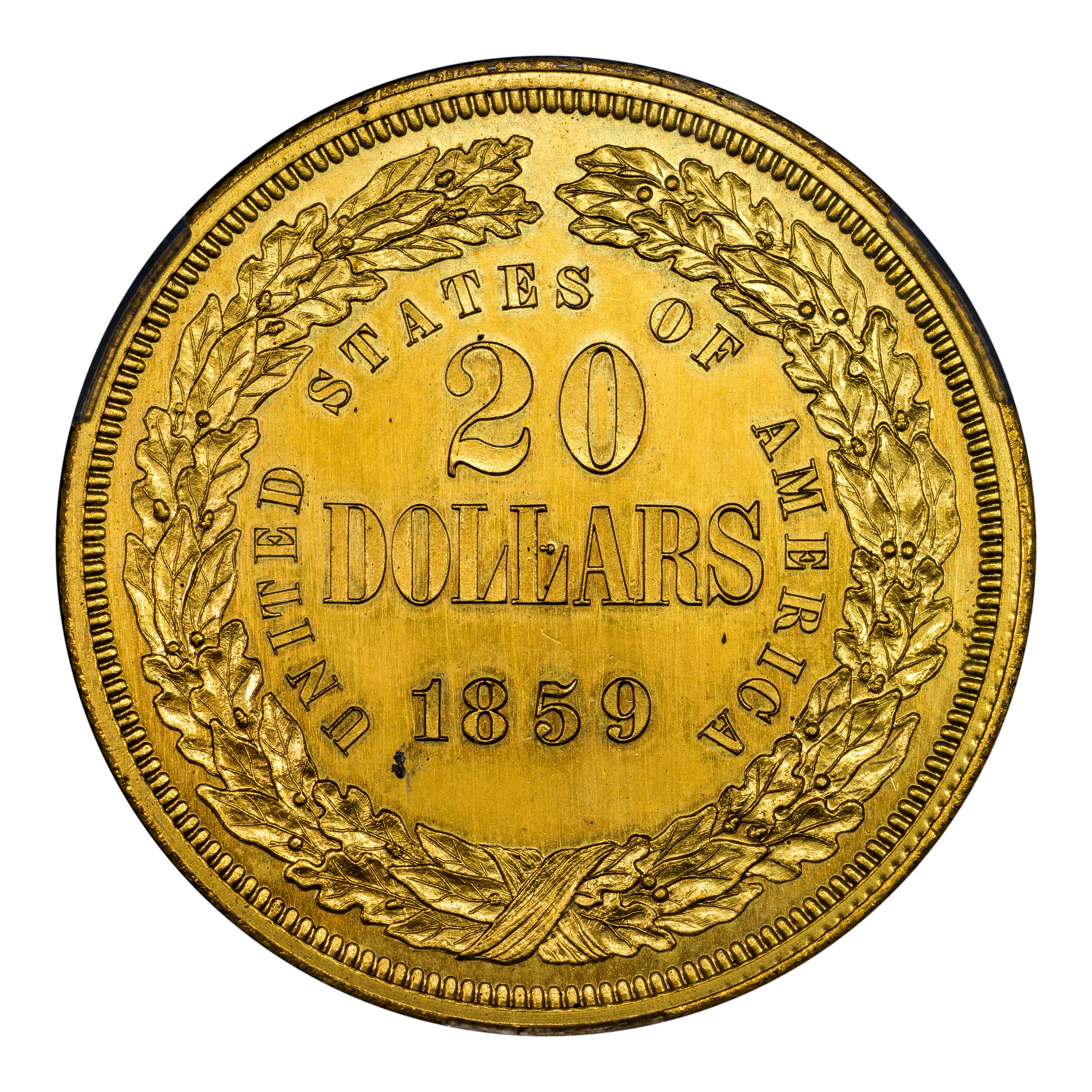 Reverse: Heavy wreath enclosing UNITED STATES OF AMERICA around inside of wreath and with 20 DOLLARS 1859 at the center.